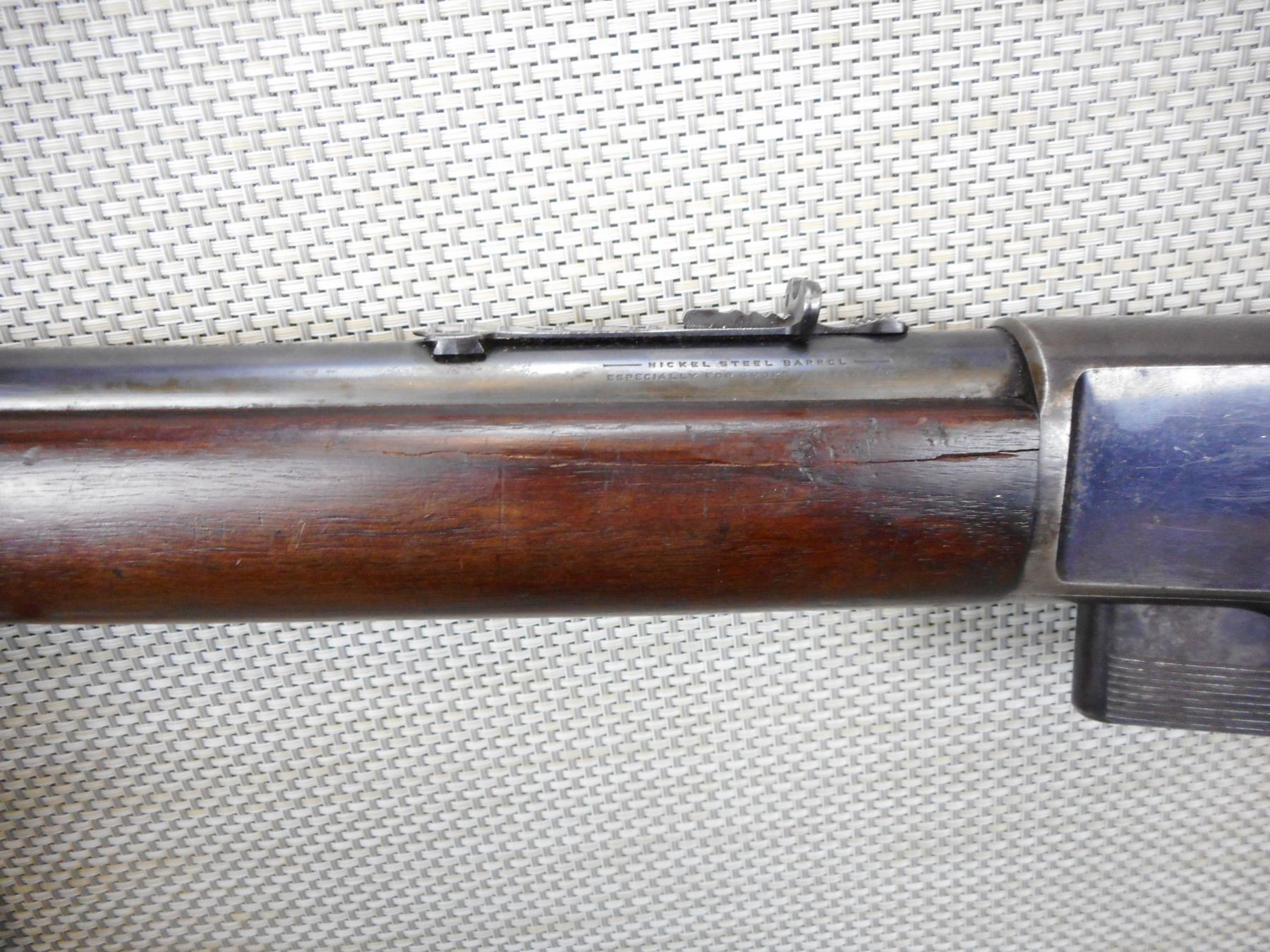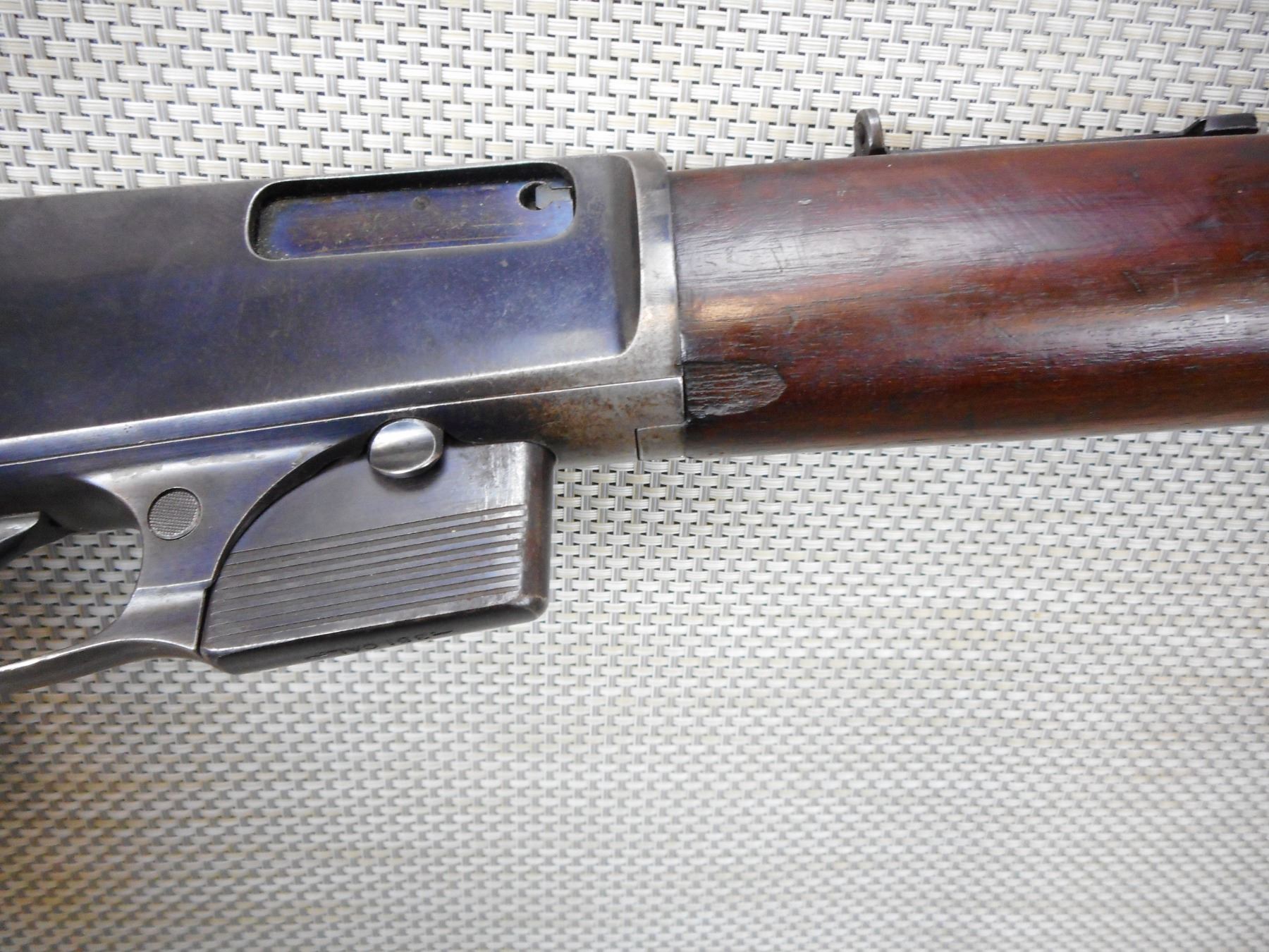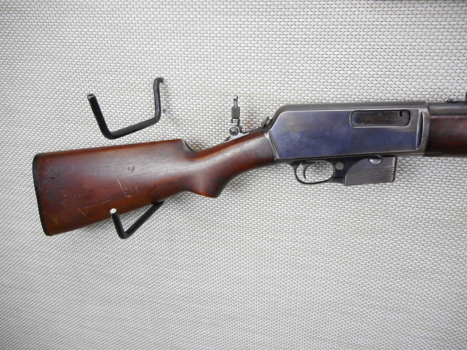 WINCHESTER , MODEL: 1907 , CALIBER: 351 SL , COMES WITH MAGAZINE, BORE IS VERY GOOD, BLADE FRONT SIGHT AND A FLIP ADJUSTABLE REAR PEEP SIGHT, MINOR CHIP IN THE FOREND, PLASTIC BUTT PLATE, SHOWS SOME HANDLING MARKS , ACTION: SEMI AUTOMATIC RIFLE , BARREL LENGTH:20" , CONDITION: 6/10 , SERIAL # 18523 , CANADIAN CLASS NON RESTRICTED