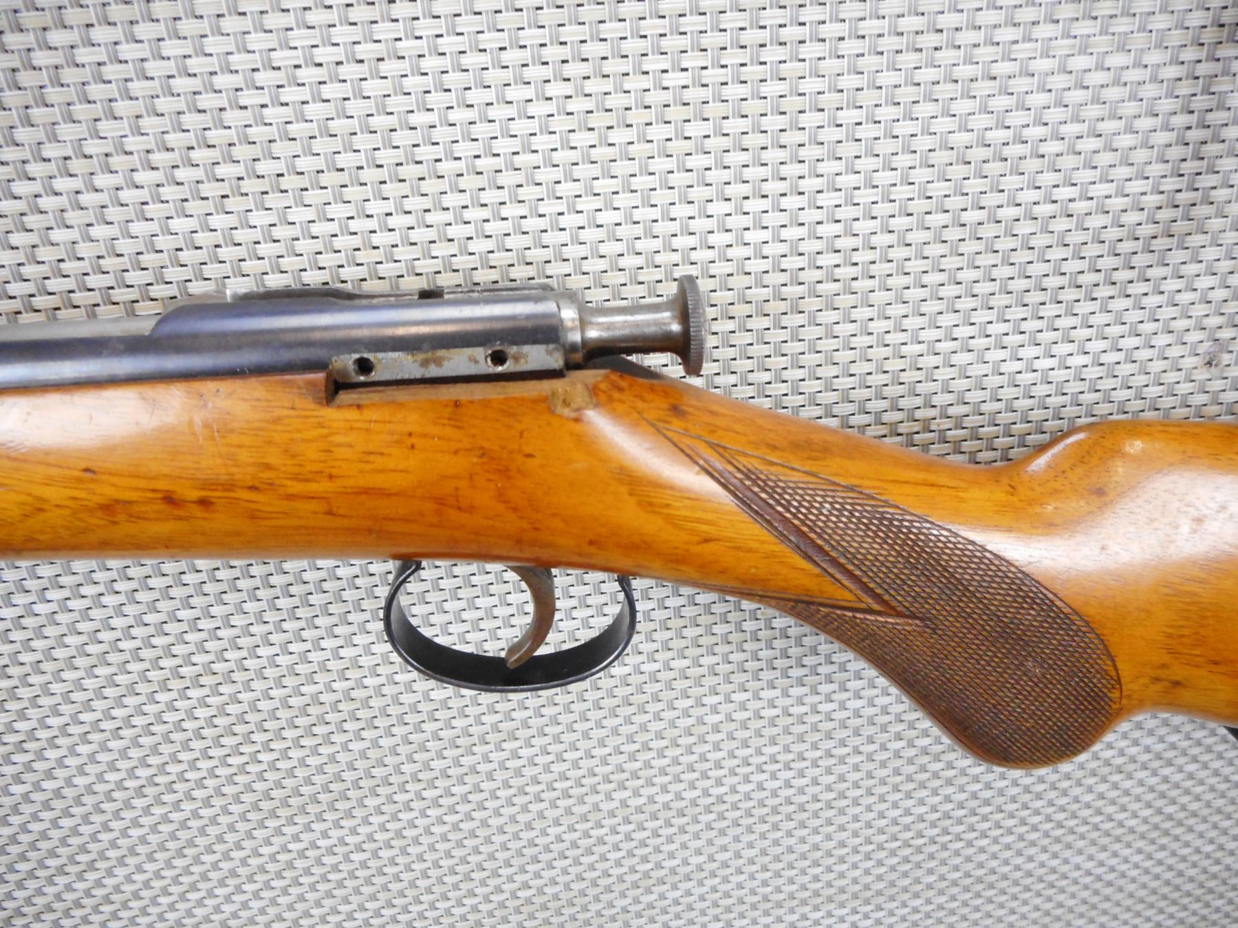 JG ANSCHUTZ , MODEL: SINGLE SHOT , CALIBER: 22 LR , PRE WWII ADDRESS ON THE BARREL, VERY GOOD BORE, BLADE FRONT AND FIXED REAR SIGHTS, RECEIVER HAS BEEN DRILLED FOR A PEEP SIGHT, CHECKERED SEMI PISTOL GRIP BUTT STOCK WITH STEEL BUTT PLATE, SHOWS SOME HANDLING MARKS , ACTION: BOLT ACTION SINGLE SHOT RIFLE , BARREL LENGTH:24" , CONDITION: 6/10 , SERIAL # 104081 , CANADIAN CLASS NON RESTRICTED