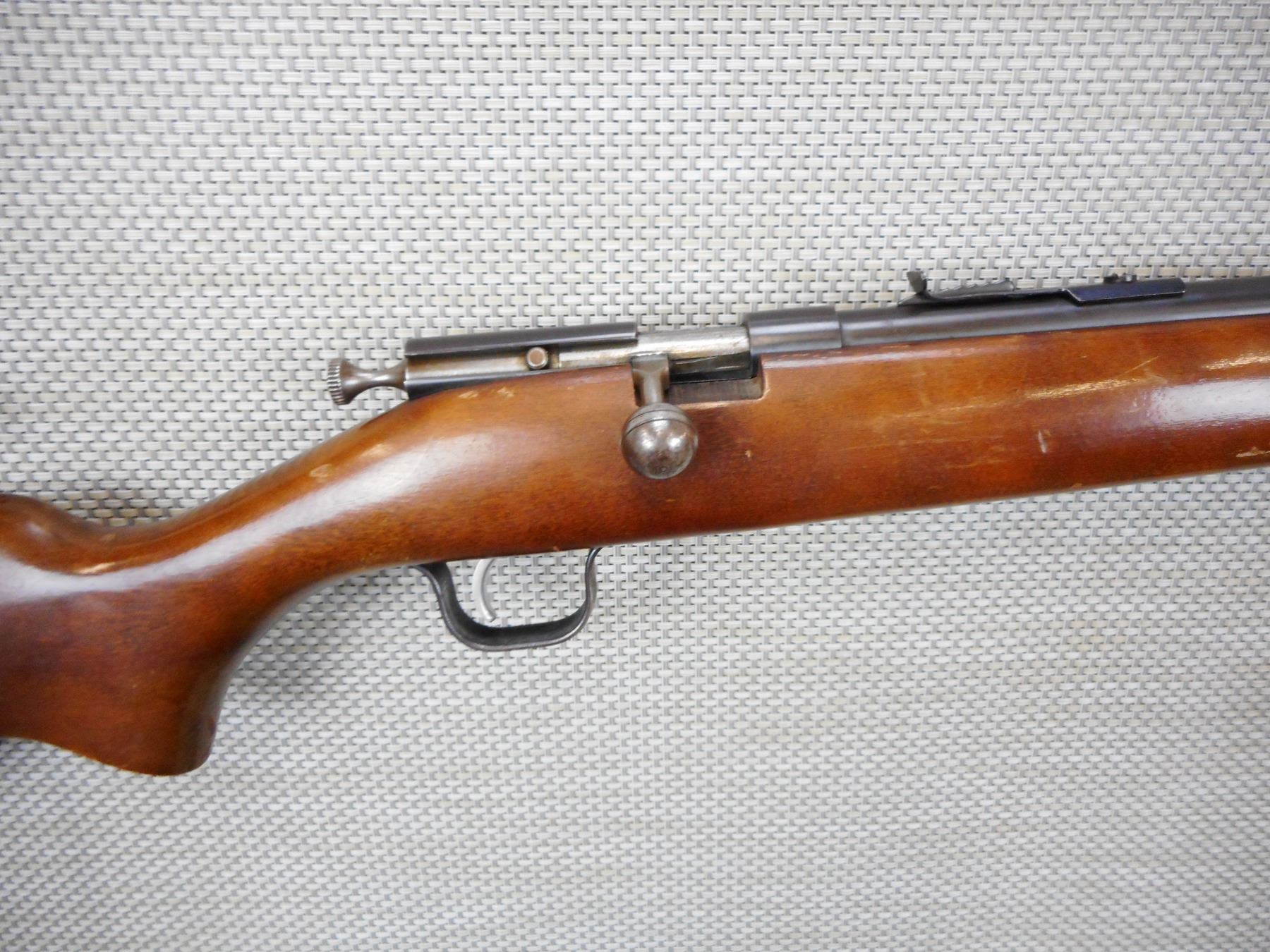 COOEY , MODEL: 39 , CALIBER: 22 LR , BORE IS EXCELLENT, BLADE FRONT AND ADJUSTABLE REAR SIGHT, SHOWS SOME HANDLING MARKS, PLASTIC BUTT PLATE , ACTION: BOLT ACTION SINGLE SHOT RIFLE , BARREL LENGTH:22" , CONDITION: 6/10 , SERIAL # 13665 , CANADIAN CLASS NON RESTRICTED