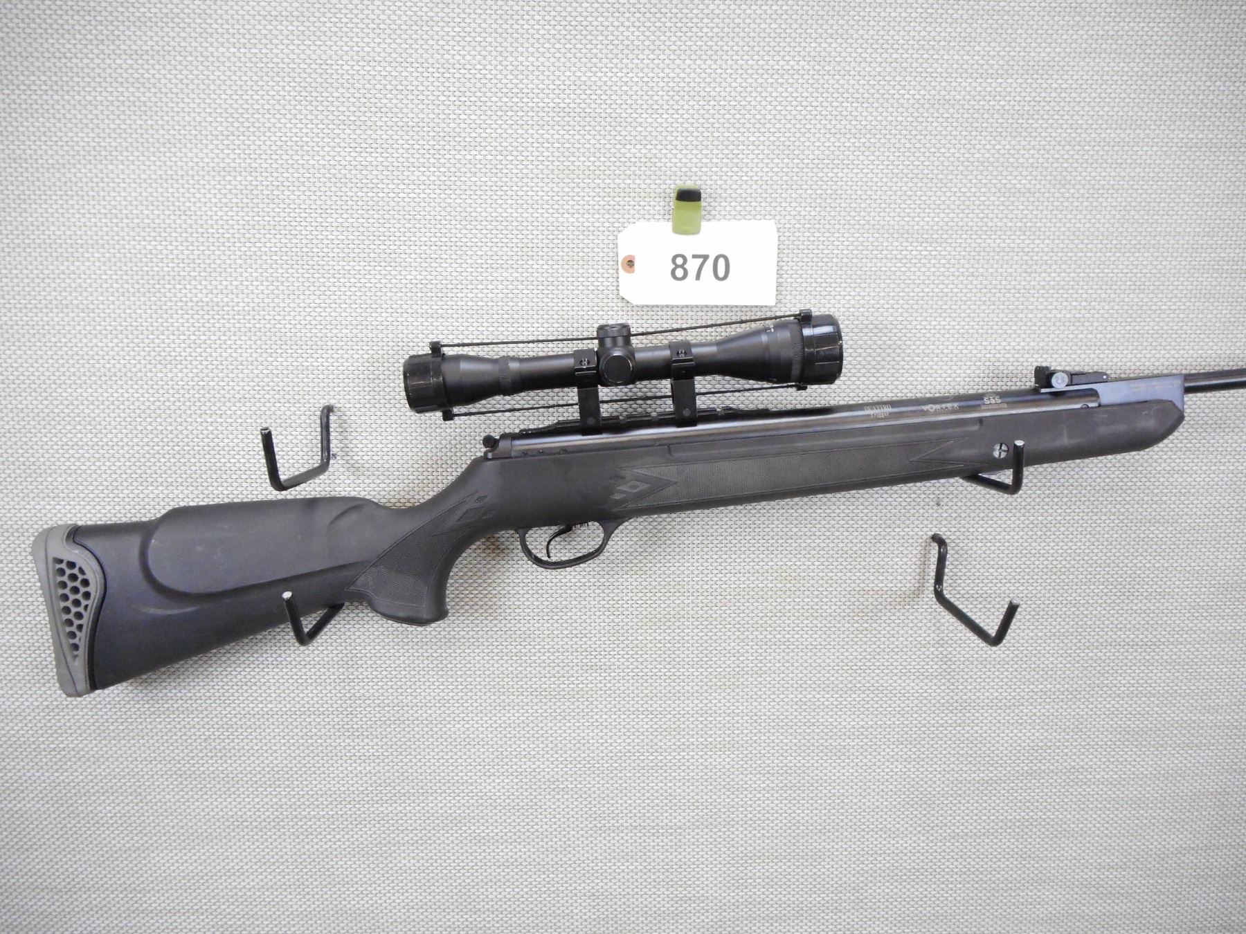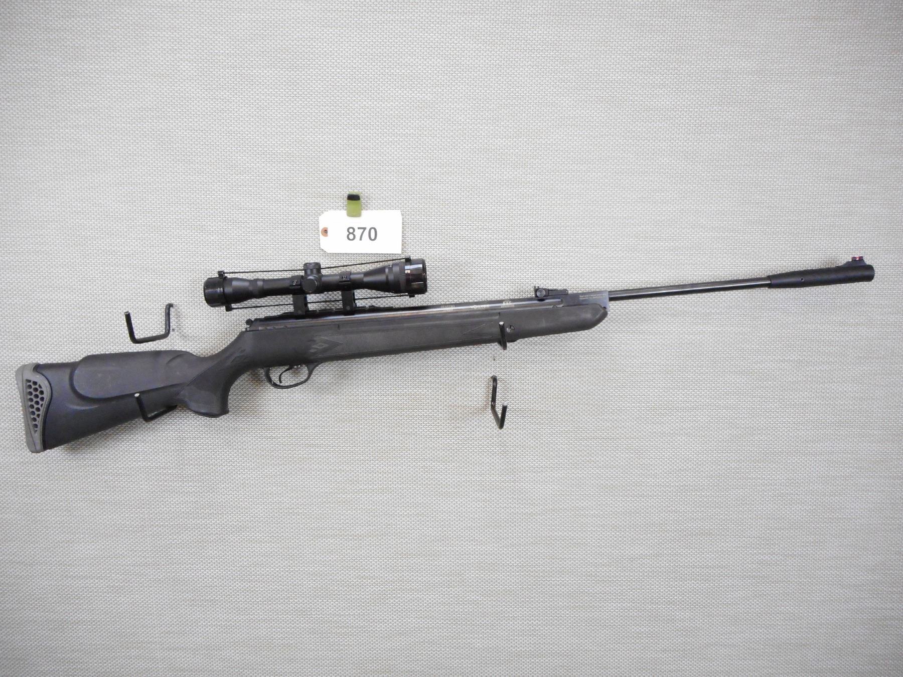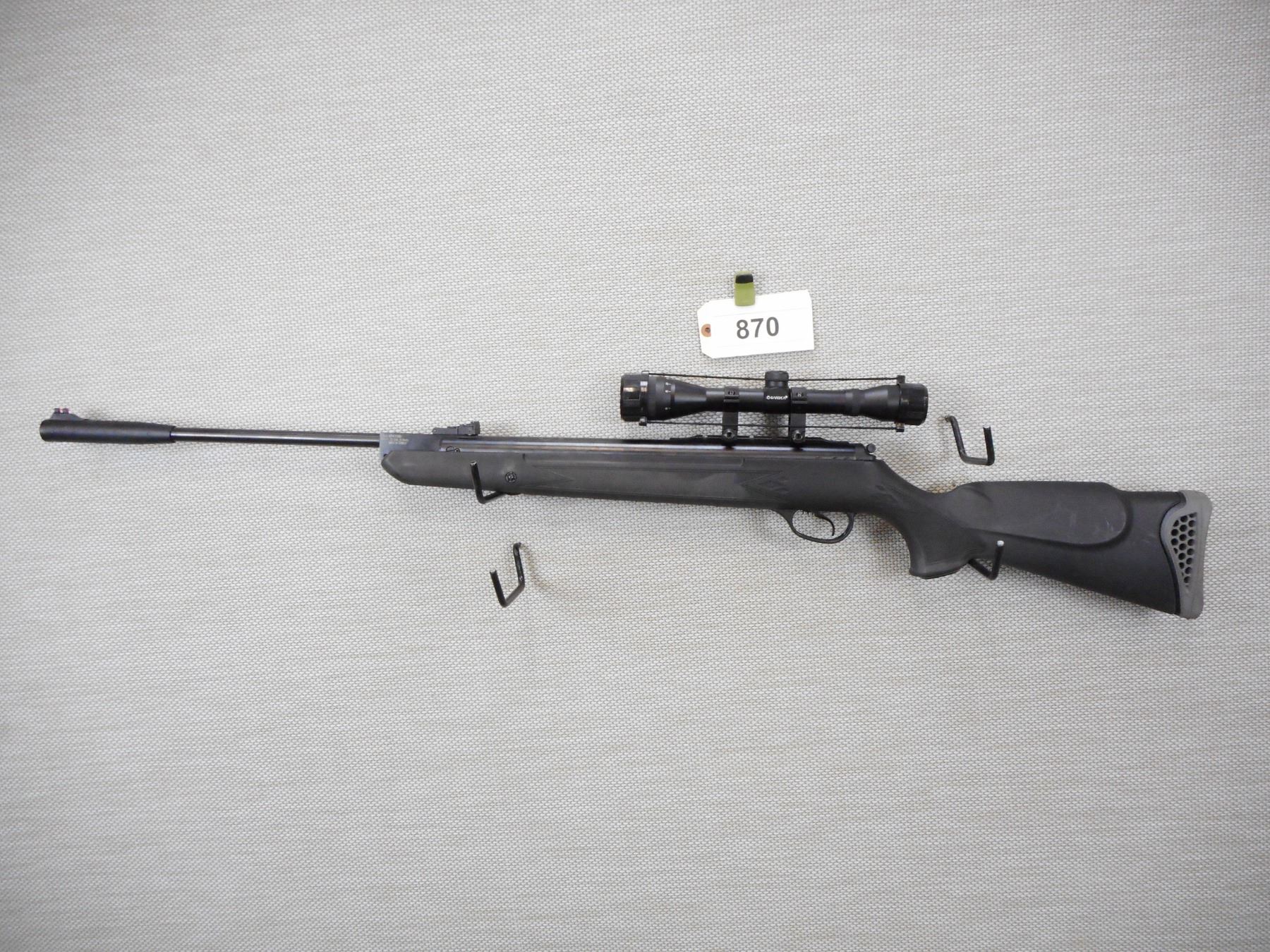 HATSAN , MODEL: 125 , CALIBER: 22 PELLET , FIBER OPTIC FRONT AND ADJUSTABLE REAR SIGHTS, HAS A BARSKA VARIABLE SCOPE, EXCELLENT BORE, BLACK SYNTHETIC STOCK WITH FULL PISTOL GRIP AND VENTED RUBBER RECOIL PAD, ADJUSTABLE TRIGGER, , ACTION: BREAK ACTION AIR RIFLE , BARREL LENGTH:19" , CONDITION: 8/10 , SERIAL # 021427683 , CANADIAN CLASS NON RESTRICTED