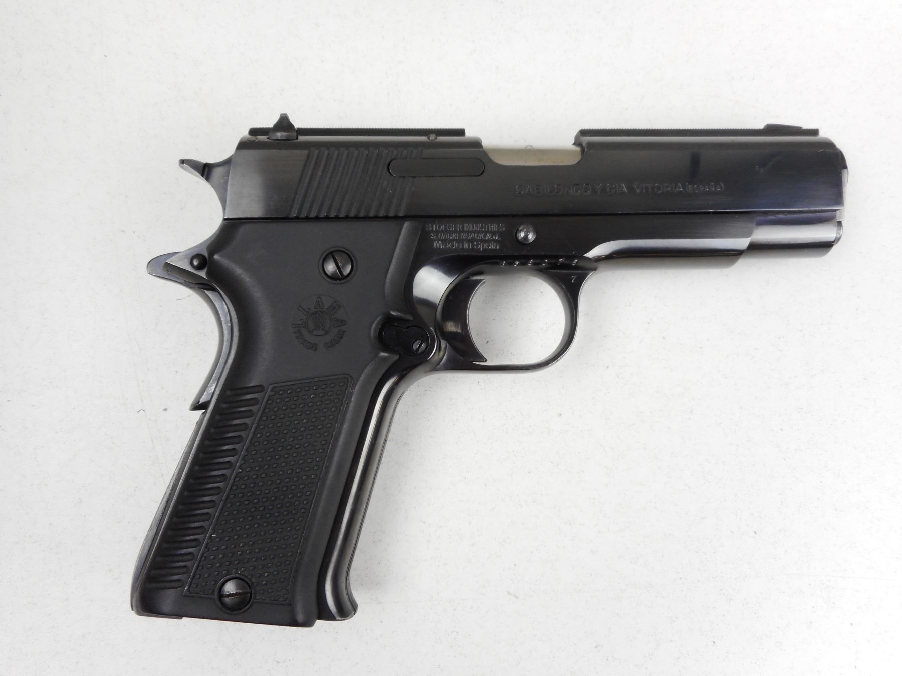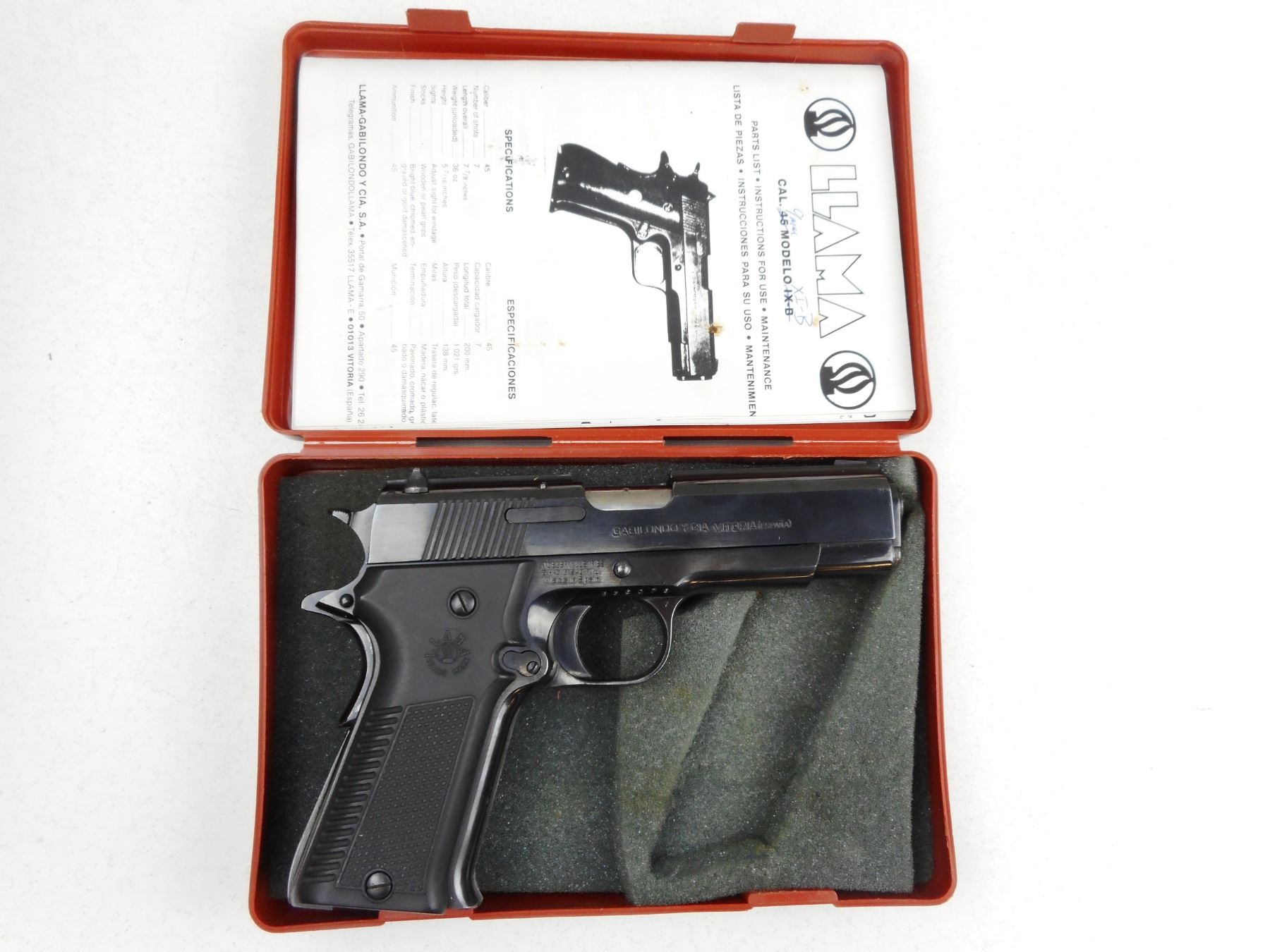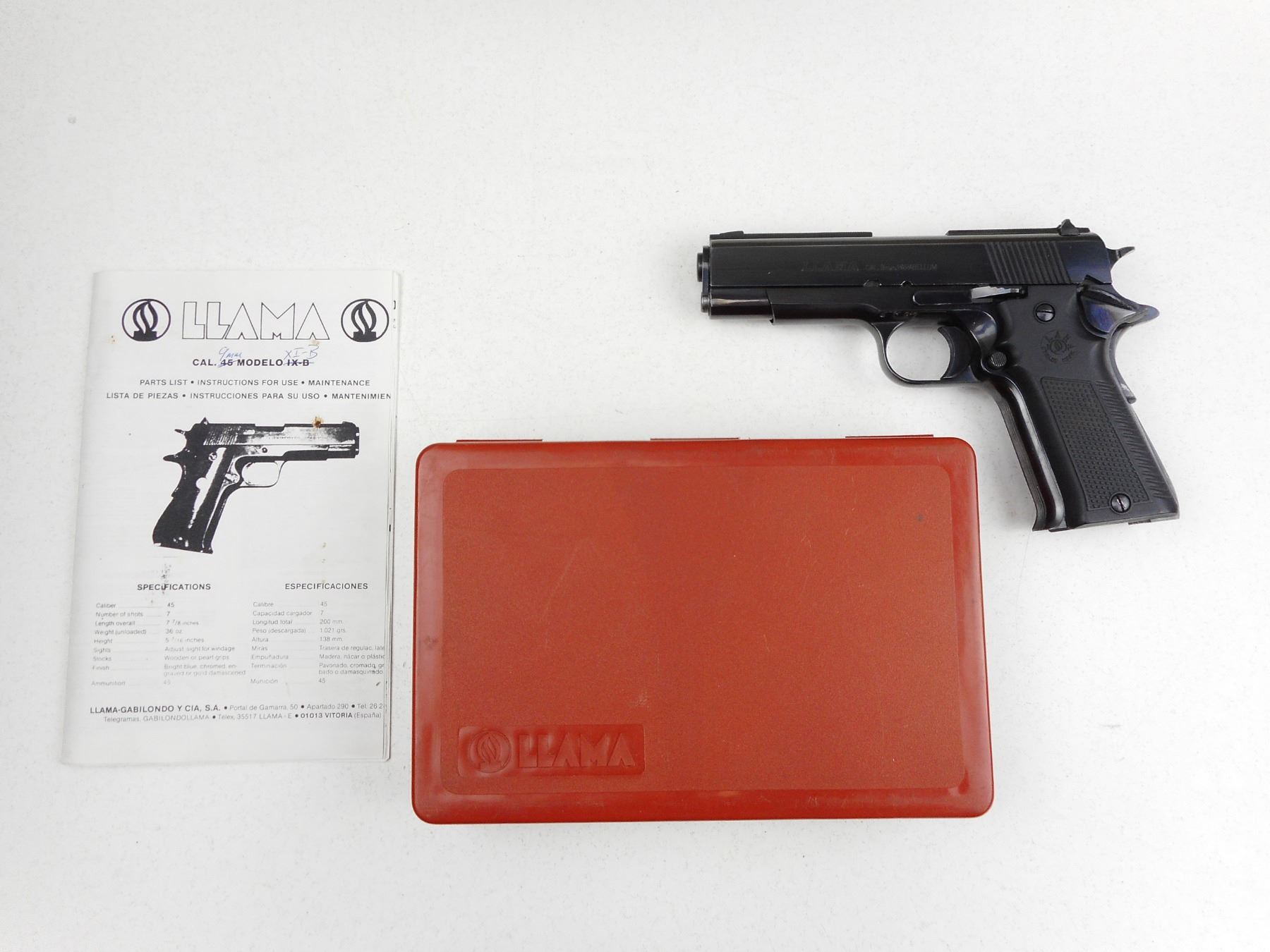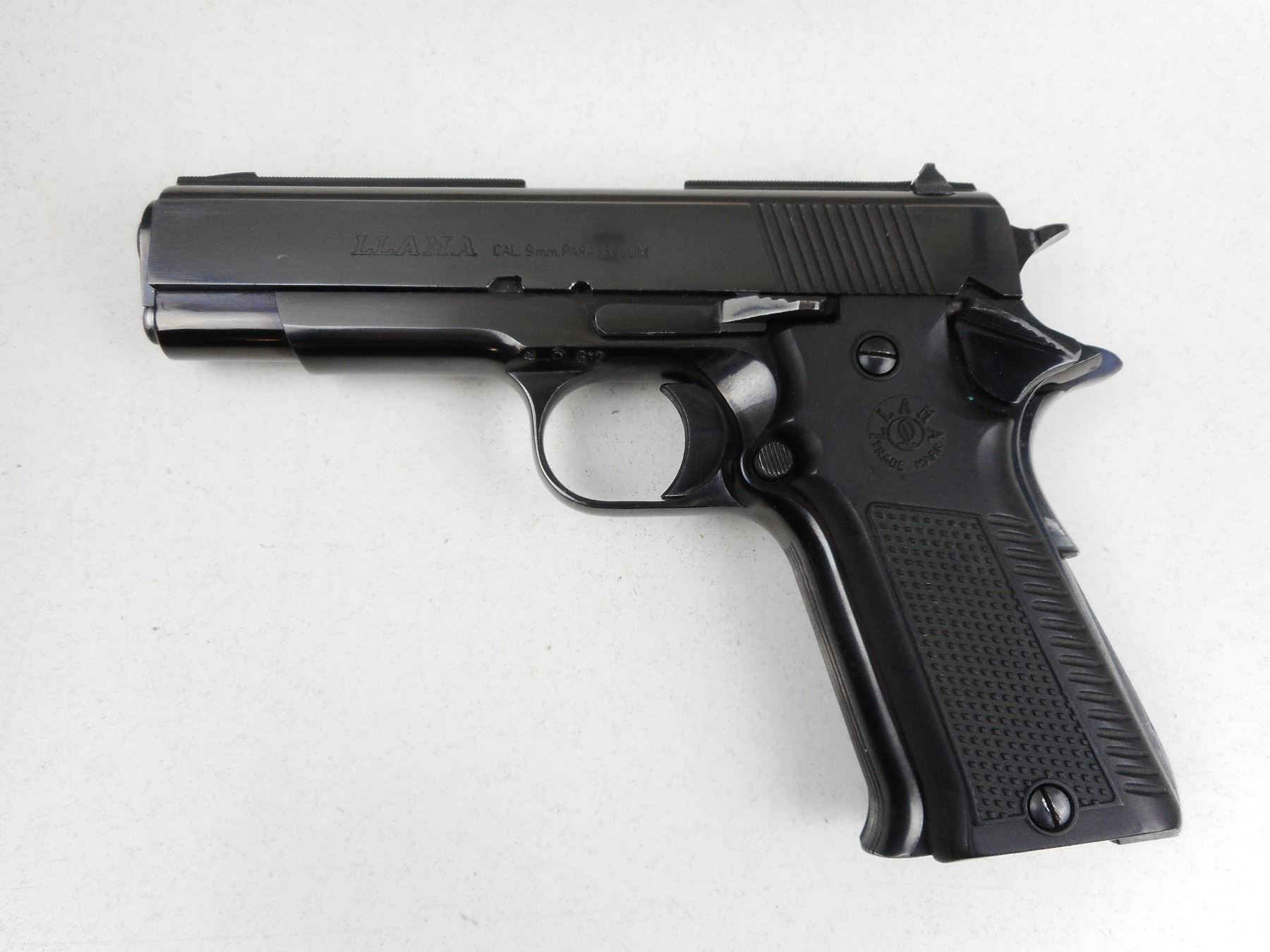 LLAMA , MODEL: XIB , CALIBER: 9MM LUGER , COMES WITH PLASTIC CASE, DOES NOT COME WITH MAGAZINE, BORE IS VERY GOOD, BLADE FRONT AND FIXED REAR SIGHTS, CHECKERED PLASTIC GRIPS, SHOWS SOME HANDLING MARKS , ACTION: SEMI-AUTOMATIC HANDGUN , BARREL LENGTH: 108MM , CONDITION: 7/10 , STOCK # R2902 , SERIAL # B36075 , CLASS: CANADIAN RESTRICTED CLASS