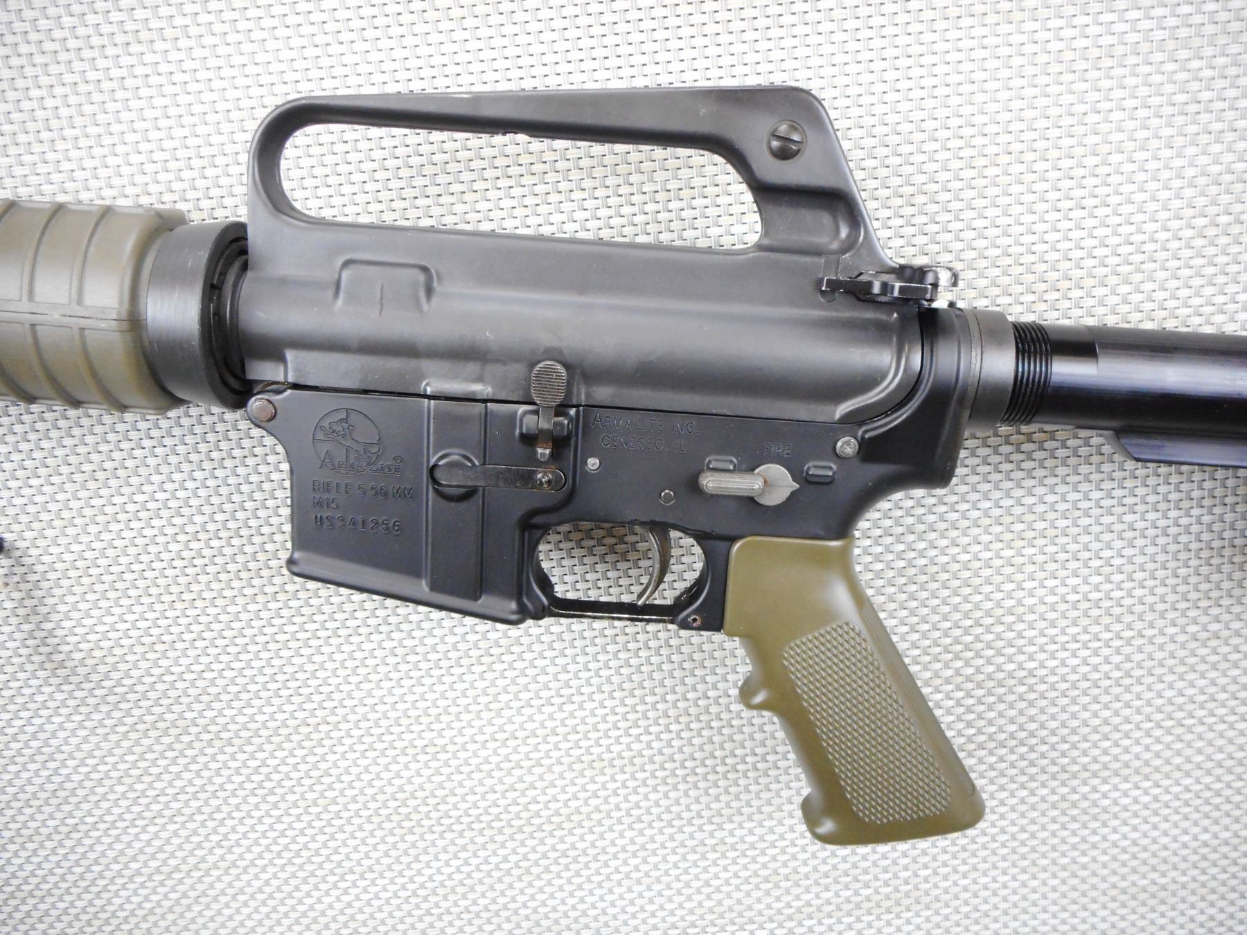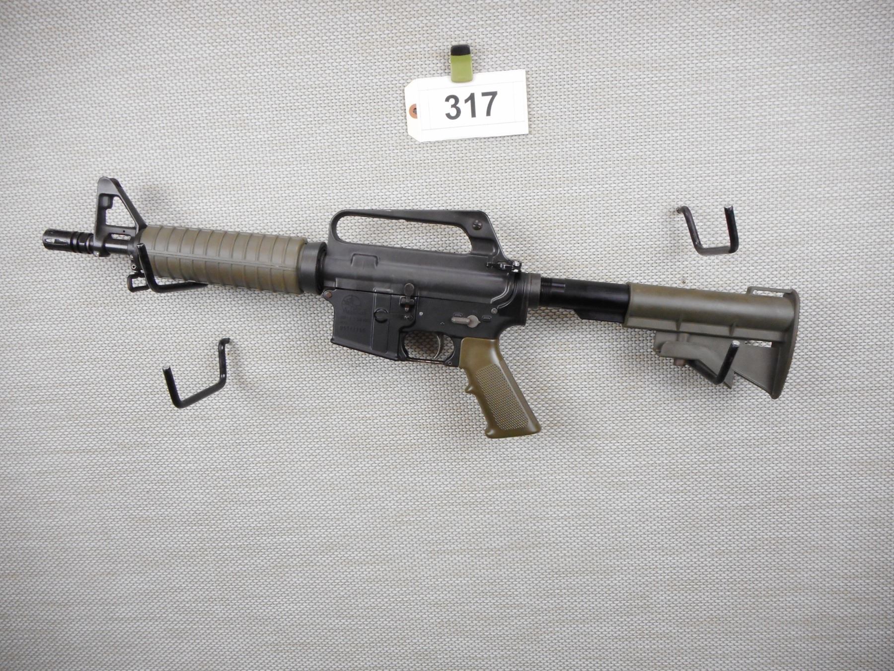 ARMALITE , MODEL: M15 , CALIBER: 9MM LUGER , DOES NOT COME WITH MAGAZINE, THIS FIREARM HAS A STANDARD AR LOWER IN 5.56 CALIBER AND THE UPPER APPEARS TO BE A 9MM LUGER CONVERSION, (PISTOL CALIBER UPPER AND RIFLE CALIBER LOWER) THIS FIREARM WILL REQUIRE THE PINHOLES TO BE BUSHED TO FUNCTION, GREEN SYNTHETIC FURNITURE WITH FULL PISTOL GRIP, BIRD CAGE FLASH HIDER, A2 COLLAPSABLE BUTT, SHOWS SOME HANDLING MARKS, BORE IS EXCELLENT, SLING LOOPS , ACTION: SEMI AUTOMATIC RIFLE , BARREL LENGTH: 254MM , CONDITION: 6/10 , STOCK # R2905 , SERIAL # US341256 , CLASS: CANADIAN RESTRICTED CLASS