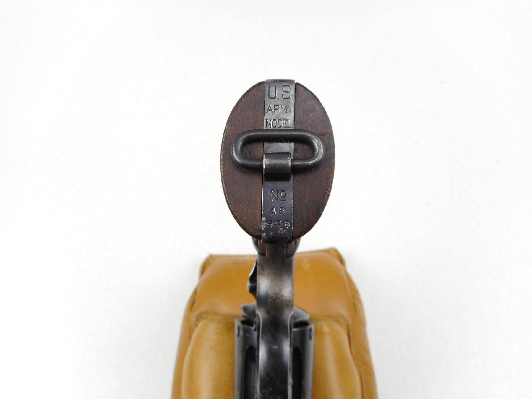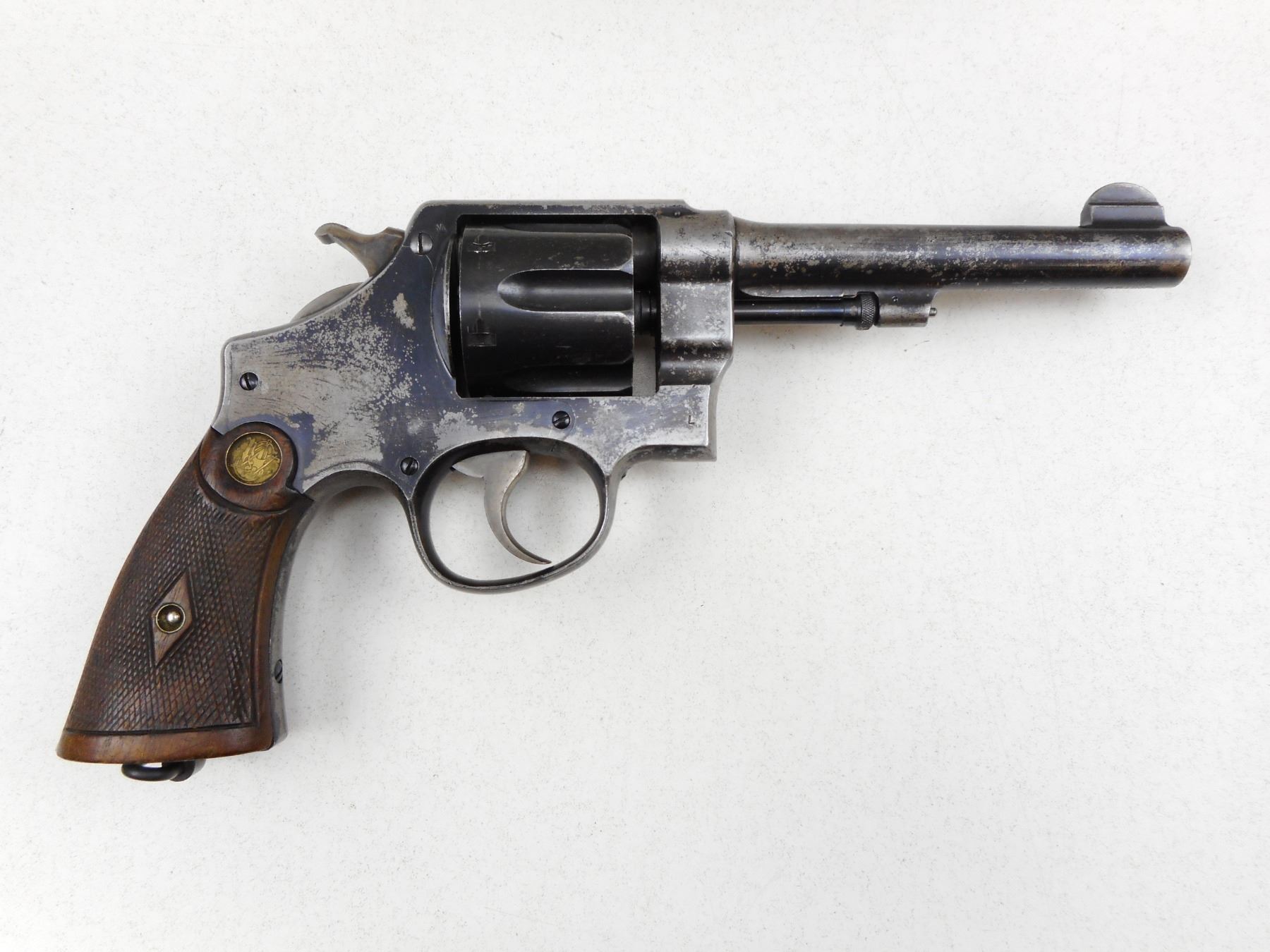 SMITH & WESSON , MODEL: HAND EJECTOR 45 MODEL 1917 , CALIBER: 45 COLT , 6 SHOT CAPACITY, MARKED US ARMY 1917 ON THE BUTT, BLADE FRONT AND GROOVED RECEIVER REAR SIGHT, SHOWS EXTENSIVE HANDLING WITH VERY LITTLE BLUEING REMAINING, VERY GOOD BORE, CHECKERED WOOD GRIPS WITH S&W LOGO, LANYARD LOOP , ACTION: REVOLVER , BARREL LENGTH: 140MM , CONDITION: 5/10 , STOCK # R2912 , SERIAL # 48938 , CLASS: CANADIAN RESTRICTED CLASS
