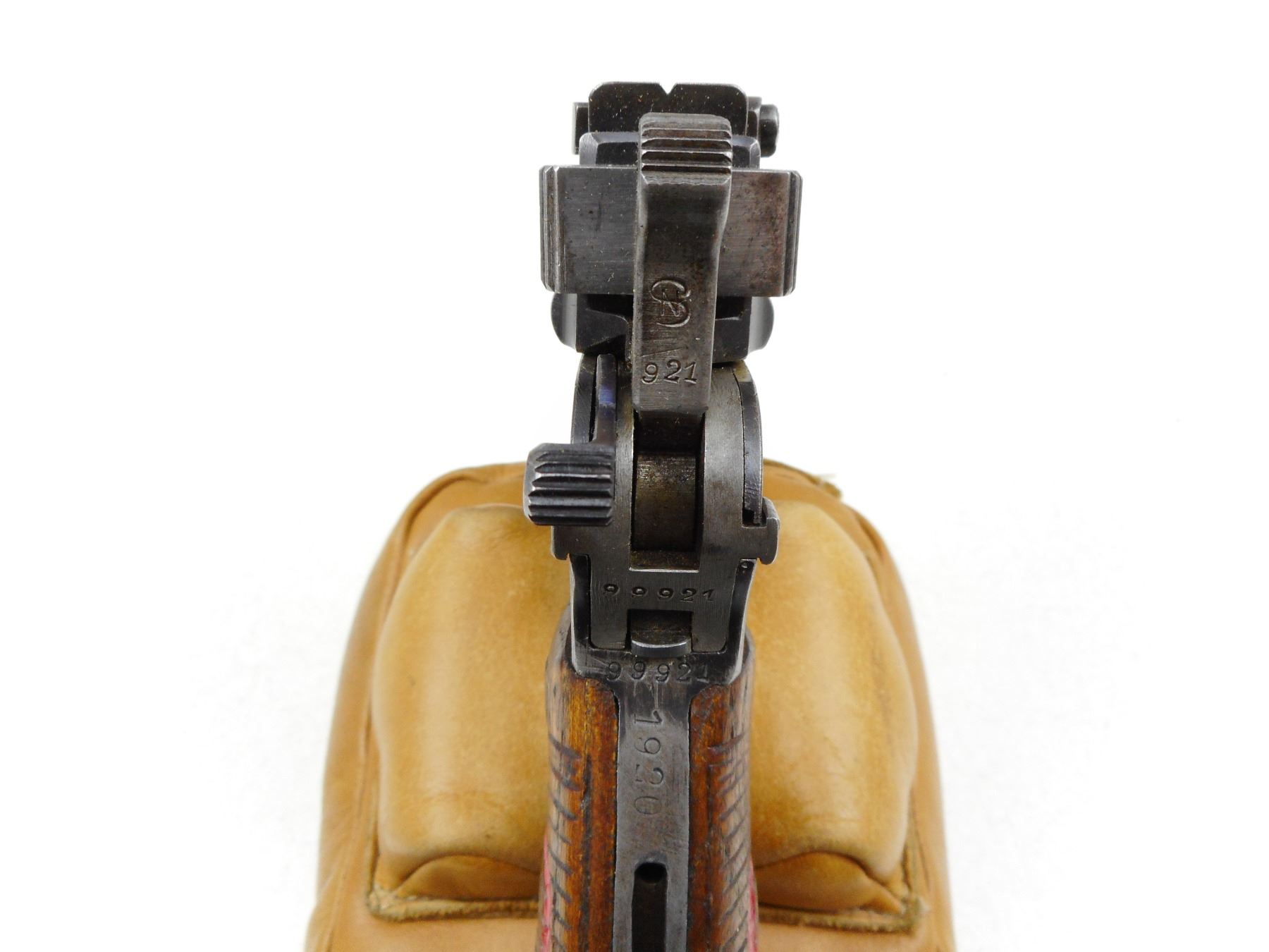 MAUSER , MODEL: C96 BROOMHANDLE RED 9 DATED1920 , CALIBER: 9MM LUGER , COMES WITH WOODEN HOLSTER, FAIR BORE, ALL MATCHING #,S BLADE FRONT AND ADJUSTABLE REAR SIGHTS TO 500M, APPEARS TO HAVE BEEN REFINISHED, LANYARD LOOP WITH RING, LINED WOODEN GRIP PANELS WITH THE RED 9 EMBEDDED , ACTION: SEMI-AUTOMATIC HANDGUN , BARREL LENGTH: 140MM , CONDITION: 6/10 , STOCK # R2918 , SERIAL # 99921 , CLASS: CANADIAN RESTRICTED CLASS