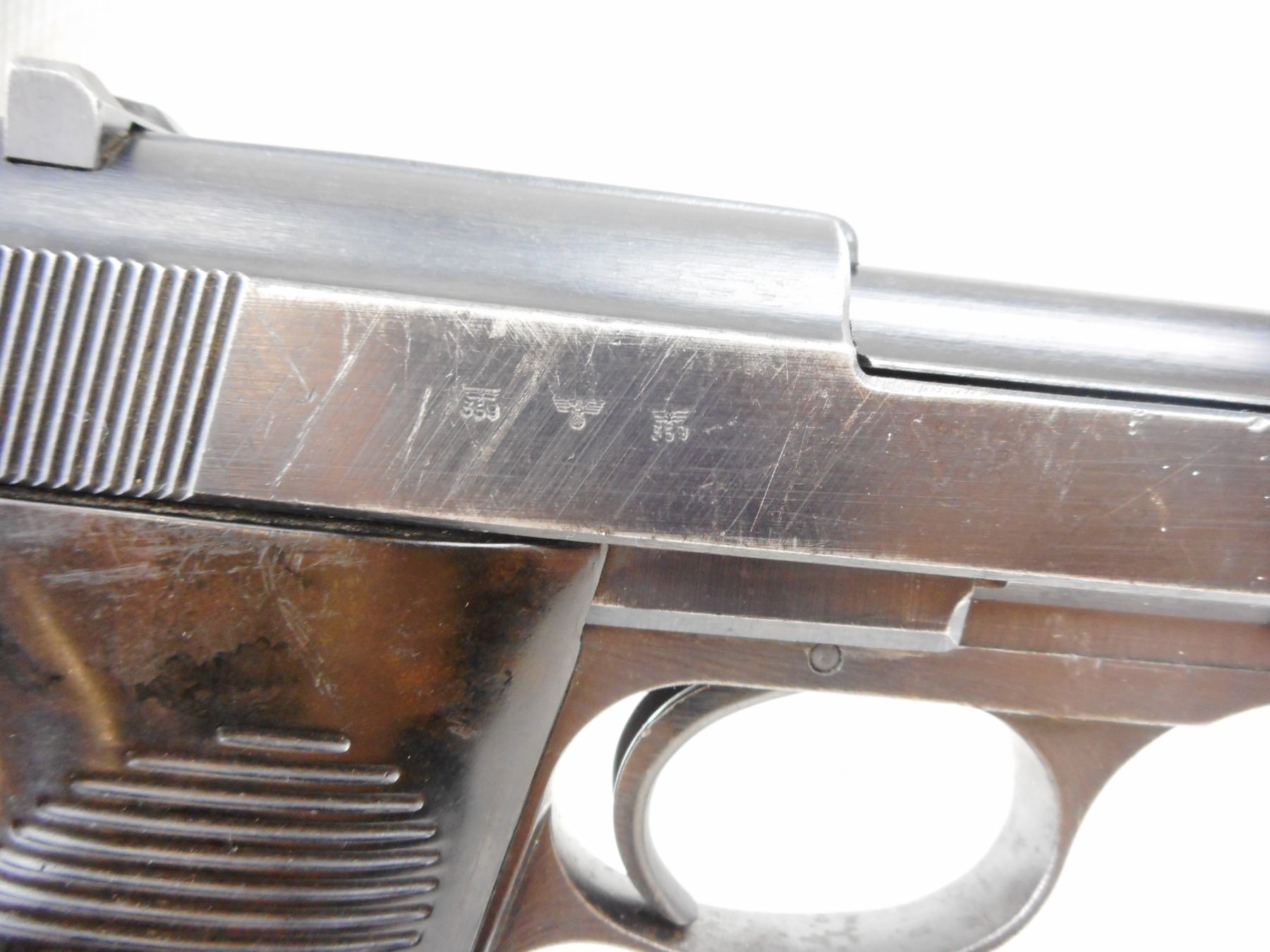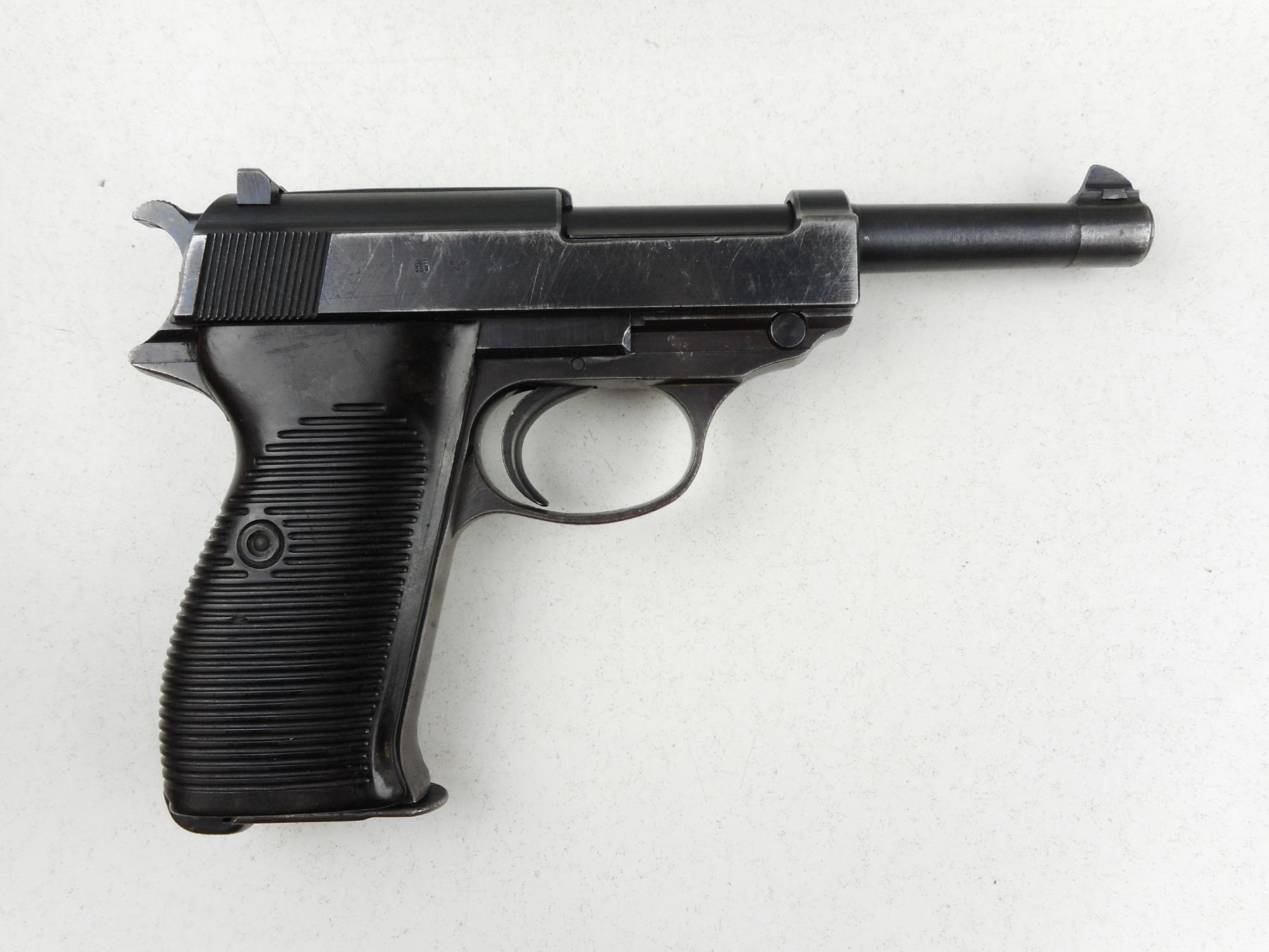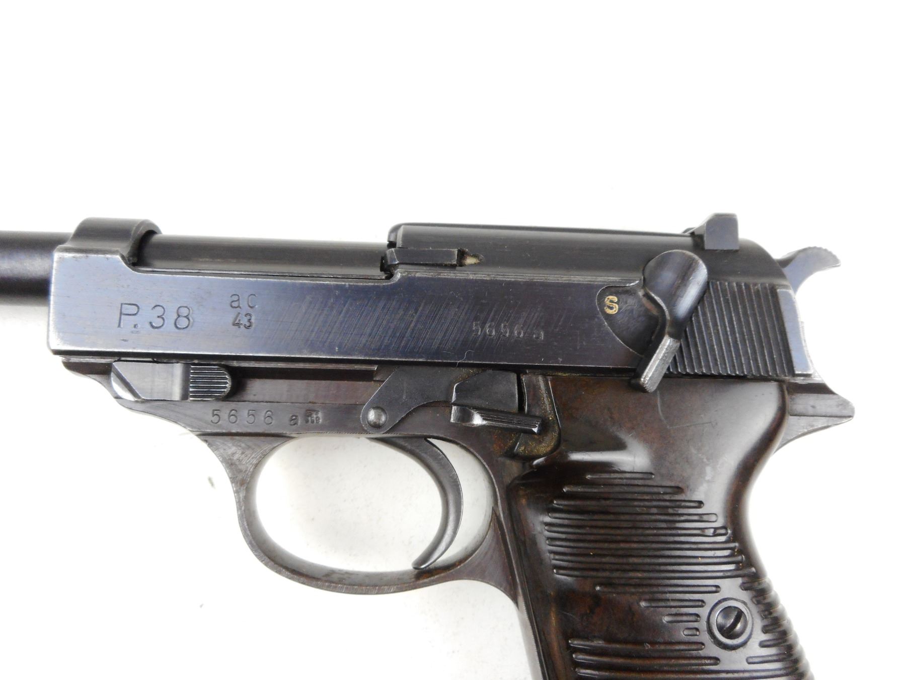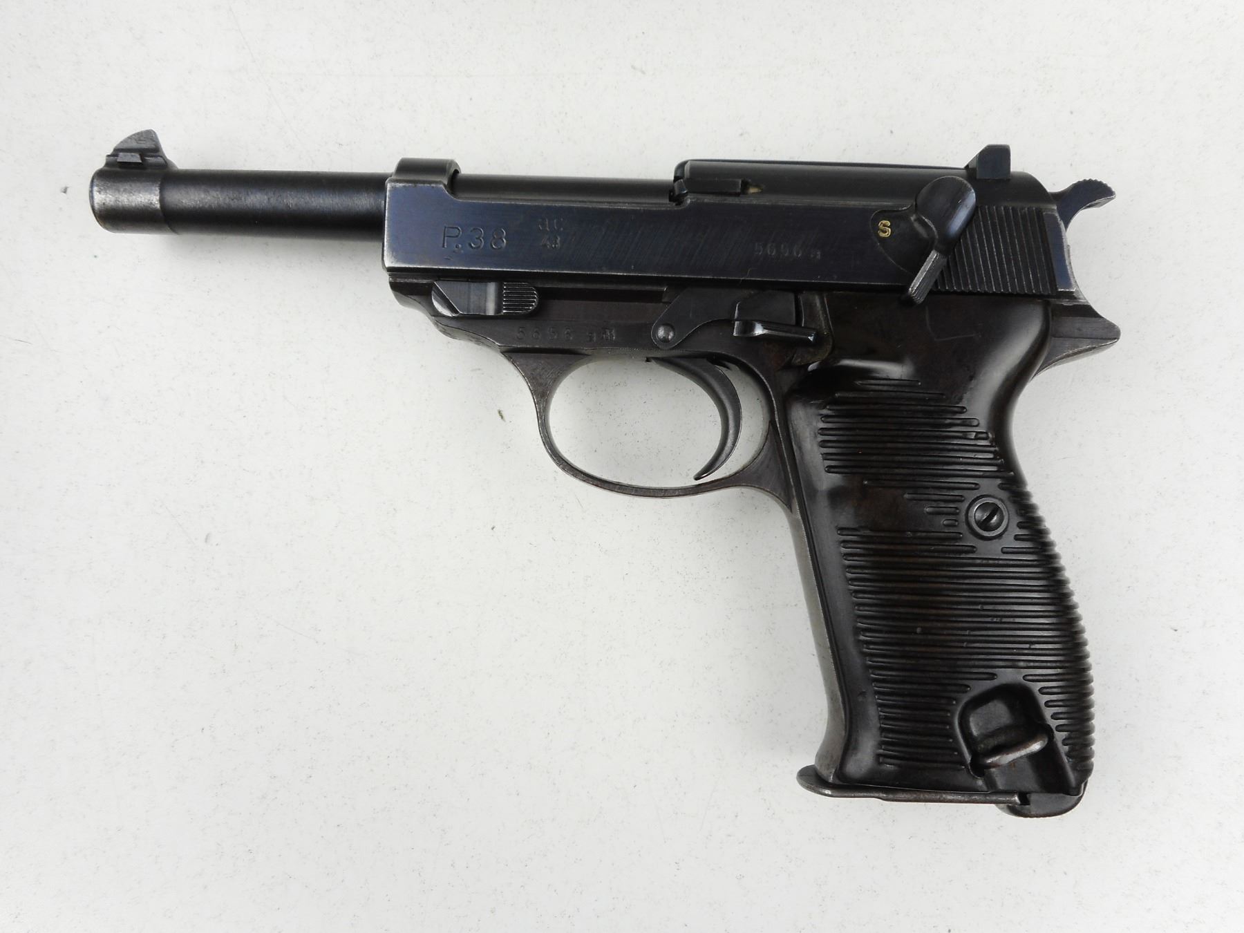 WWII ERA, WALTHER , MODEL: P38 , CALIBER: 9MM LUGER , COMES WITH MAGAZINE, DATED 1943, NUMEROUS GERMAN MILITARY MARKS, BLADE FRONT AND FIXED REAR SIGHTS, GROOVED PLASTIC GRIP PANELS, LANYARD LOOP, SHOWS SOME HANDLING MARKS, BORE IS VERY GOOD , ACTION: SEMI-AUTOMATIC HANDGUN , BARREL LENGTH: 127MM , CONDITION: 6/10 , STOCK # R2940 , SERIAL # 5656A , CLASS: CANADIAN RESTRICTED CLASS