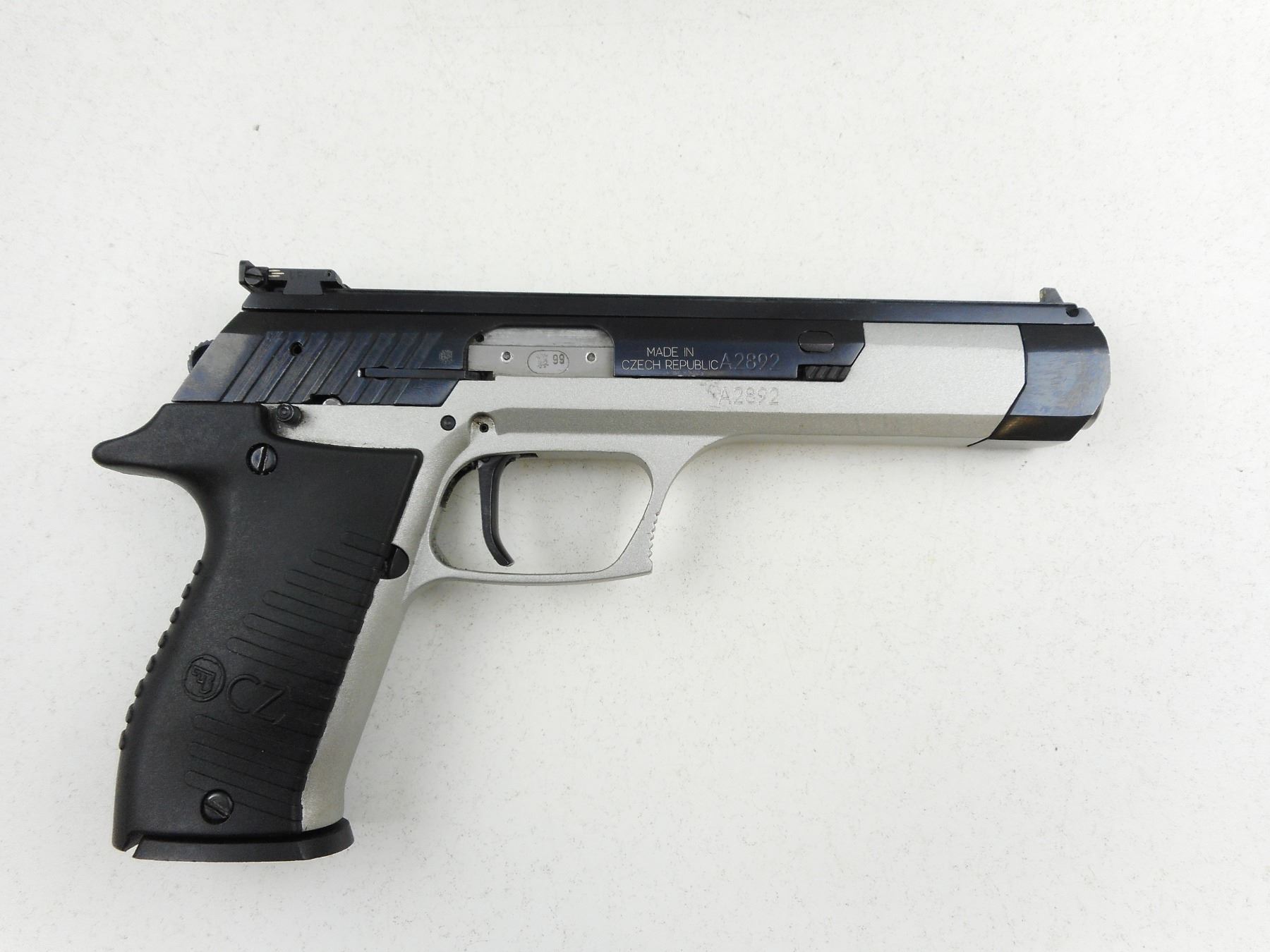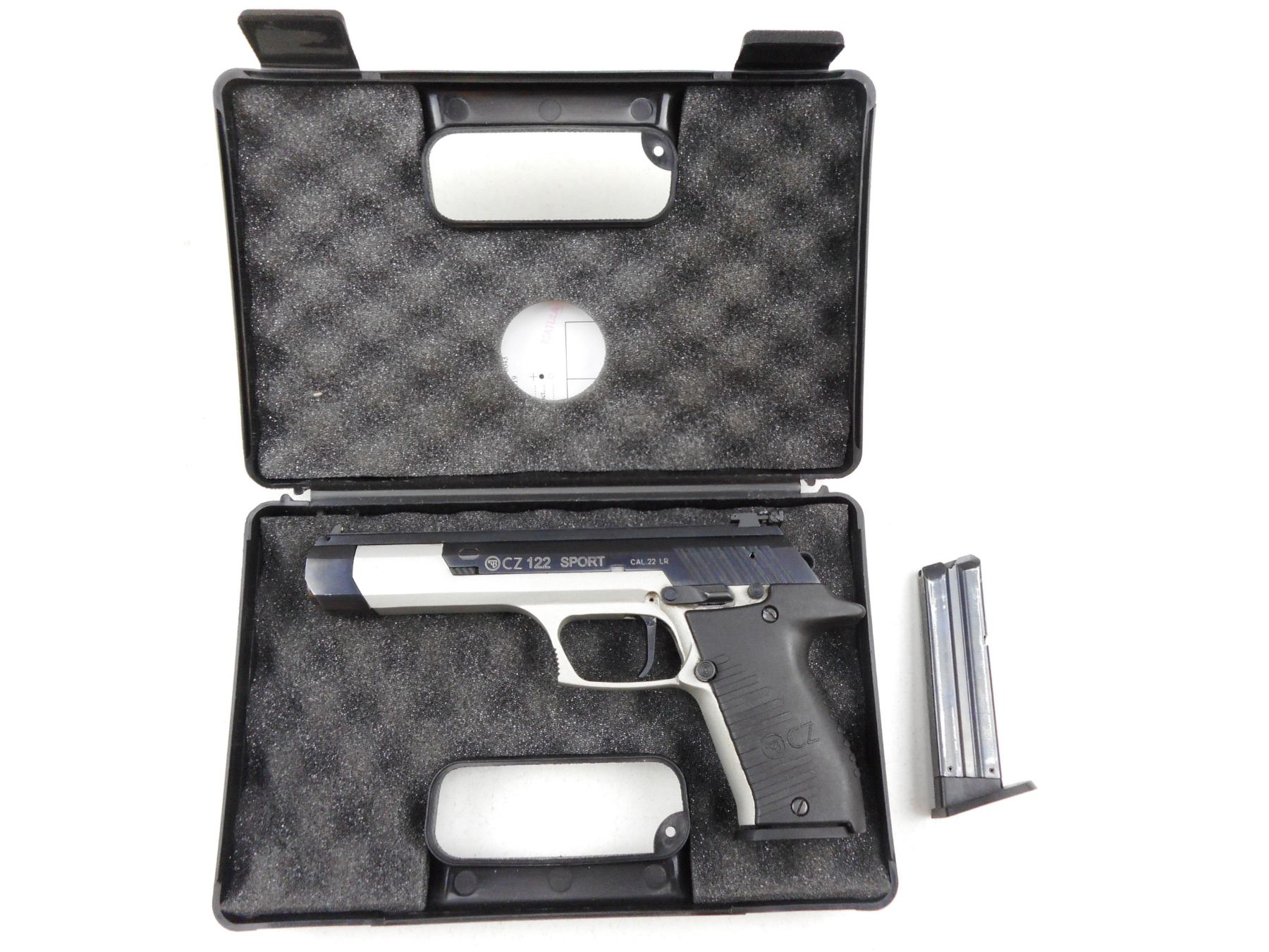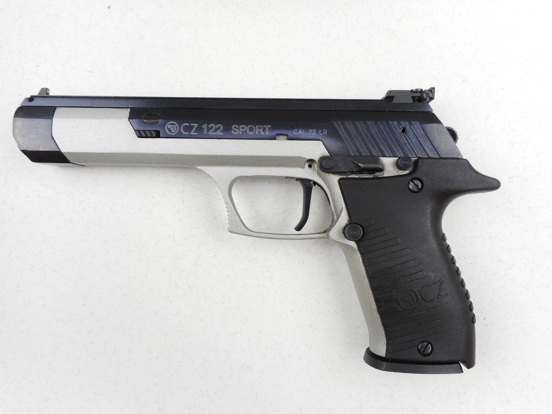 CZ , MODEL: CZ122 SPORT , CALIBER: 22LR , COMES WITH CASE AND 2 MAGAZINES, BRUSHED STAINLESS STEEL FINISH, WRAP AROUND TEXTURED GRIPS, 3 DOT SIGHT SYSTEM WITH REAR ADJ. FOR WINDAGE, DOVETAILED TOP RAIL, EXCELLENT BORE , ACTION: SEMI-AUTOMATIC , BARREL LENGTH: 152MM , CONDITION: 9/10 , STOCK # R2974 , SERIAL # A2892 , CLASS: CANADIAN RESTRICTED CLASS