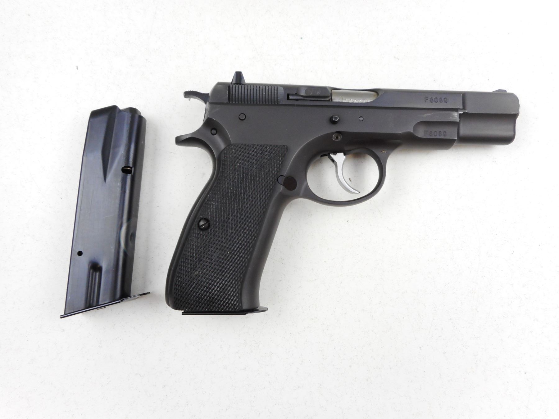 CZ , MODEL: CZ75 , CALIBER: 9MM LUGER , COMES WITH 2 MAGAZINES, BLUE/BLACK FINISH, HARD RUBBER CHECKERED GRIPS, NOTCH & BLADE SIGHTS, EXCELLENT BORE , ACTION: SEMI-AUTOMATIC , BARREL LENGTH: 121MM , CONDITION: 9/10 , STOCK # R2976 , SERIAL # F8089 , CLASS: CANADIAN RESTRICTED CLASS