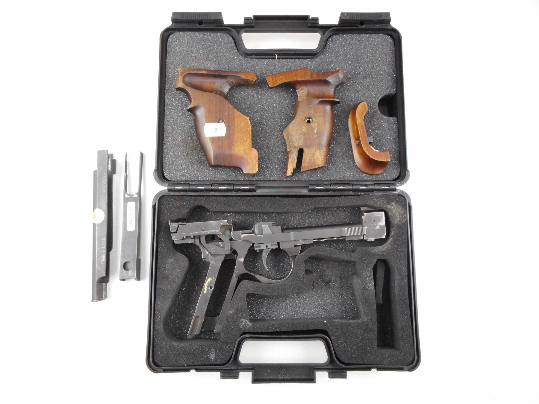 VOSTOK , MODEL: IZH-35M , CALIBER: 22 LR , COMES WITH A CASE AND ACCESSORIES, THERE IS NO MAGAZINE, THIS IS A PARTS GUN, 5 SHOT CAPACITY, BLADE FRONT AND ADJUSTABLE REAR SIGHTS, SHOWS SOME HANDLING MARKS, MISSING ASSORTED UNKNOWN PARTS , ACTION: SEMI AUTOMATIC HANDGUN , BARREL LENGTH: 153MM , CONDITION: PARTS GUN , STOCK # R2980 , SERIAL # 871004 , CLASS: CANADIAN RESTRICTED CLASS