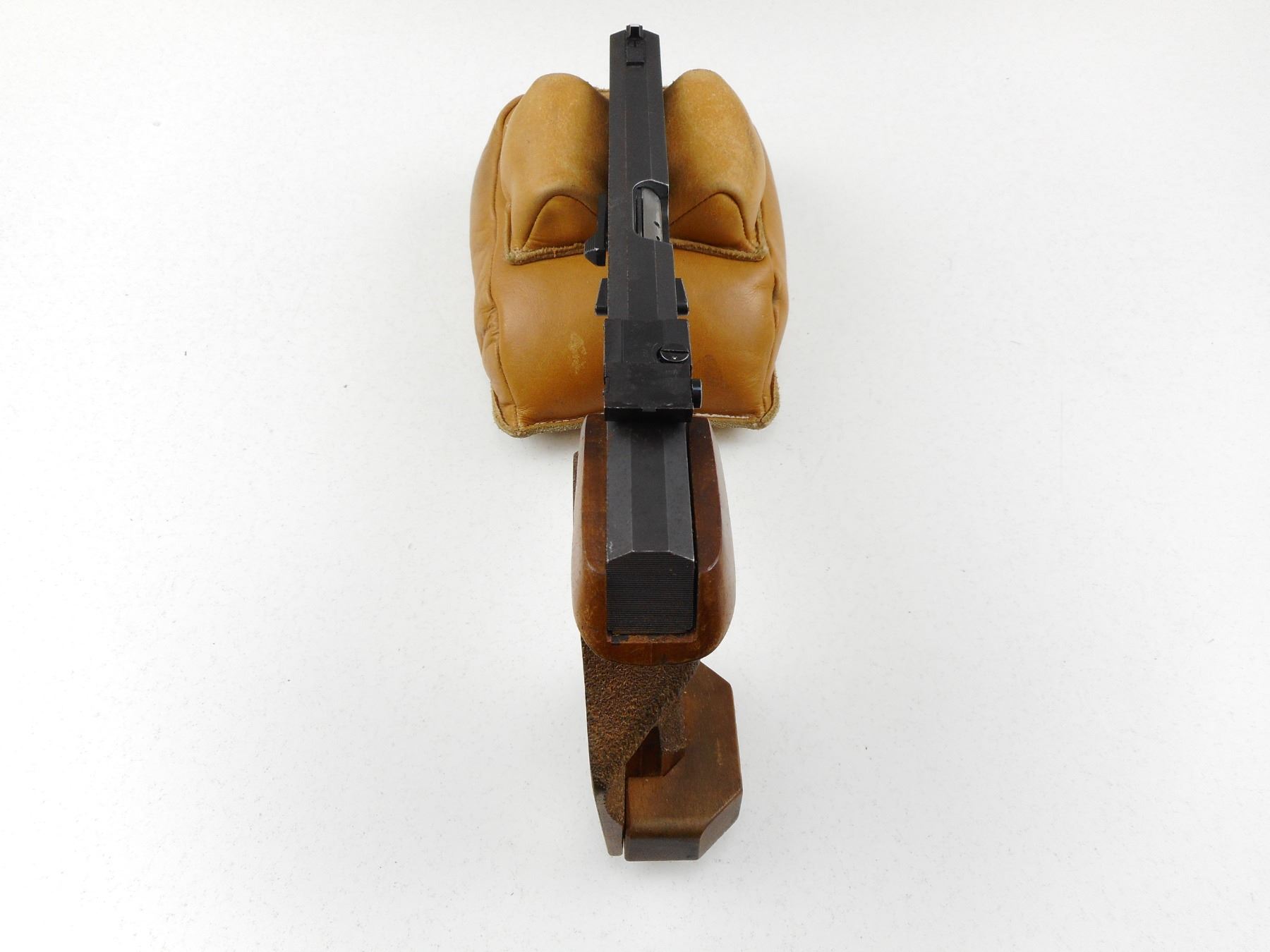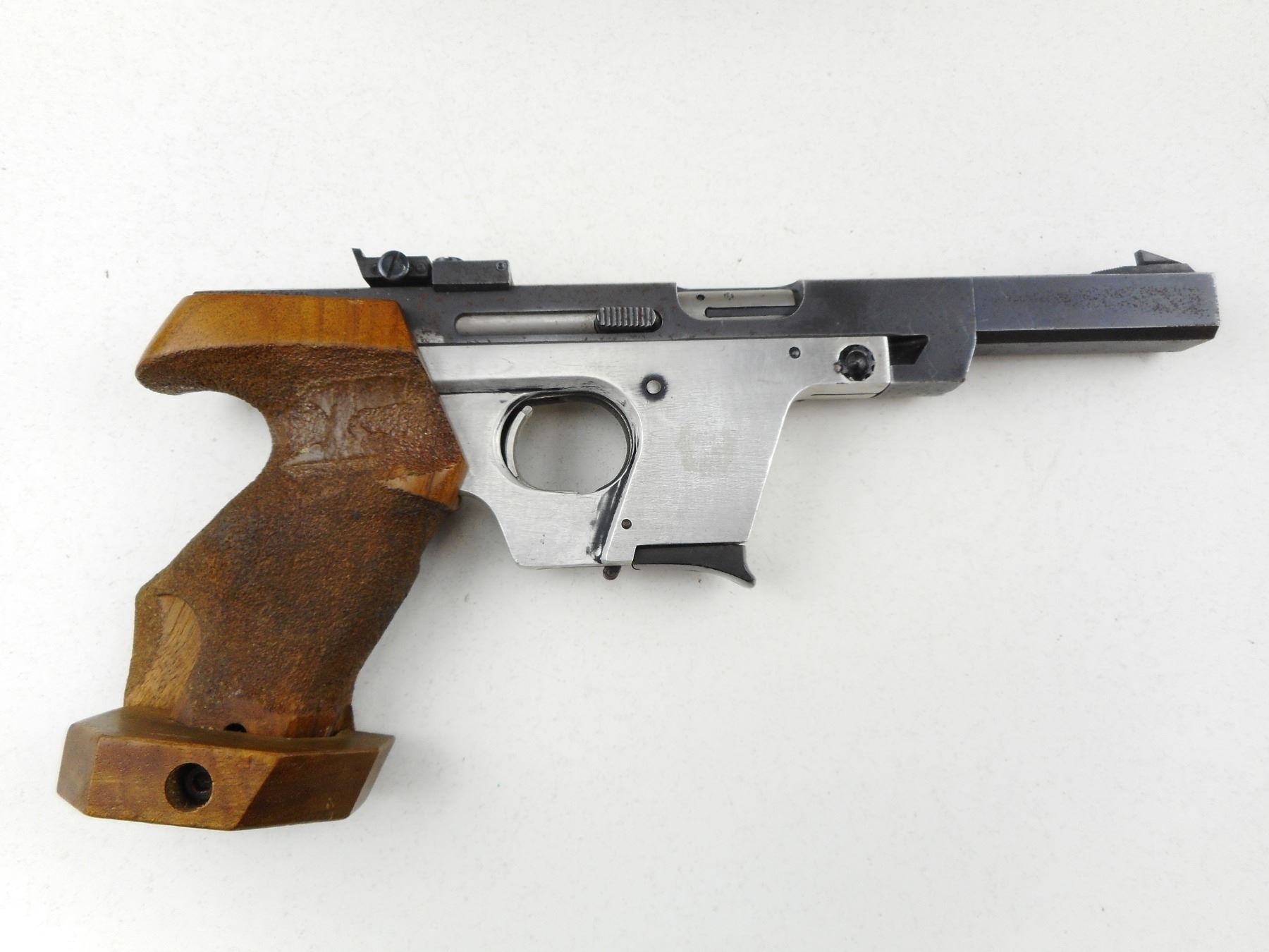 WALTHER , MODEL: GSP , CALIBER: 22 LR , COMES WITH A MAGAZINE, 5 SHOT CAPACITY, BLADE FRONT AND ADJUSTABLE REAR SIGHTS, BORE IS VERY GOOD, STIPPLED ERGONOMIC WOODEN GRIP PANELS, LIGHTLY PITTED METAL SURFACE, SHOWS SOME HANDLING MARKS , ACTION: SEMI AUTOMATIC HANDGUN , BARREL LENGTH: 114MM , CONDITION: 5/10 , STOCK # R2988 , SERIAL # G1765B , CLASS: CANADIAN RESTRICTED CLASS