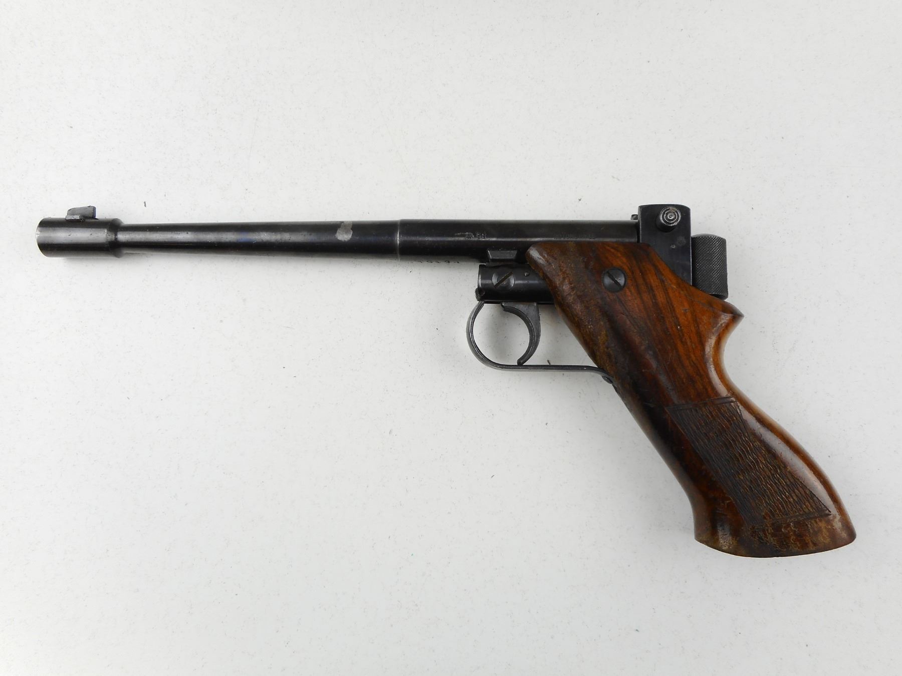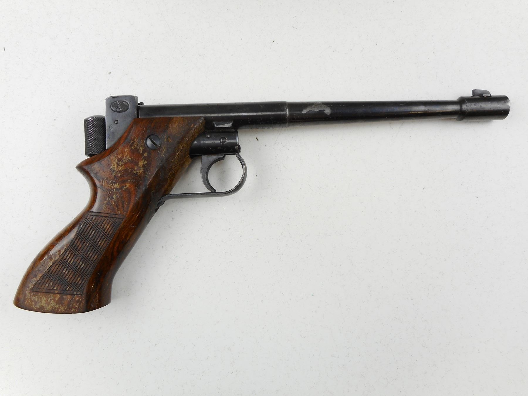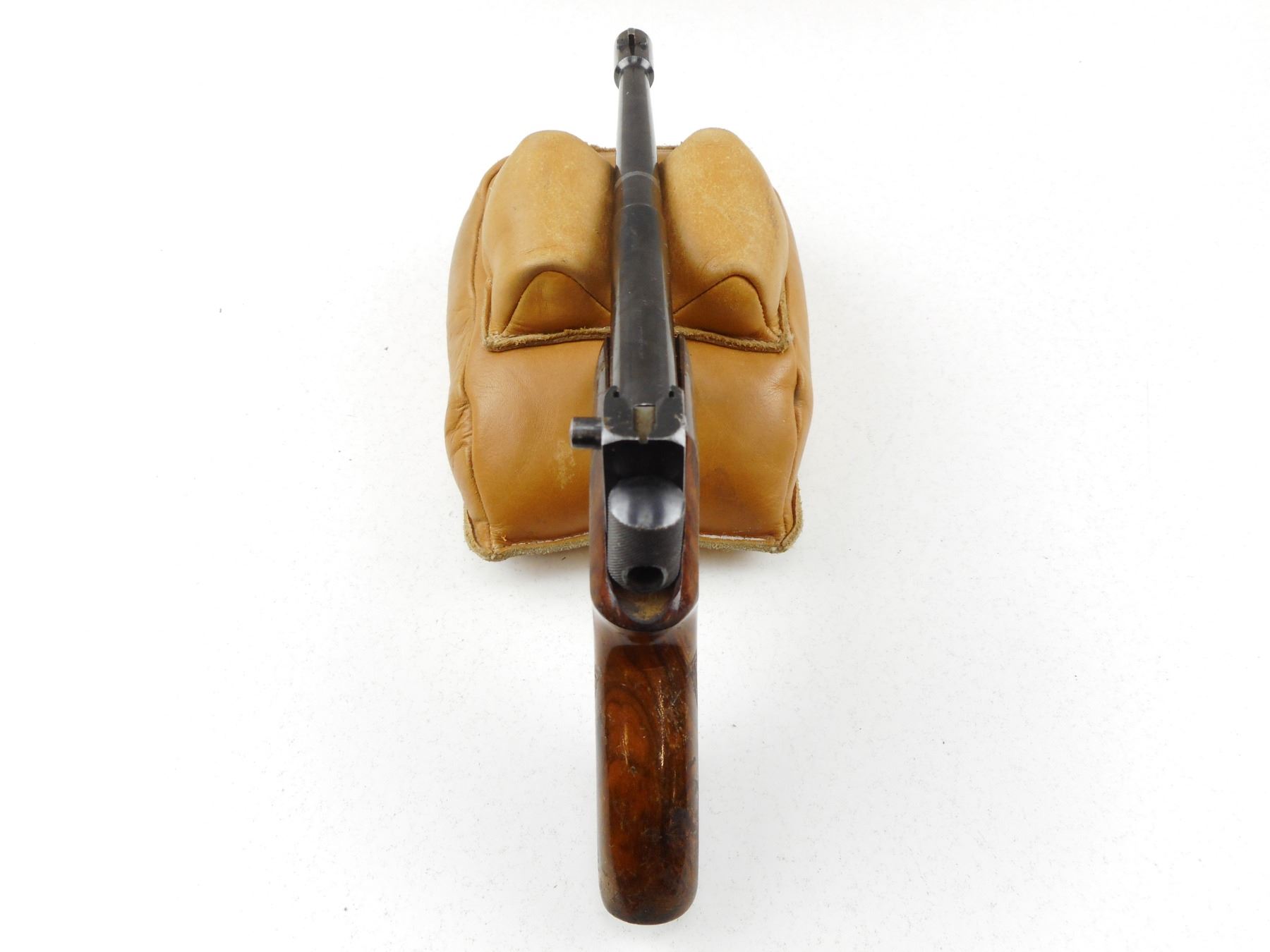 DRULOV , MODEL: PAV , CALIBER: 22 LR , SINGLE SHOT PISTOL, BLADE FRONT AND FIXED REAR SIGHT, CHECKERED WOOD GRIP PANELS THAT ARE CHIPPED NEAR TRIGGER GUARD, SHOWS SOME HANDLING MARKS, EXCELLENT BORE , ACTION: SINGLE SHOT , BARREL LENGTH: 250MM , CONDITION: 5/10 , STOCK # R2993 , SERIAL # 19138 , CLASS: CANADIAN RESTRICTED CLASS