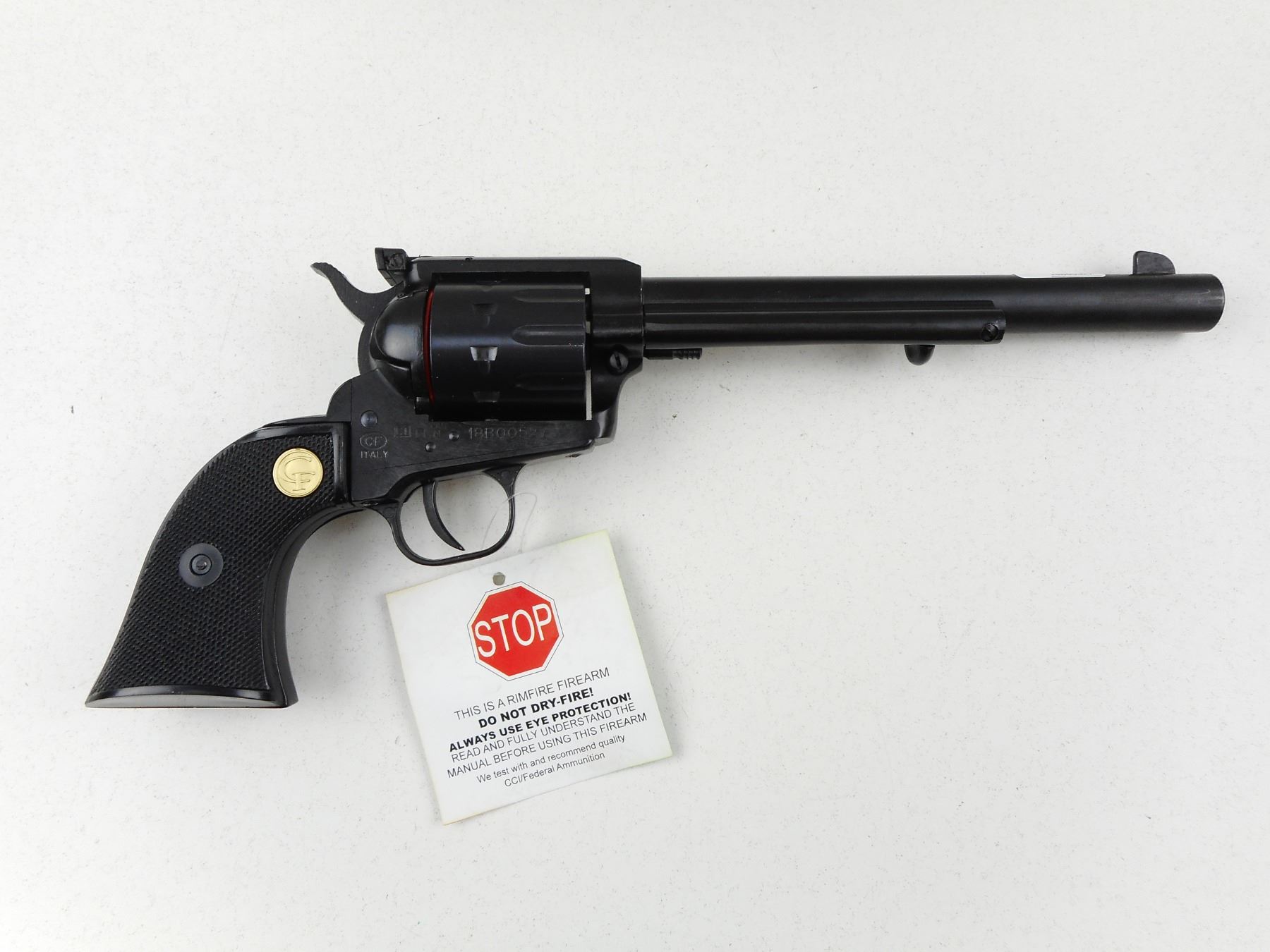 CHIAPPA , MODEL: 1873-22 , CALIBER: 22 LR , COMES WITH A BOX, MANUAL AND CLEANING TOOL, 10 SHOT CAPACITY, BLADE FRONT AND ADJUSTABLE REAR SIGHT, BLACK CHECKERED WOOD GRIP PANELS, APPEARS NEW AND UNFIRED WITH LABELS , ACTION: REVOLVER , BARREL LENGTH: 191MM , CONDITION: 9+/10 , STOCK # R2994 , SERIAL # 18B00527 , CLASS: CANADIAN RESTRICTED CLASS
