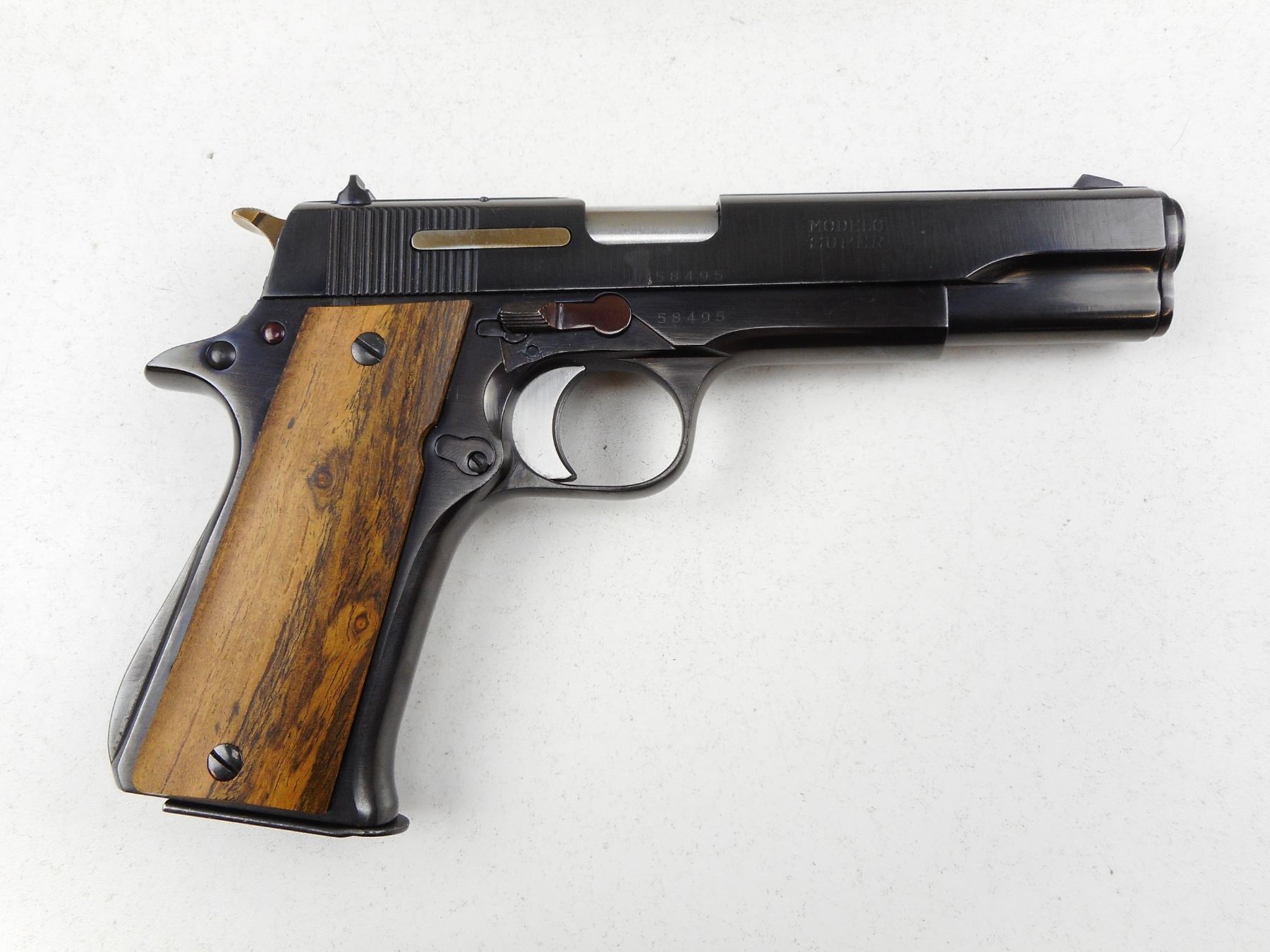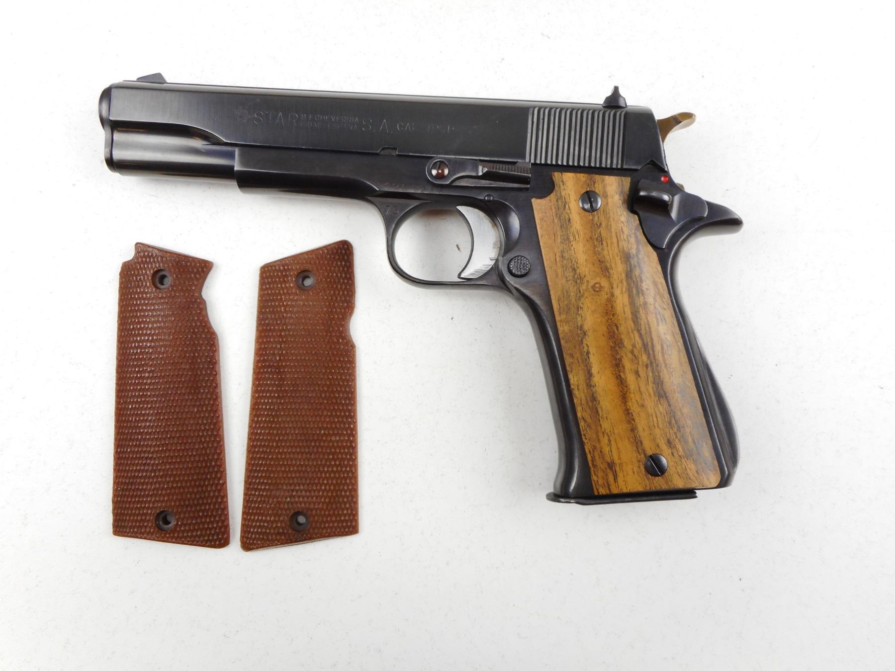 STAR , MODEL: SUPER , CALIBER: 9MM LUGER , COMES WIH MAGAZINE AND SECOND SET OF FACTORY GRIPS, 8 SHOT CAPACITY, BORE IS VERY GOOD, BLADE FRONT AND FIXED REAR SIGHTS, APPEARS TO HAVE BEEN REFINISHED, PLAIN CUSTOM WOOD GRIPS ARE ATTACHED , ACTION: SEMI-AUTOMATIC HANDGUN , BARREL LENGTH: 127MM , CONDITION: 8/10 , STOCK # R3018 , SERIAL # 58495 , CLASS: CANADIAN RESTRICTED CLASS, EXTRA MAGAZINE FOR THIS FIREARM AVAILABLE AS LOT 7790 (SESSION 2)