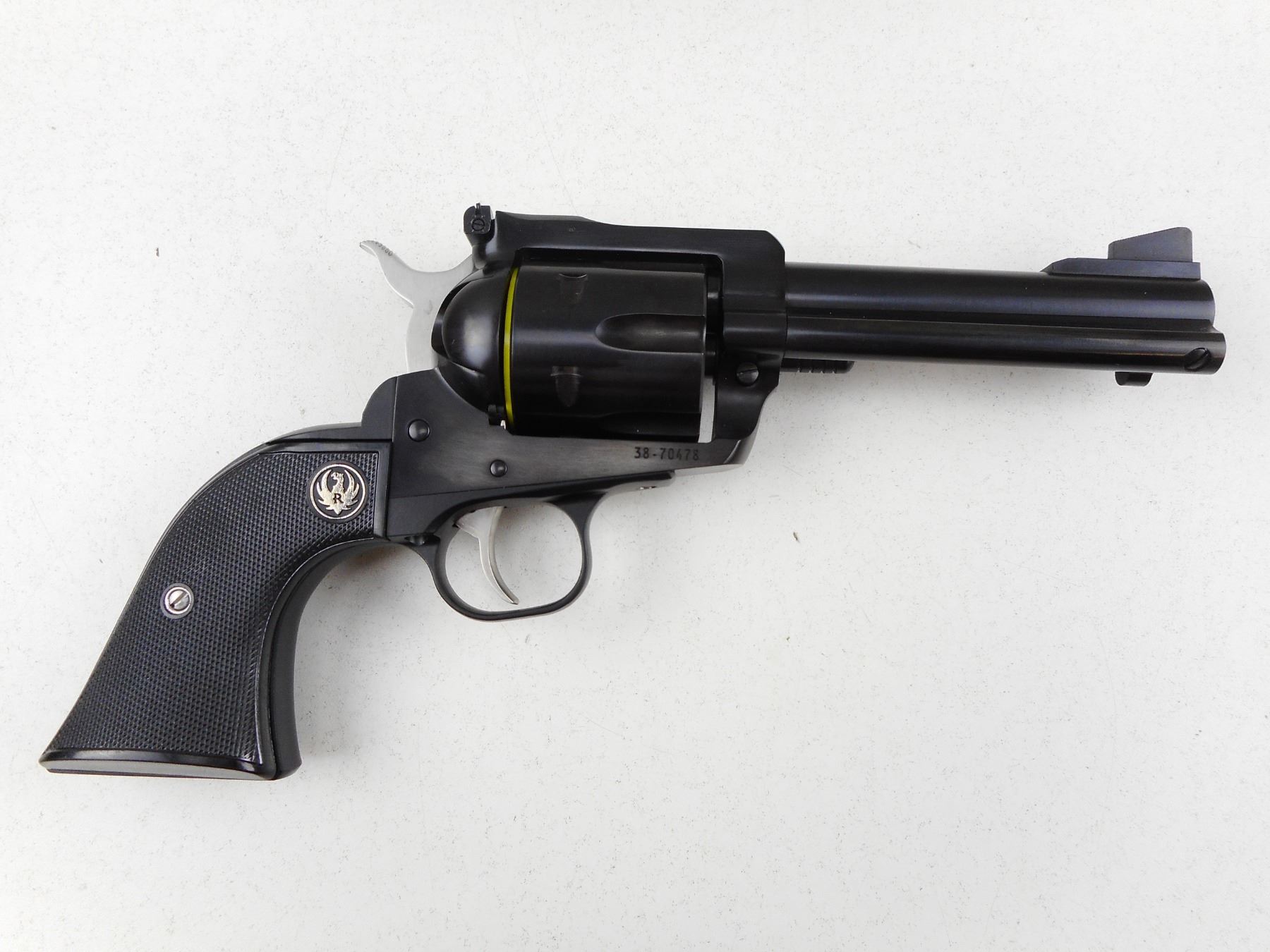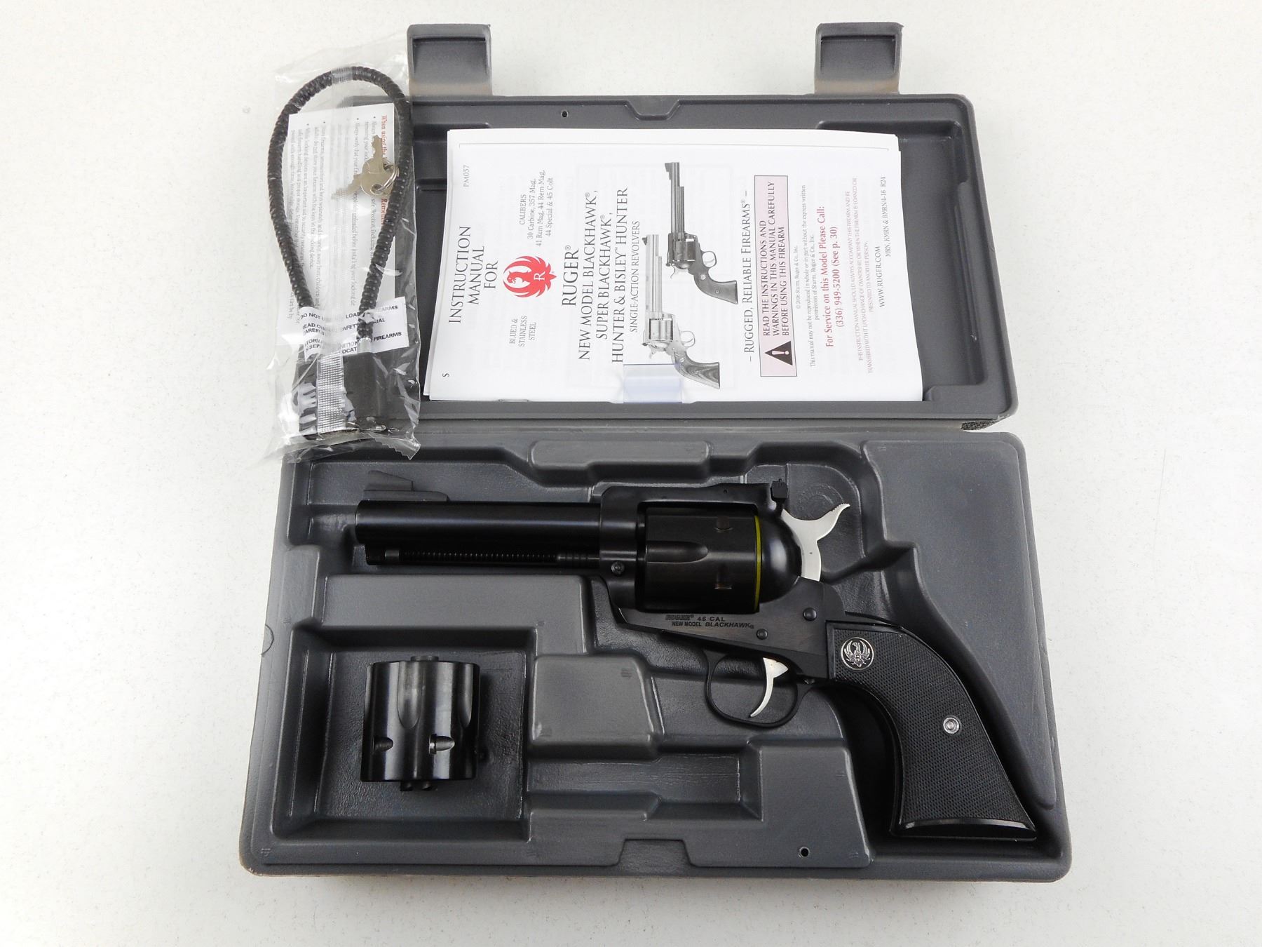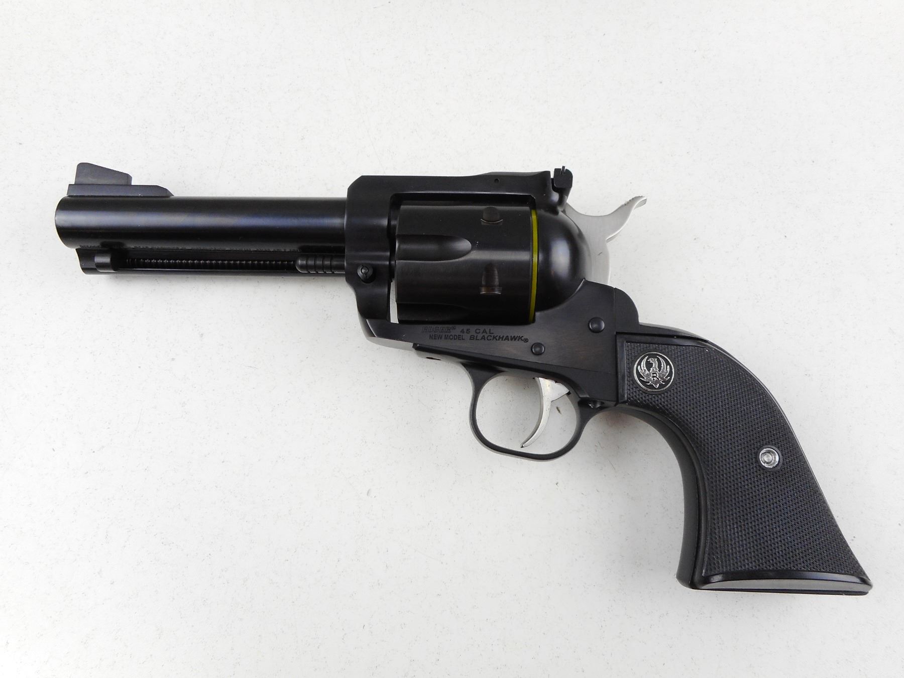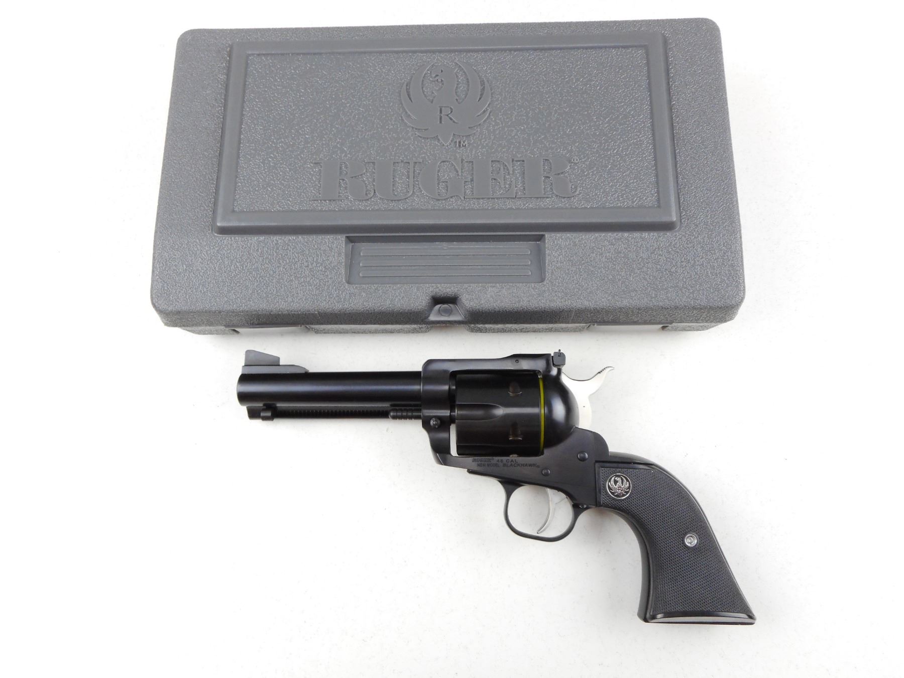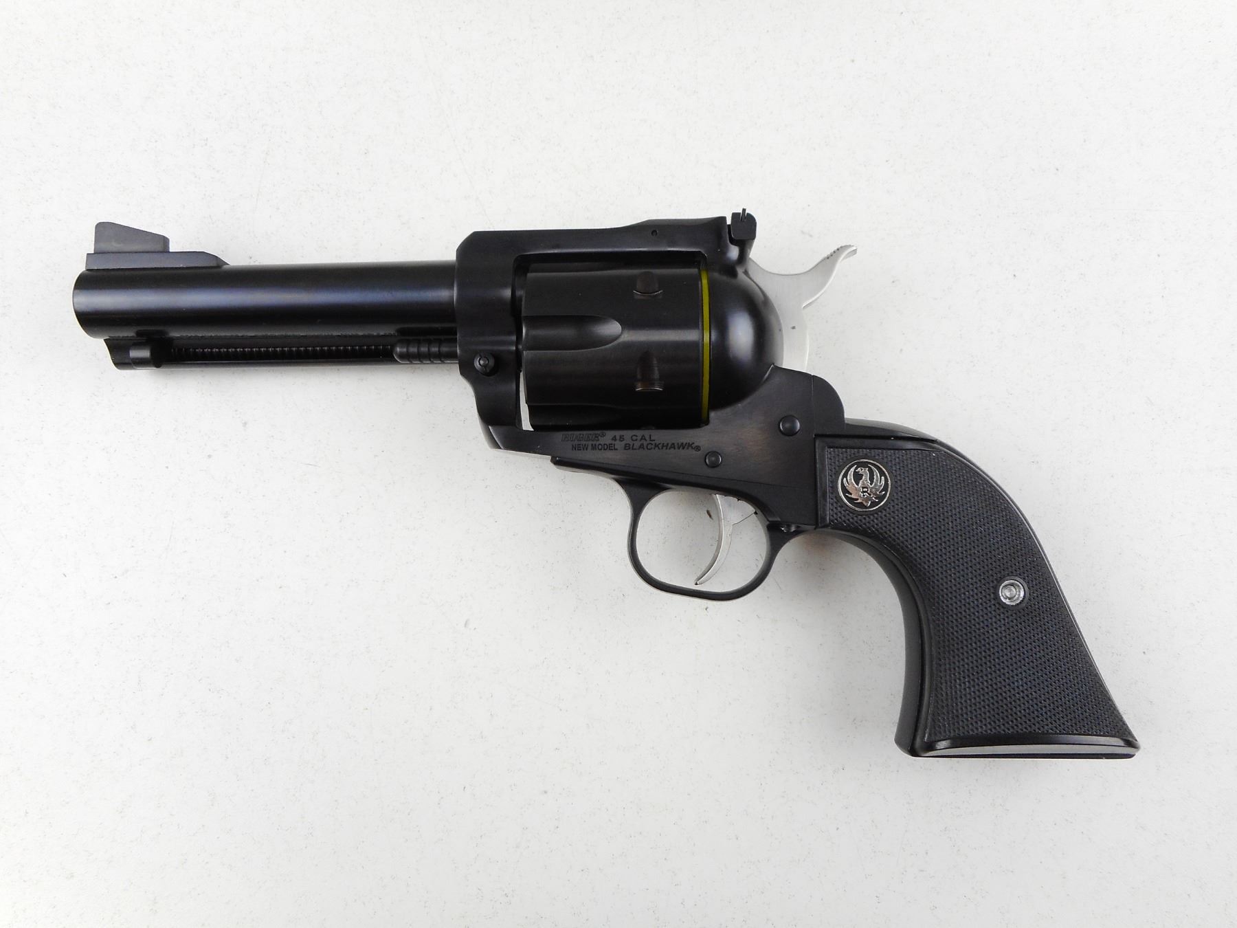 RUGER , MODEL: NEW MODEL BLACKHAWK , CALIBER: 45 CAL , COMES WITH CASE, MANUAL AND LOCK, 2ND CYLINDER, BOTH CYLINDERS ARE MATCHING BY SERIAL #, RAMP FRONT AND ADJUSTABLE REAR SIGHTS, BLACK CHECKERED PLASTIC GRIP PANELS WITH RUGER LOGO, SHOWS VERY LITTLE HANDLING MARKS, BORE IS EXCELLENT , ACTION: REVOLVER , BARREL LENGTH: 117MM , CONDITION: 9/10 , STOCK # R3023 , SERIAL # 3870478 , CLASS: CANADIAN RESTRICTED CLASS
