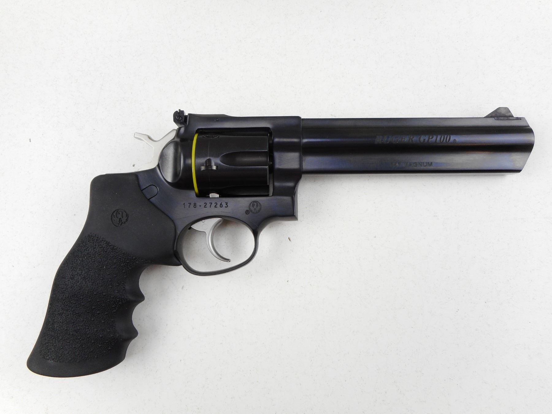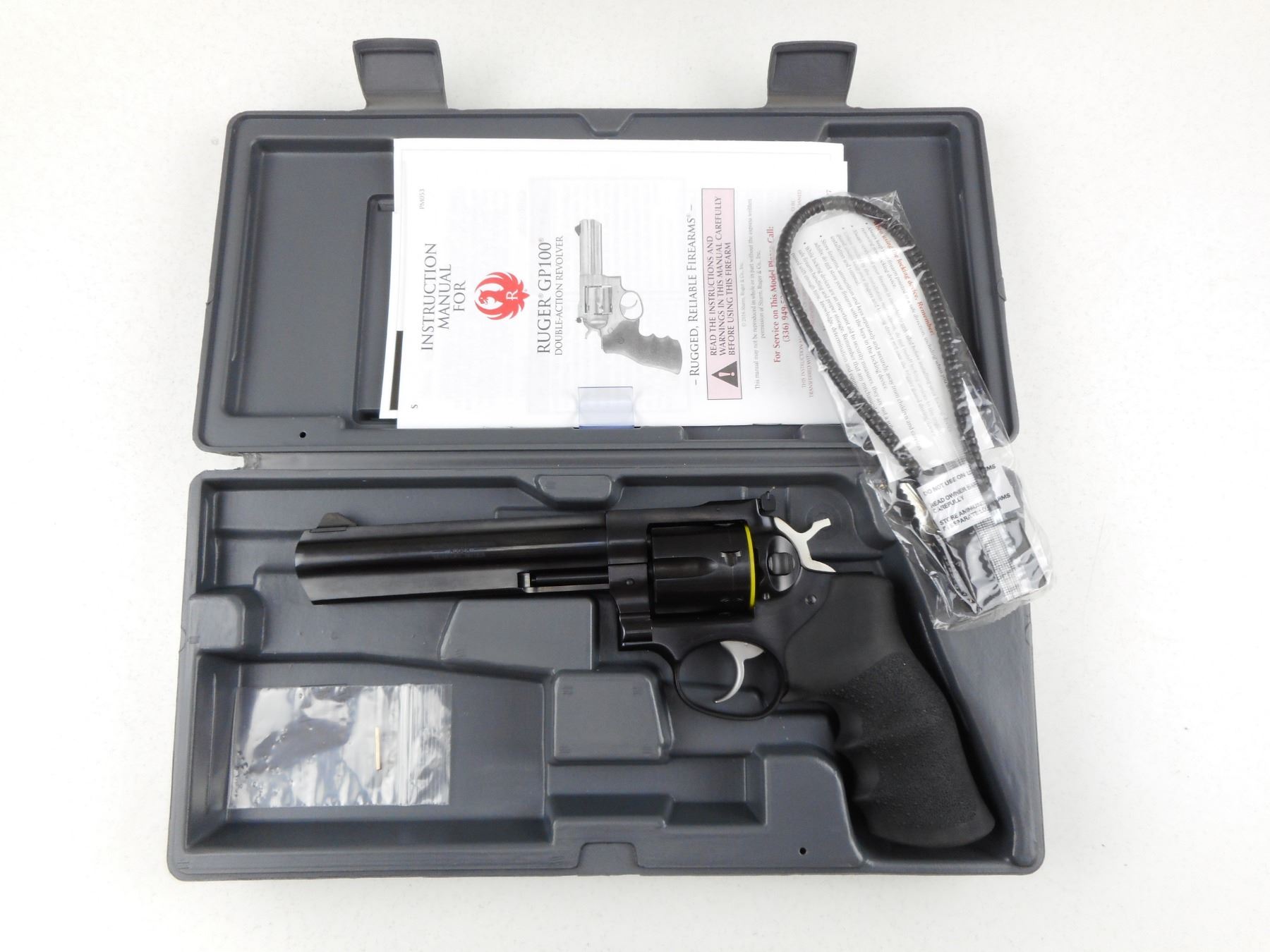 RUGER , MODEL: GP100 , CALIBER: 357 MAGNUM , COMES WITH CASE, MANUAL AND LOCK , 6 SHOT CAPACITY, RAMP FRONT AND ADJUSTABLE REAR SIGHTS, TEXTURED RUBBER GRIPS WITH RUGER LOGO, SHOWS VERY LITTLE HANDLING MARKS, EXCELLENT BORE , ACTION: REVOLVER , BARREL LENGTH: 152MM , CONDITION: 9/10 , STOCK # R3028 , SERIAL # 17827263 , CLASS: CANADIAN RESTRICTED CLASS