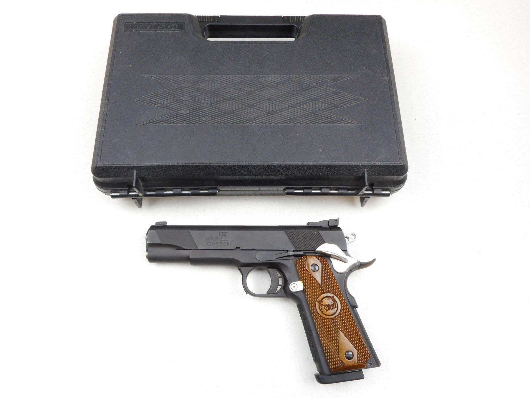 IVER JOHNSON , MODEL: 1911-A1 EAGLE , CALIBER: 9MM LUGER , COMES WITH CASE AND MAGAZINE, EXCELLENT BORE, BLADE FRONT AND ADJUSTABLE REAR SIGHT, COMBAT HAMMER, EXTENDED BEAVER TAIL GRIP SAFETY, SKELETONIZED TRIGGER, CHECKERED WOOD GRIP PANELS, EXTENEDED MAGAZINE RELEASE, APPEARS AS NEW CONDITION , ACTION: SEMI-AUTOMATIC HANDGUN , BARREL LENGTH: 121MM , CONDITION: 9/10 , STOCK # R3074 , SERIAL # CM900046 , CLASS: CANADIAN RESTRICTED CLASS