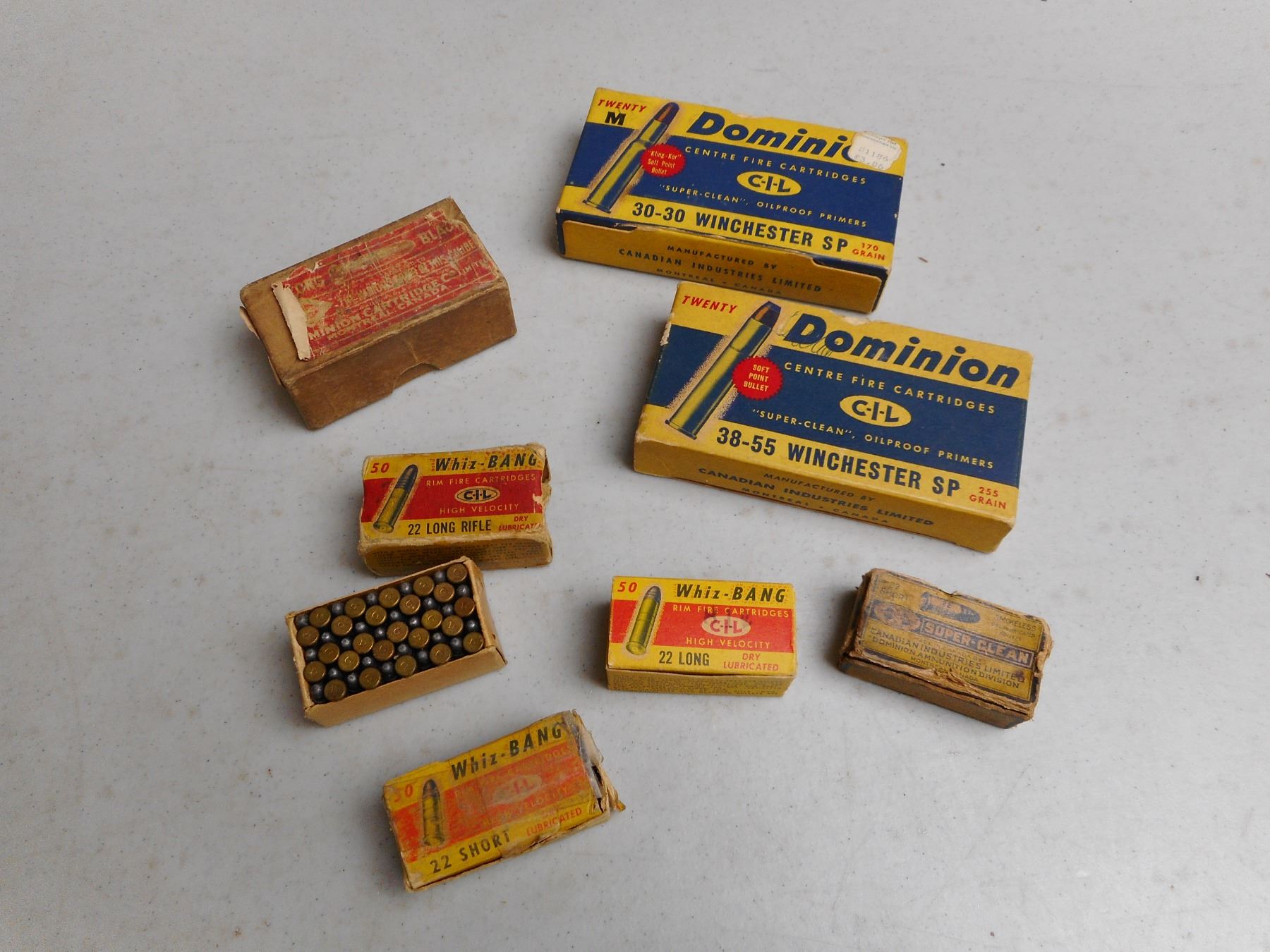 50 RNDS .22 LONG RIFLE AMMO IN CIL WHIZ-BANG VINTAGE BOX, 62 RNDS .22 SHORT IN VINTAGE CIL WHIZ- BANG BOX, AND CIL DOMINION SUPER CLEAN BOX, WHIZ-BANG VINTAGE BOX (22 LONG CIL HIGH VELOCITY), 3 DOMINION VINTAGE AMMO BOXES 38-55, 30-30, 32 LONG