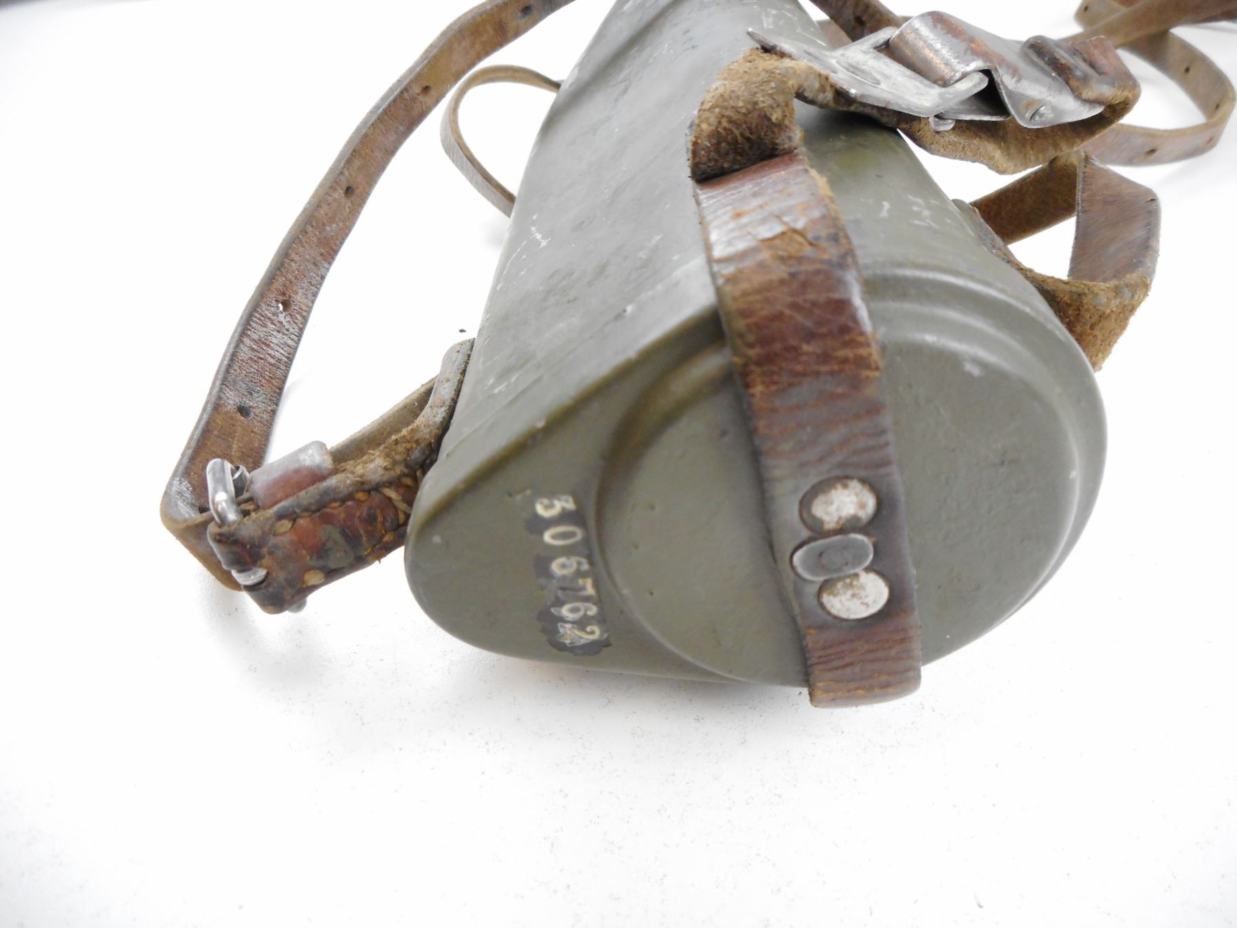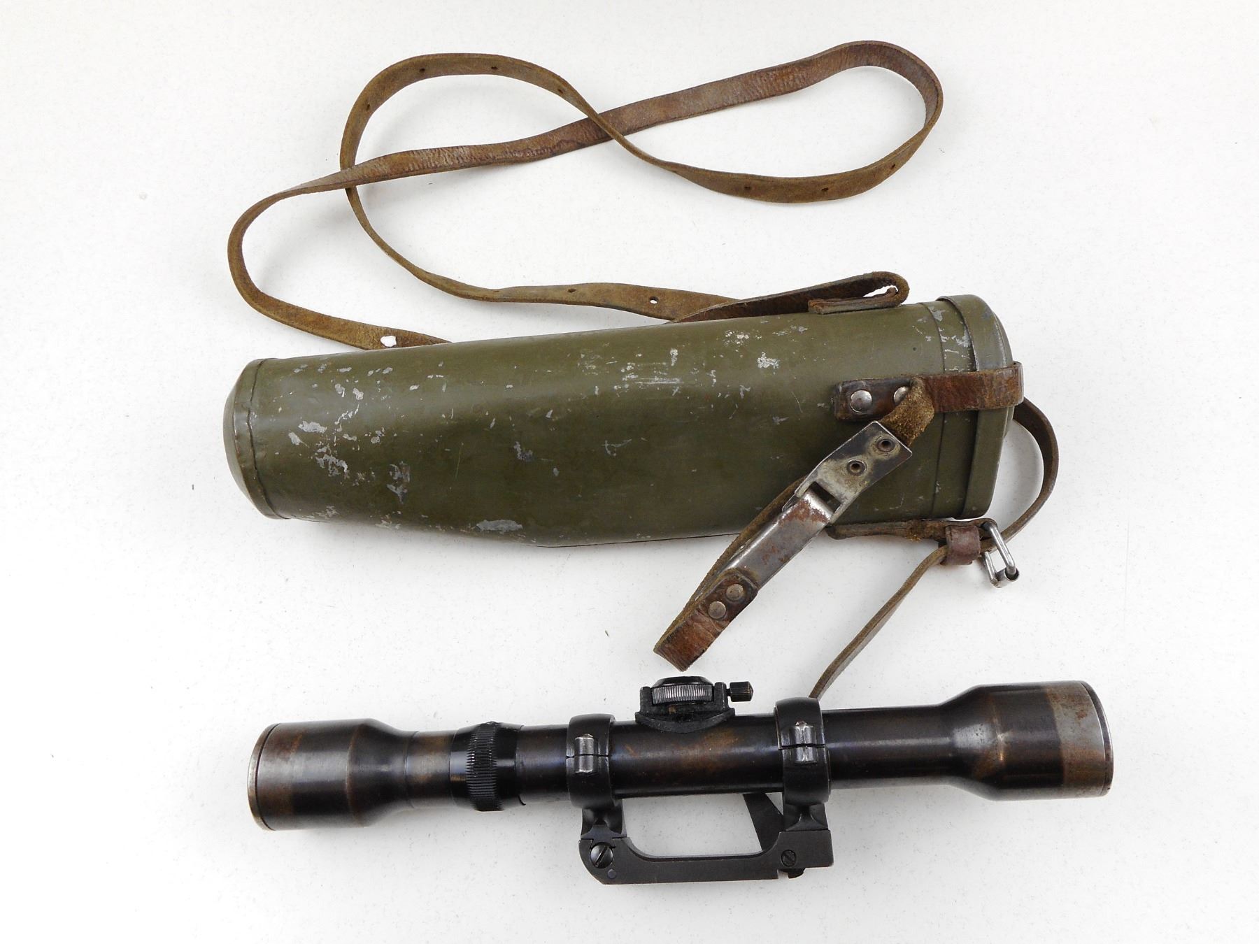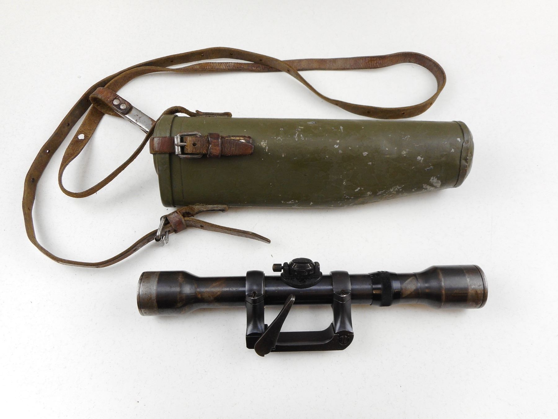 SWEDISH MAUSER SNIPER SCOPE, HAS A MOUNT AND METAL SCOPE CASE WITH LEATHER STRAP AND FASTENERS, FINISH WEAR ON SCOPE AND CASE