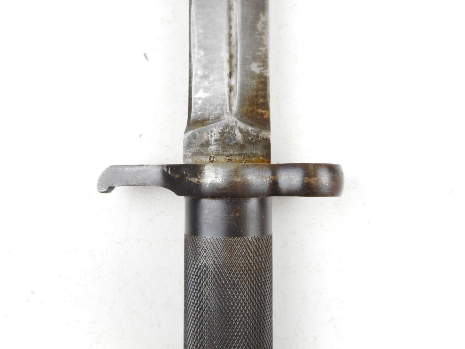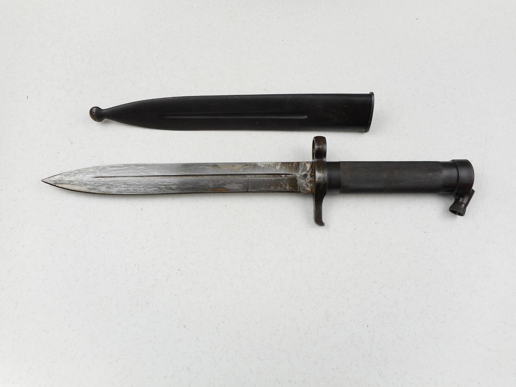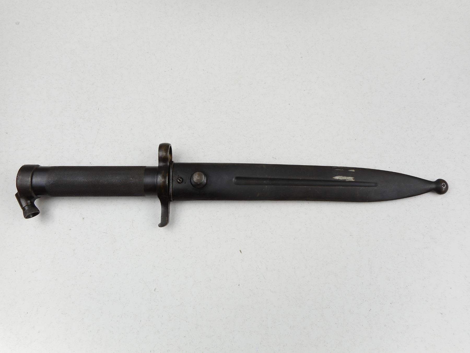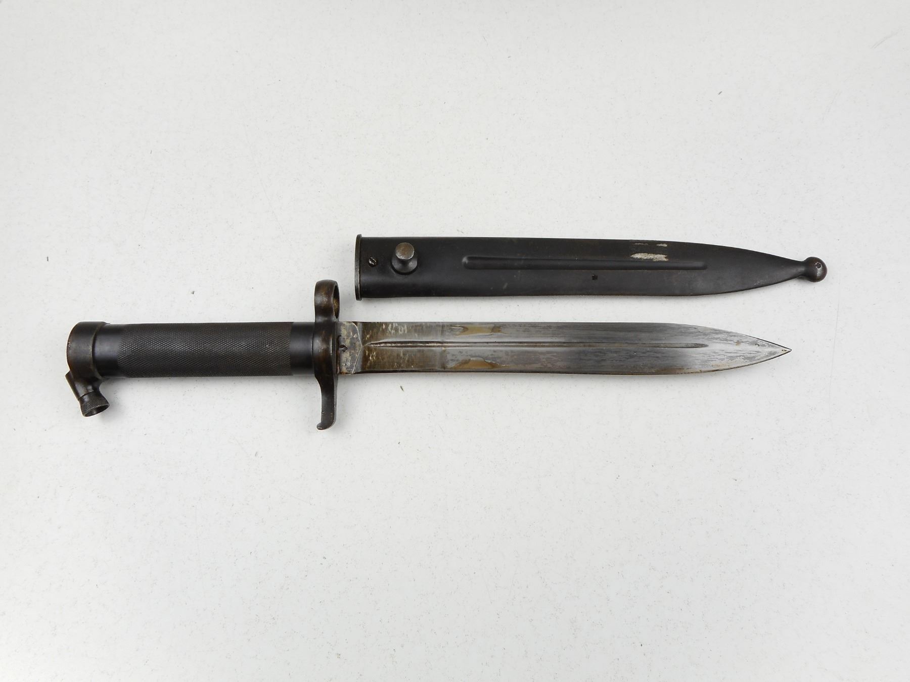 SWEDISH BAYONET WITH SCABBARD , RICASSO MARKED 952, METAL SCABBARD DRAIN HOLE MARKED 498