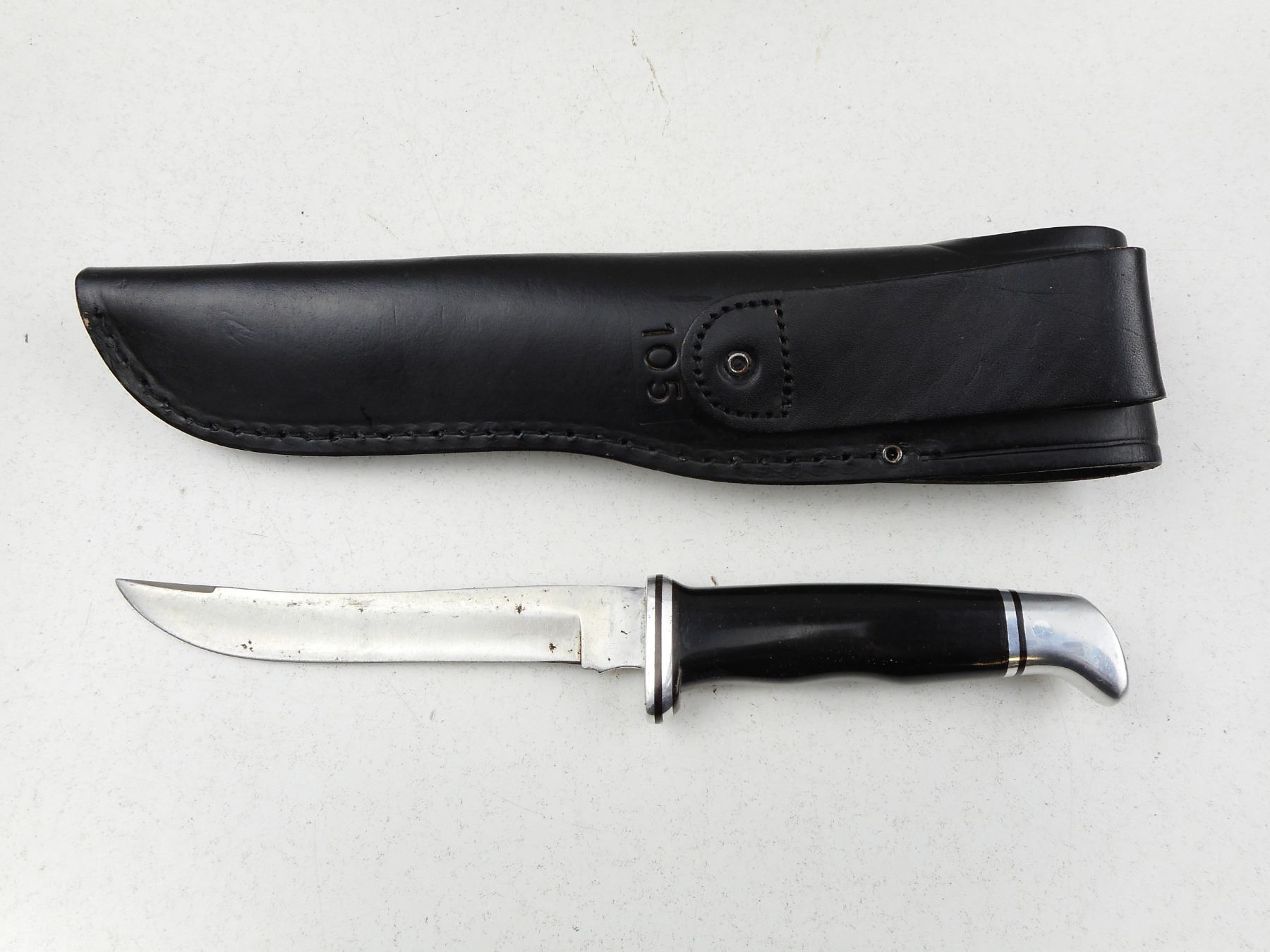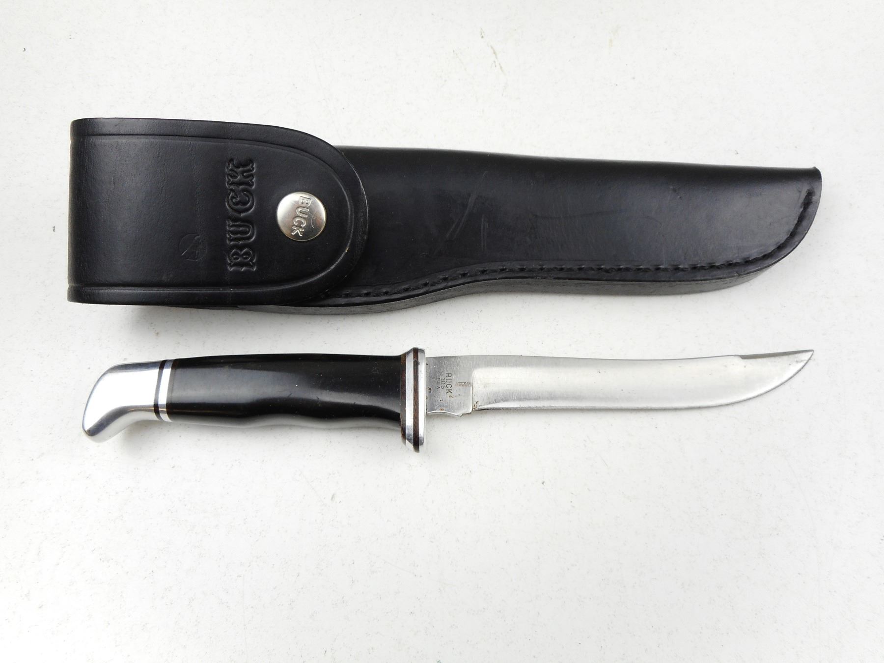 BUCK BELT KNIFE & SHEATH , RICASSO MARKED BUCK 105 U.S.A., 5" BLADE, WITH LEATHER SHEATH ALSO MARKED 105