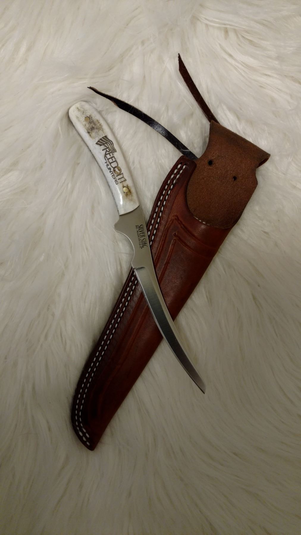 Silver Stag's Fish and Gamer features a 4.25”, handmade D2 Steel Blade (8.75"” Overall), built in full tang construction with Whitetail Deer Scale Handles. If you could only pick one design to use for all of your Hunting and Fishing activities, this would be it! You can skin, bone, cape, fillet, and gut with this particular design -ot includes a handmade, quality, leather pouch sheath. The Silver Stag Fish and Gamer is an excellent game processing knife - it can fillet and gut trout, too! This one is even more special with the Freedom Hunters Logo on the handle.
