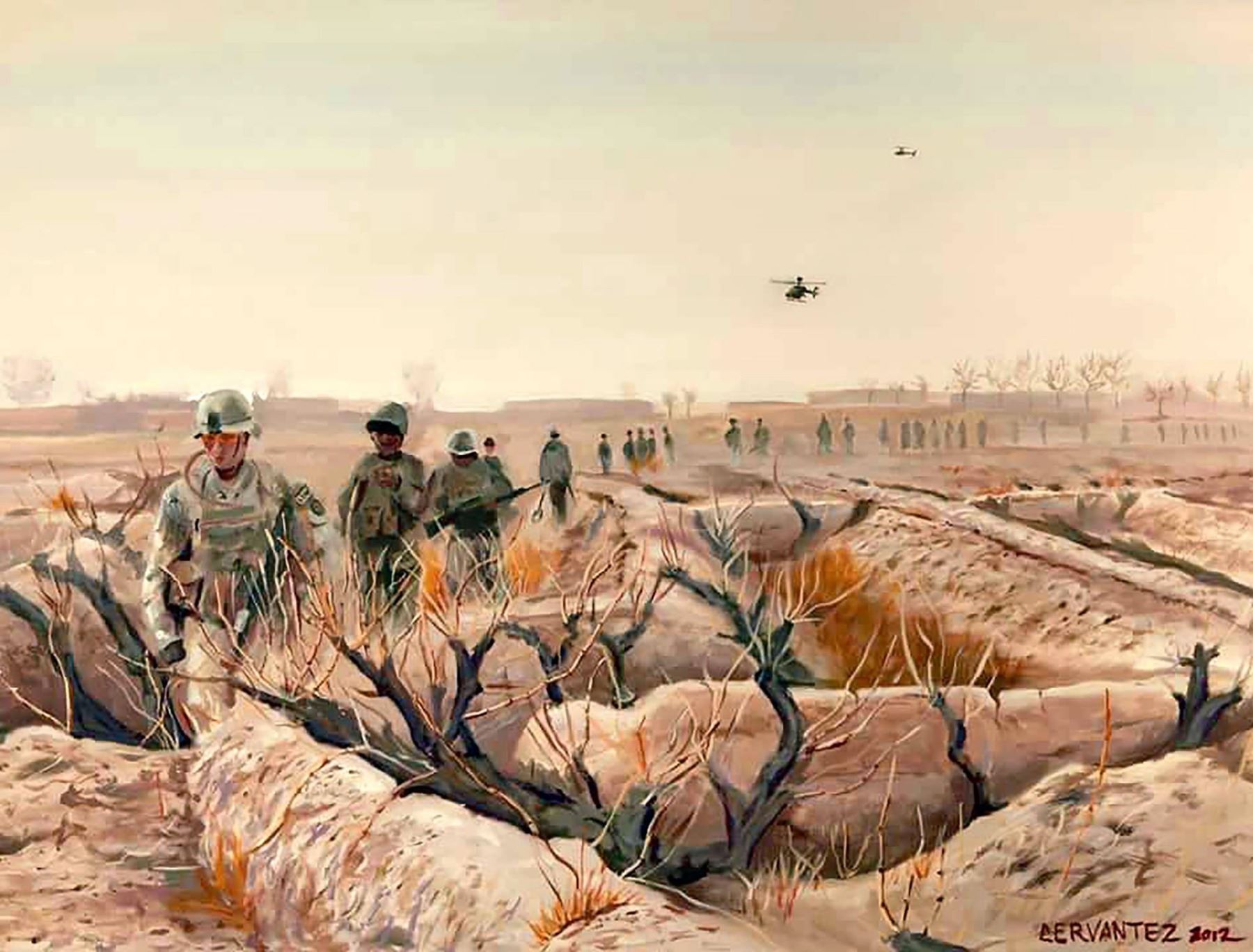 Martin J. Cervantez who enlisted in the Army Signal Corps in July 1986 as an Illustrator. Martin is a self-taught artist who has been creating works since his childhood. During Cervantez's Afghanistan deployment in support of Operation Enduring Freedom in 2008 and 2011, he visually recorded Soldiers’ experiences the Army’s achievements. Two of his oil paintings were recently featured in the National Constitution Center’s public exhibition “Art of the American Soldier” in Philadelphia. His most recent project was the Berlin Airlift mural this past summer in Wiesbaden, Germany. The piece is signed, numbered, matted and framed.