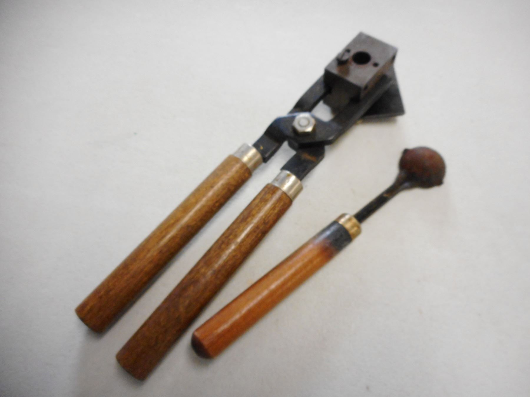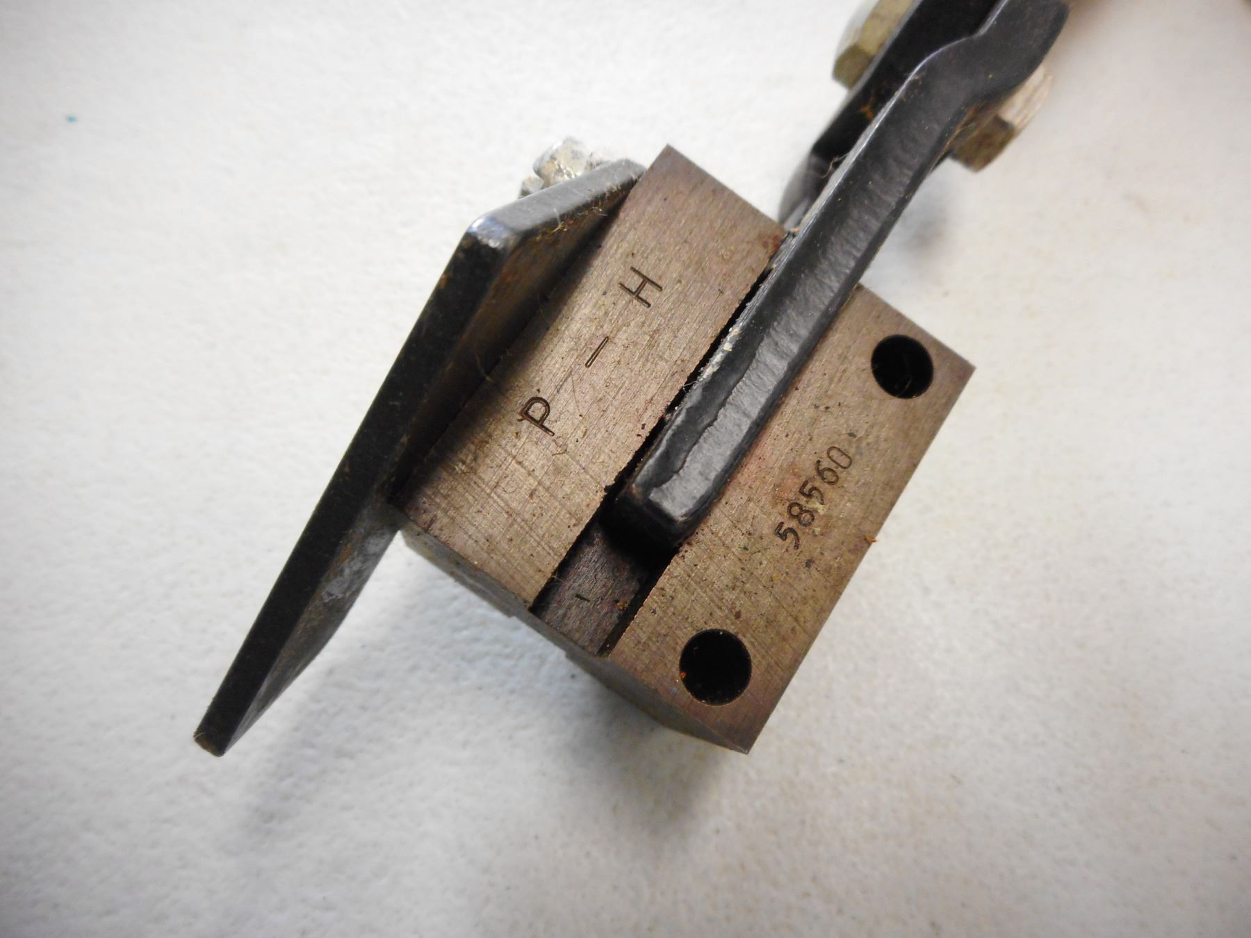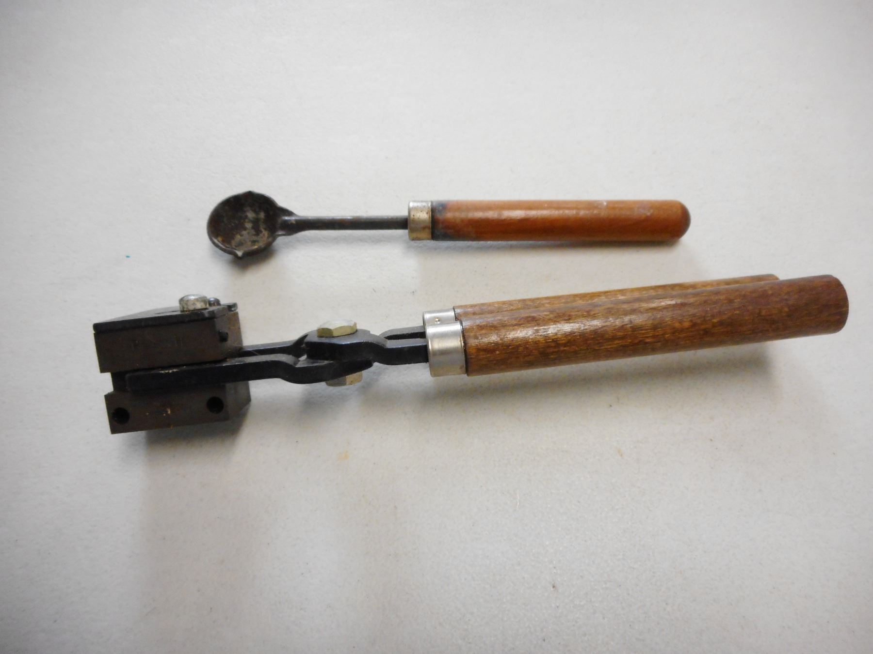 BULLET MOLD STAMPED P-H 58560 WITH WOODEN HANDLES & LEAD DIPPER