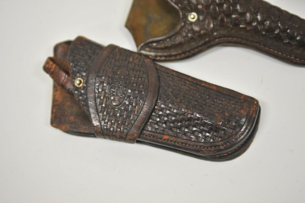 Lot of 3 carved leather holsters; one un-marked, one a desirable single loop A.W. Brill/Maker/Austin, Tex. and one modern marked “Made in Mexico” in Spanish. Est.: $100-$300.