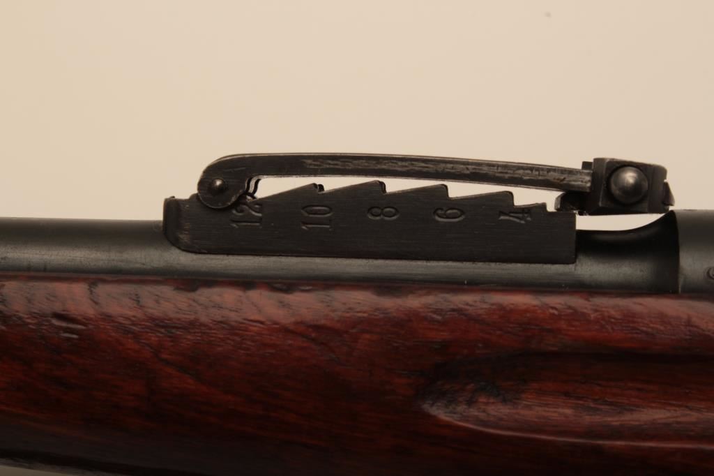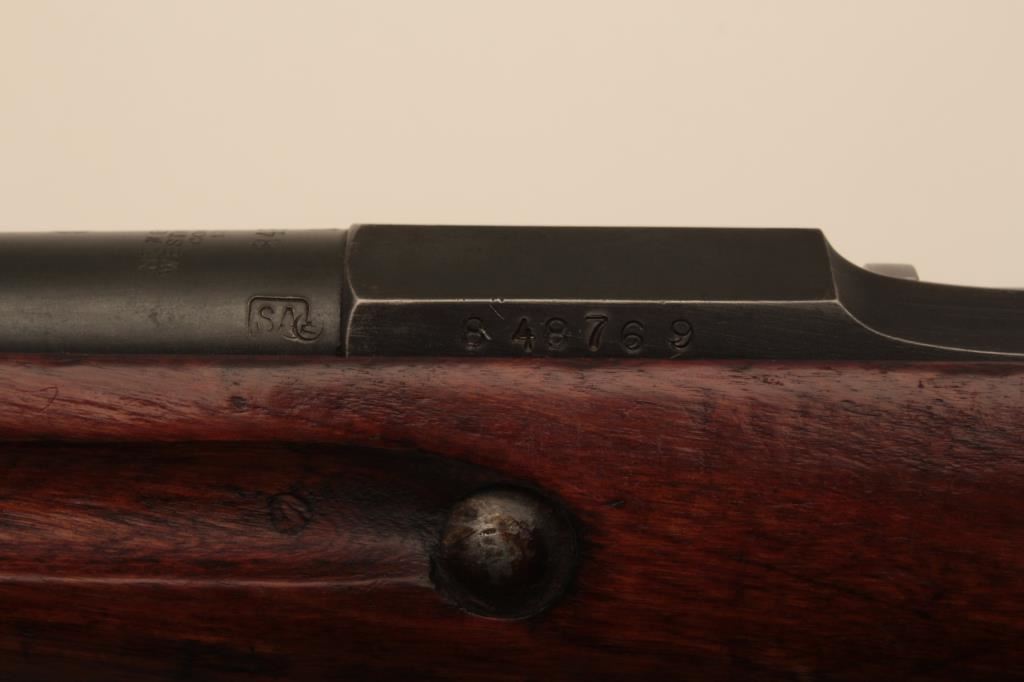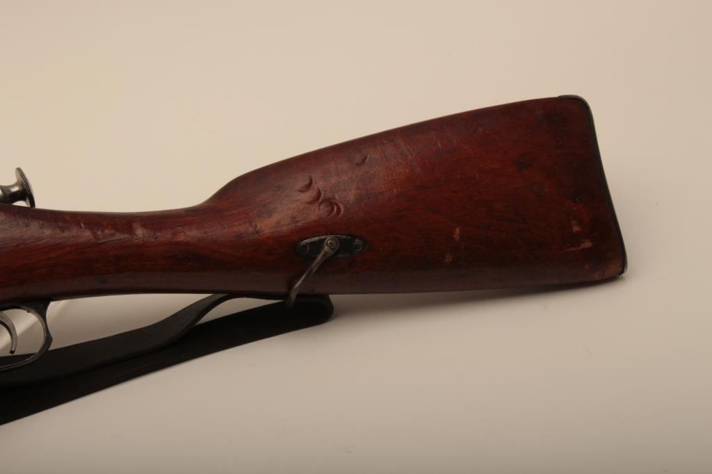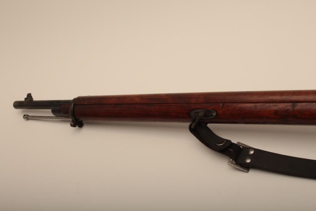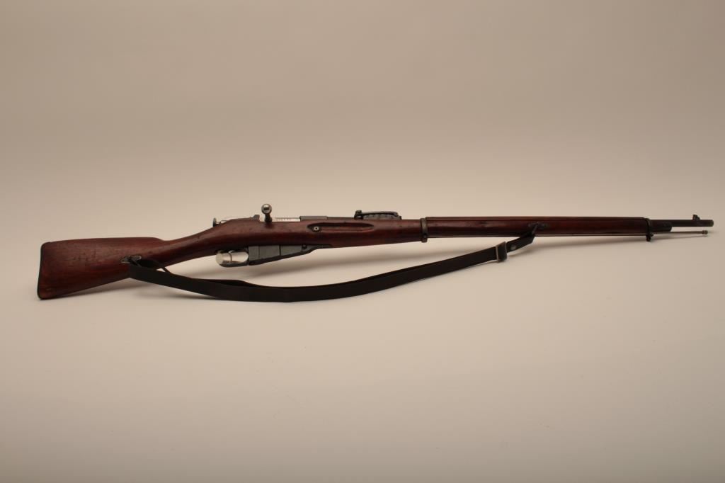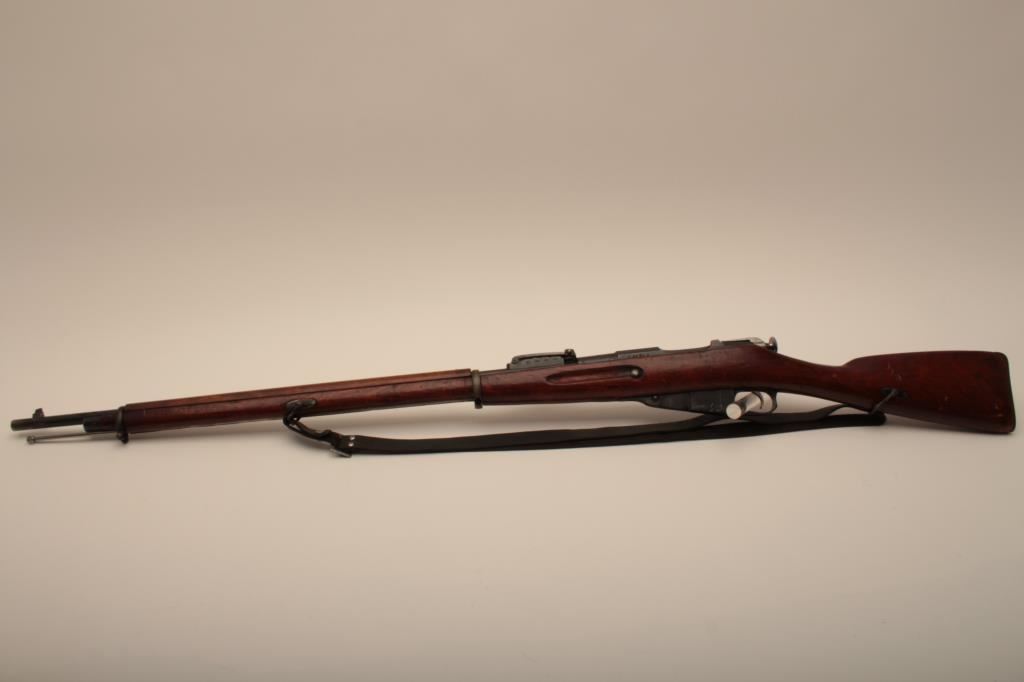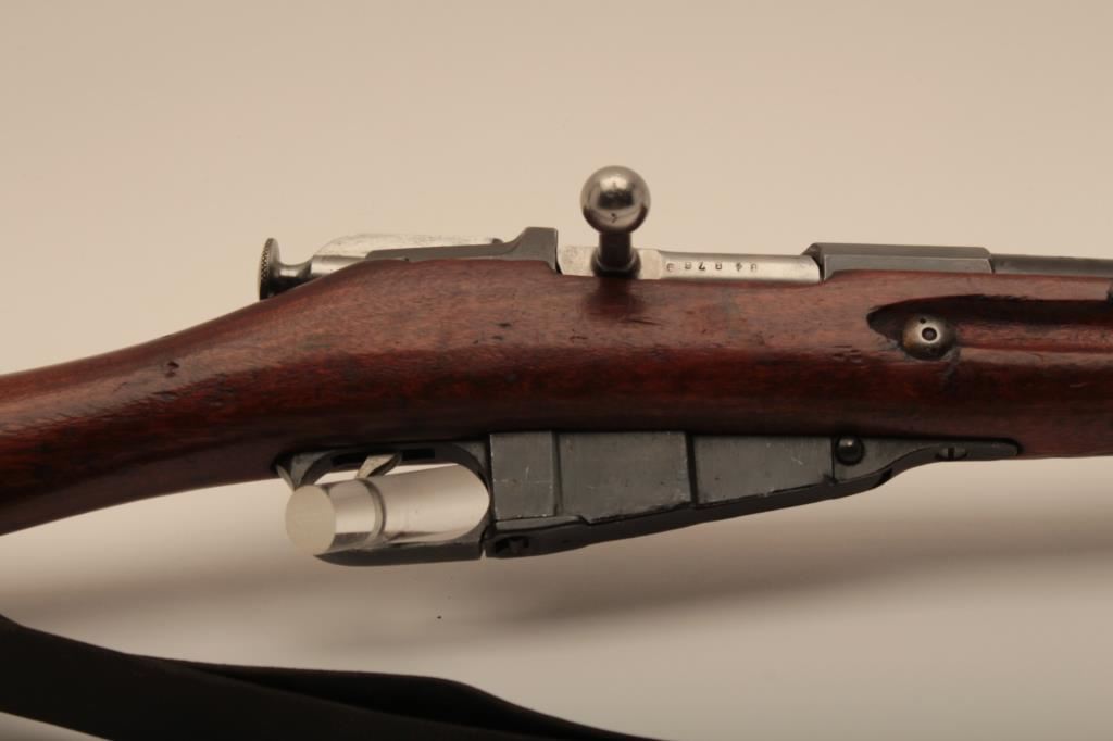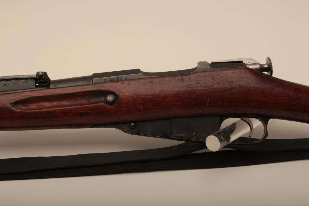 Russian Mosin-Nagant Model 91 bolt action rifle with Westinghouse marked hexagon receiver, 7.62 x 54R caliber, Serial #848769. The rifle is in very good overall condition with a 31 ½” barrel with a blade front and military tangent style rear sights. The metal parts retain the majority of their military finish with losses at the muzzle and high point edge wear on the receiver. The front ring is marked Westinghouse and dated 1915. Additionally, the receiver is marked with an, “SA” in a circle indicating the rifle was captured by the Finnish army and put back into service. The smooth wood stock is in good condition showing moderate to heavy use with dents, mars and compressions. The butt ends with smooth, steel butt plate. The rifle retains the sling swivels, cleaning rod and includes a period leather, military style sling. The bore is good, the markings are sharp and the action is crisp on this World War I era Mosin-Nagant by Westinghouse. Est.: $300-$600. (C+R).