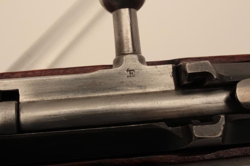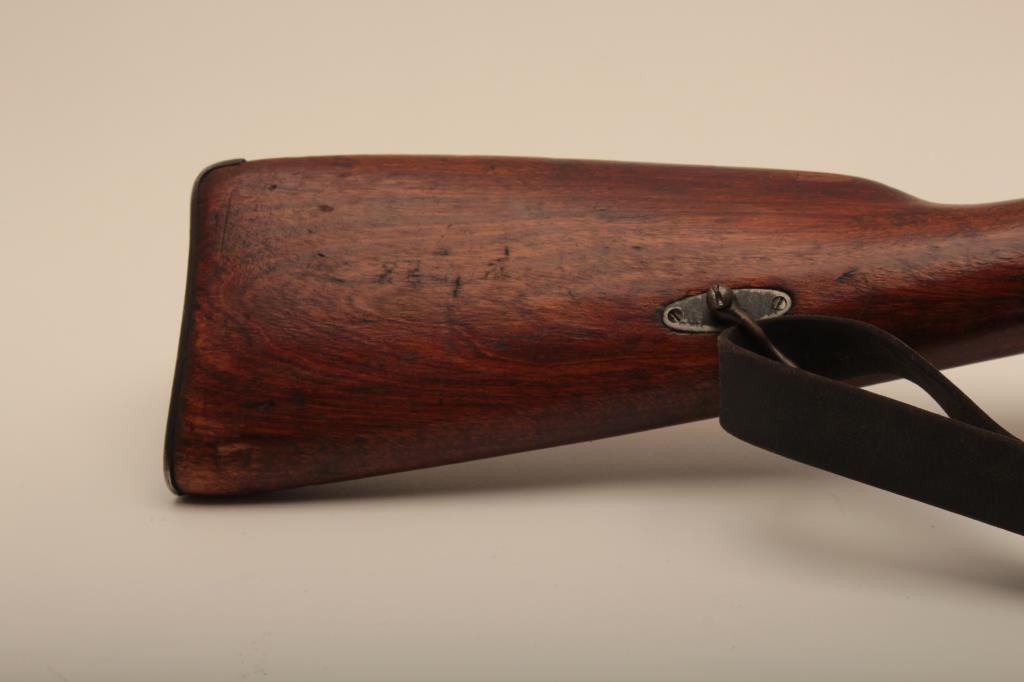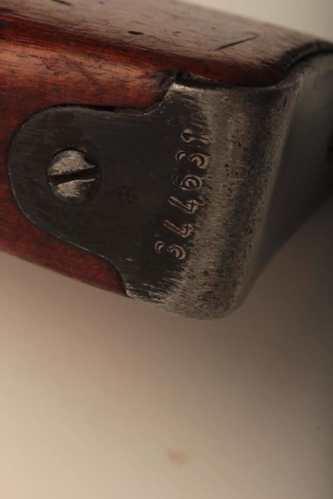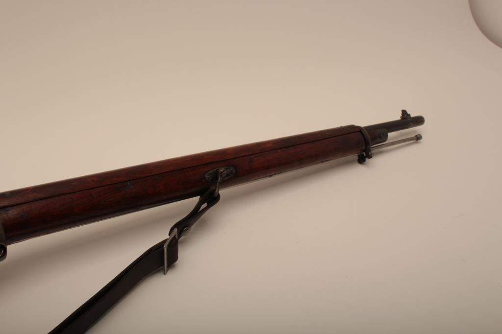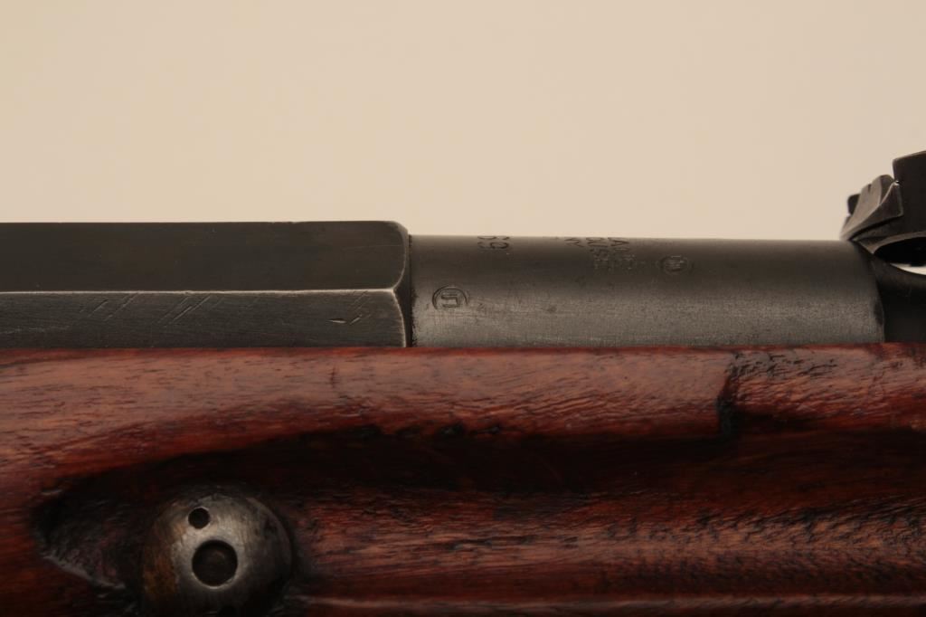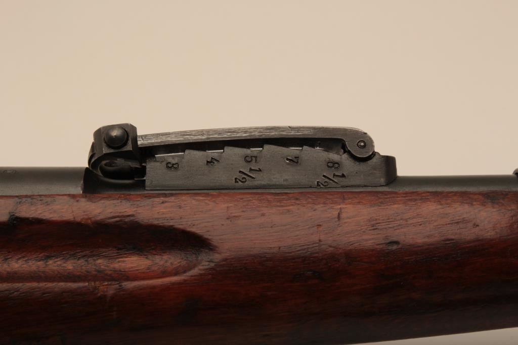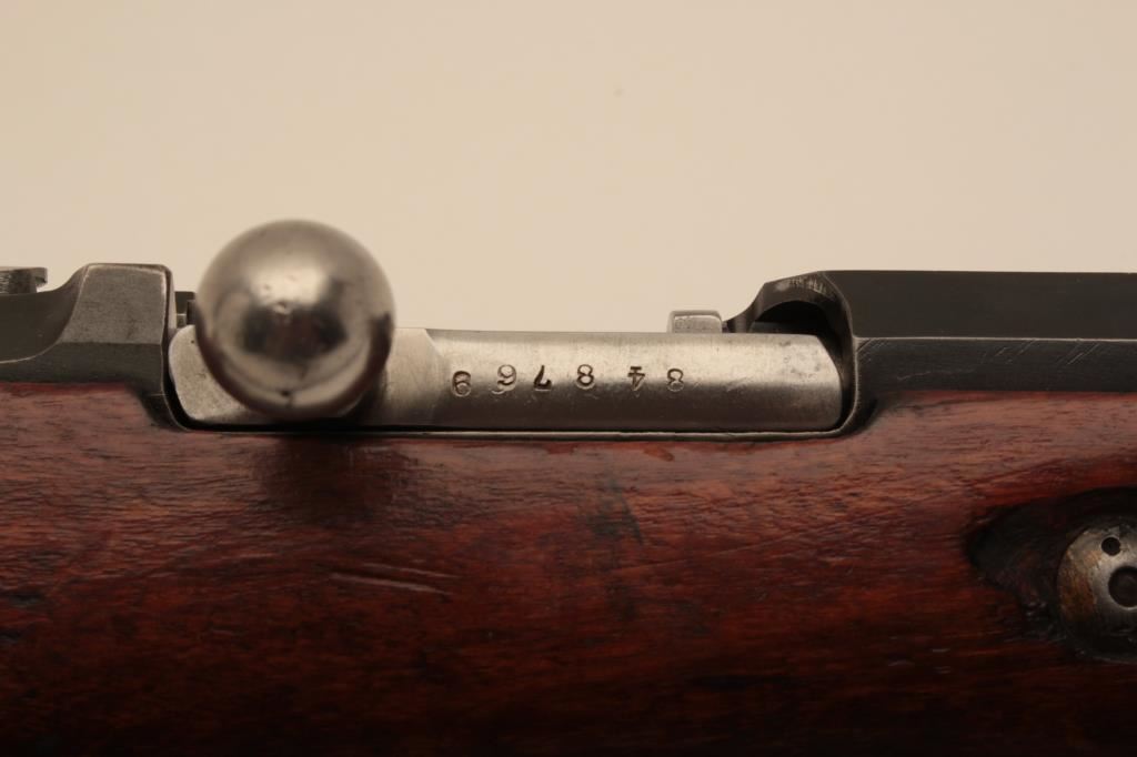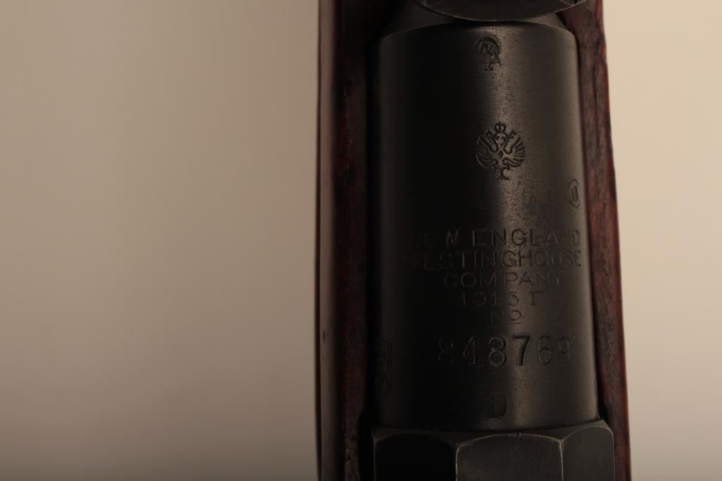 Russian Mosin-Nagant Model 91 bolt action rifle with Westinghouse marked hexagon receiver, 7.62 x 54R caliber, Serial #848769. The rifle is in very good overall condition with a 31 ½” barrel with a blade front and military tangent style rear sights. The metal parts retain the majority of their military finish with losses at the muzzle and high point edge wear on the receiver. The front ring is marked Westinghouse and dated 1915. Additionally, the receiver is marked with an, “SA” in a circle indicating the rifle was captured by the Finnish army and put back into service. The smooth wood stock is in good condition showing moderate to heavy use with dents, mars and compressions. The butt ends with smooth, steel butt plate. The rifle retains the sling swivels, cleaning rod and includes a period leather, military style sling. The bore is good, the markings are sharp and the action is crisp on this World War I era Mosin-Nagant by Westinghouse. Est.: $300-$600. (C+R).