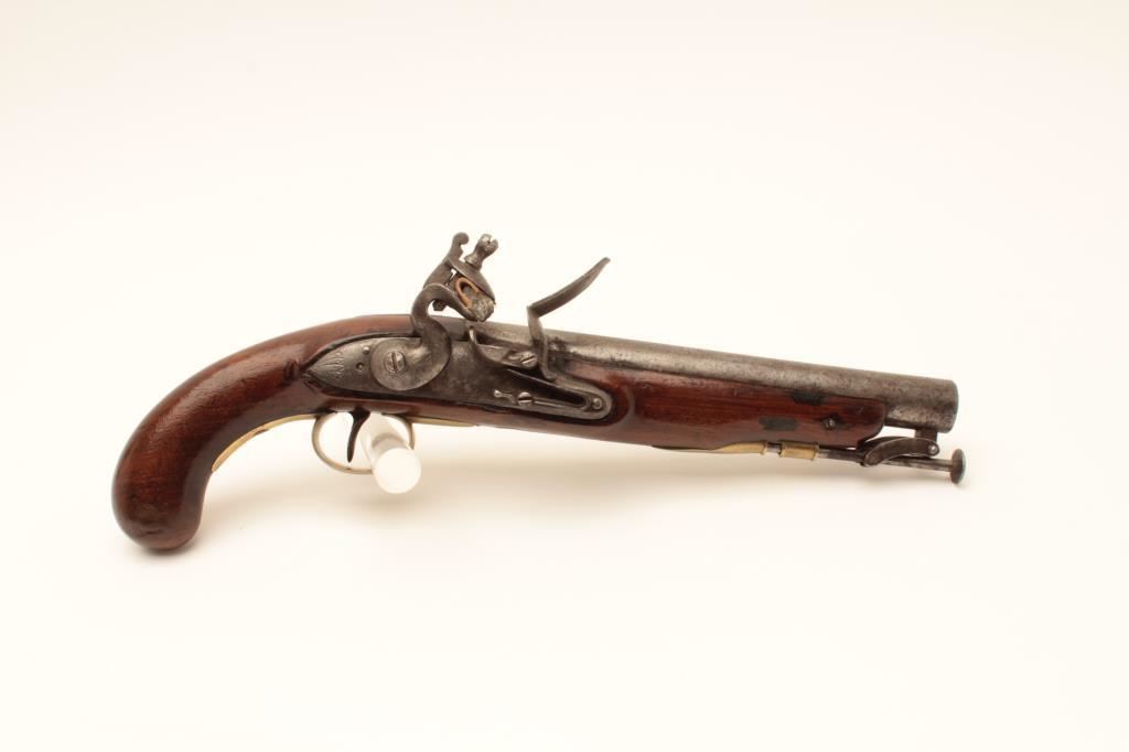 British Military style flintlock pistol with attached ramrod circa late 18th to early 19th century. Brass mounts with lazy S side plate. Measures 15” overall with a 8 ¾” round and thick walled barrel of .75 caliber smoothbore. Broad head proof on lock beneath pan with no arsenal stampings and light engraving. The barrel is British proofed. Curious that lock and hammer are engraved with no arsenal stamps but showing military type proof. A small contract or merchant marine? The pistol is in good condition with cleaned to gray metal patina showing light to slightly heavy scattered pitting. Original flintlock parts. The stock shows a coating of clear varnish or shellac with small repairs and minor imperfections. Working but main spring weak. (Antique) Est.: $350-$700