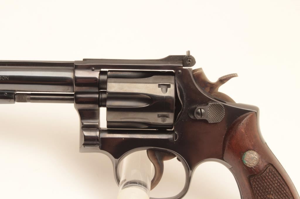 Smith & Wesson Model 48 (no dash) DA revolver, .22 M.R.F. caliber, 8-3/8” barrel, blued finish, checkered wood medallion grips, S/N 5K91981; like new in factory two piece cardboard box with end label numbered to this gun; cleaning tool included. (Modern/NO CAL. SALE). Est.: $700-$1,400.