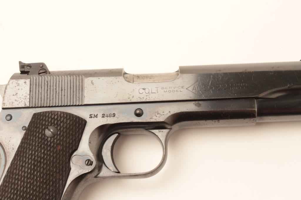Colt Service Model Ace semi-automatic pistol, .22LR caliber, 5” barrel, blued finish, two tone magazine, checkered wood grips, S/N SM 2489; overall fine to excellent condition displaying majority of its blued finish, fine bore, crisp action, sharp markings including “W.B.” inspection on left side of frame above magazine release and fine grips; accompanied by a factory letter confirming caliber, barrel length and finish (stocks “Not Listed”); shipped to Commanding General, Springfield Armory, Springfield, Massachusetts on Dec. 16, 1941, Colt factory order #9966, 60 guns in shipment. (C&R/NO PPT). Est.: $2,000-$4,000.