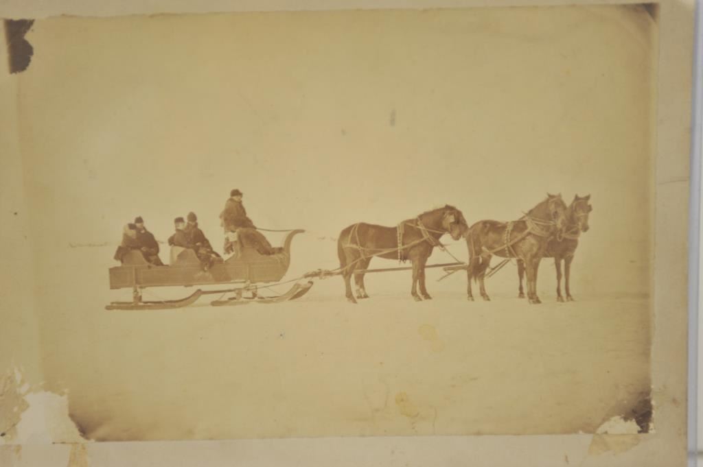 Two original cabinet photos from the Frost Custer Album Collection (Lot 7087 of Butterfield’s catalog of 3/27/02; one showing Tom Custer, Nellie Wadsworth and W.W. Cooke in horse drawn sleigh; the other an unpublished photo showing George A. Custer, Libbie Boston Custer, Tom Custer and Maggie Calhoun in a horse drawn sled. Est.: $1,500-$3,000.