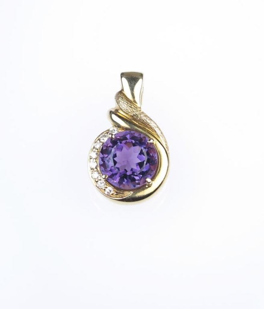 Vivid Amethyst and Diamond Pendant featuring a round cut Amethyst weighing approx. 5.00-6.00 carats accented with 8 round cut Diamonds within a heavy setting of 14 karat yellow gold. Retail $1,500-$2,000 Estimates $800-$1,200