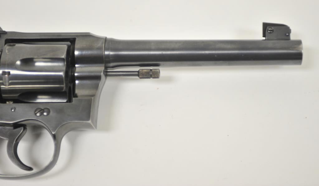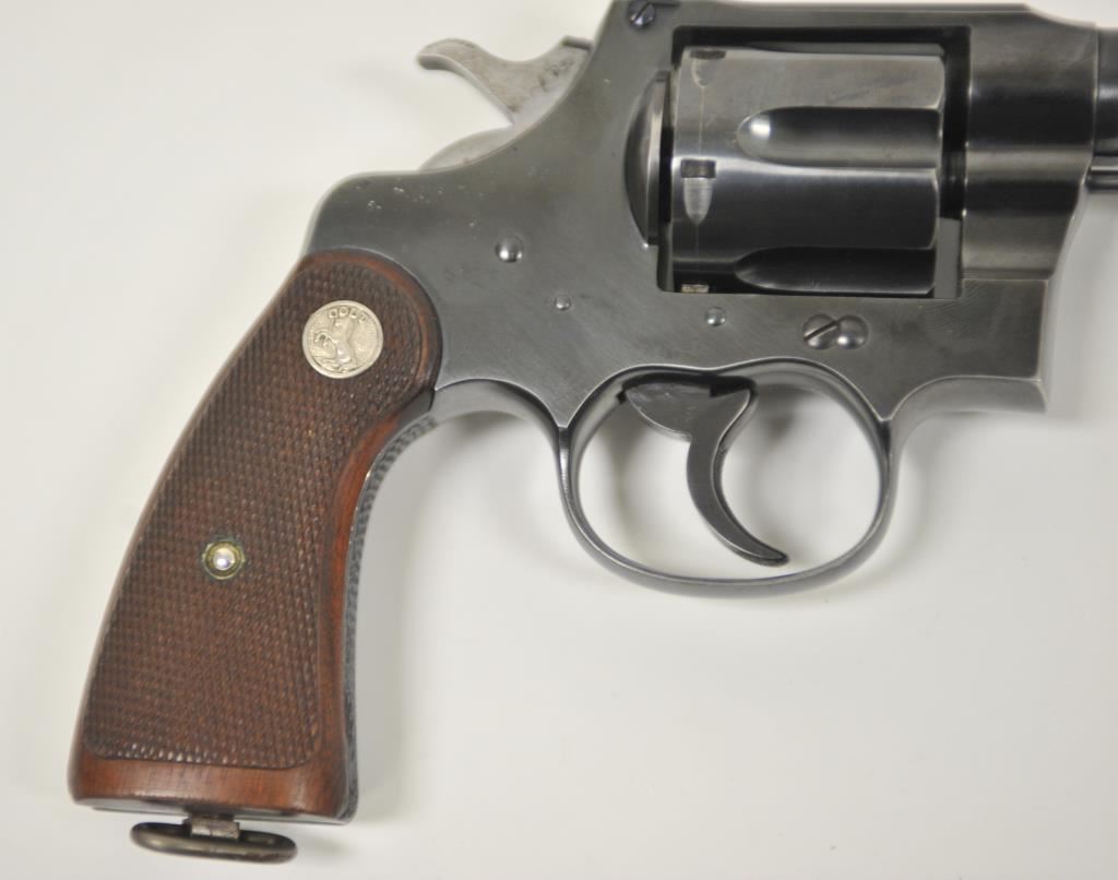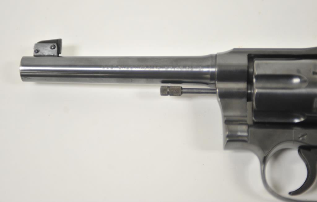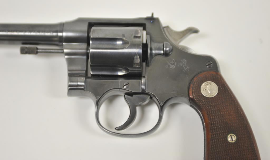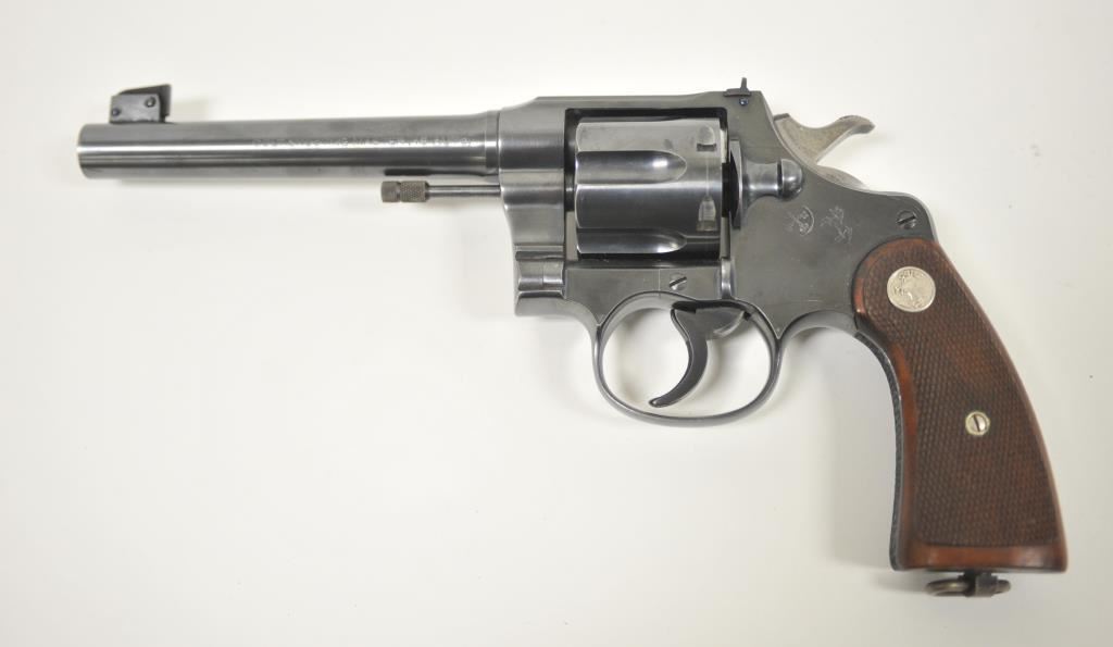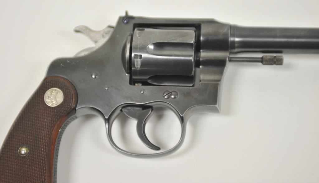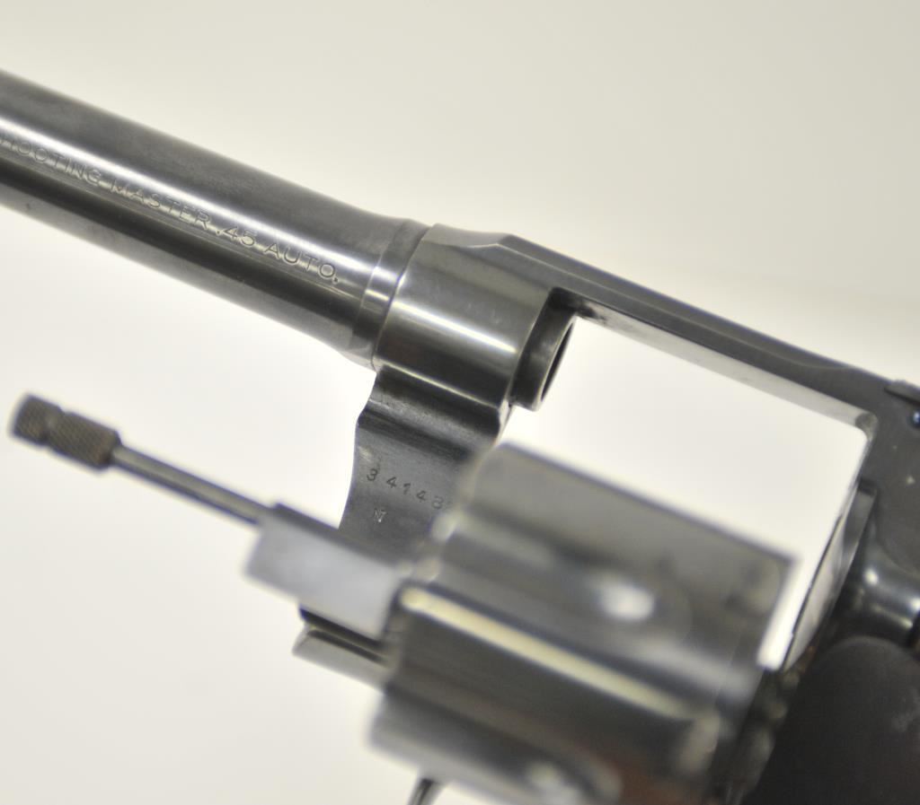 Colt Shooting Master double action prewar revolver in rare .45 Auto caliber with a 6” barrel, blued finish, checkered wood medallion grips, S/N 341482. Prominent collector and authors tag on the pistol reads “Assembled 10-21-1937, shipped 10-25-1937 to Western Hardware, San Diego for old friend Paul Dinant”. It goes on to state the lanyard was specially ordered and Dinant was game warden on Camp Pendleton U.S.M.C. base in San Diego County. The stamp of crossed keys on the side plate is Dinant family crest who hid money for Catholic Church during wars. The revolver retains 95%-98% of its original blue with a minor index line between cylinder stops. Sharp and crisp overall with very good plus grips. The action is tight and the bore is bright. A small amount of slight aging only. Approximately 200 made in this caliber and the shooting master was top of the line for Colt before WWII. Formerly “Bob Murphy” collection who authored a monograph on New Service models under this pseudonym. (C&R/No PPT) Est.: $2500-$5000