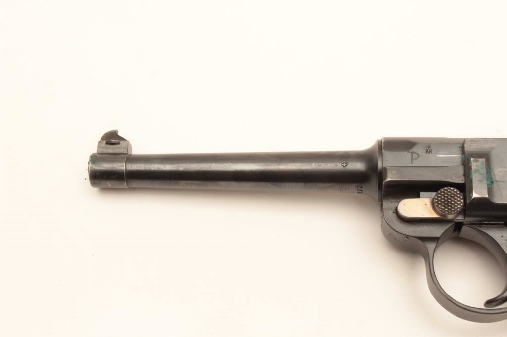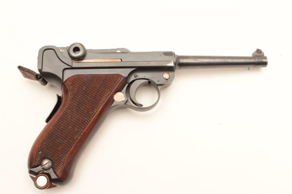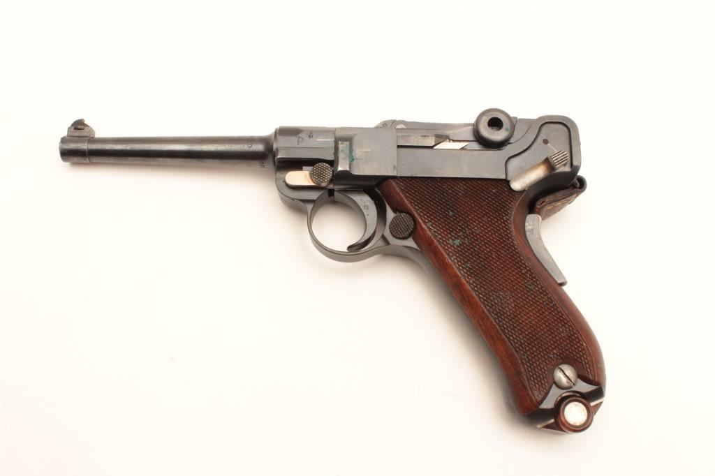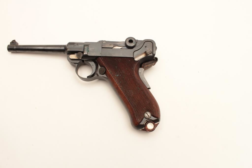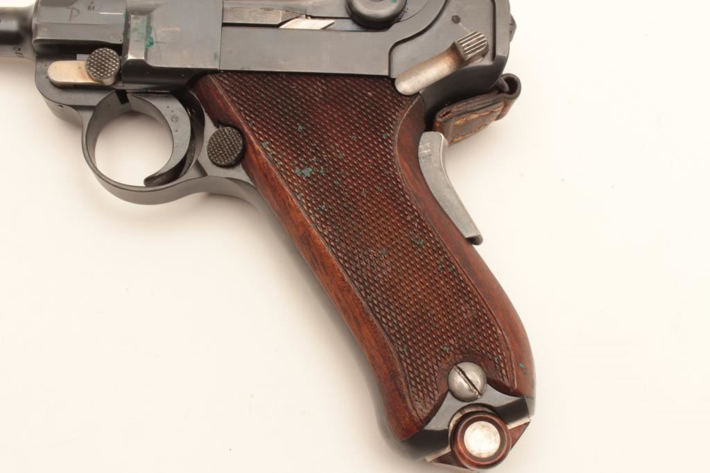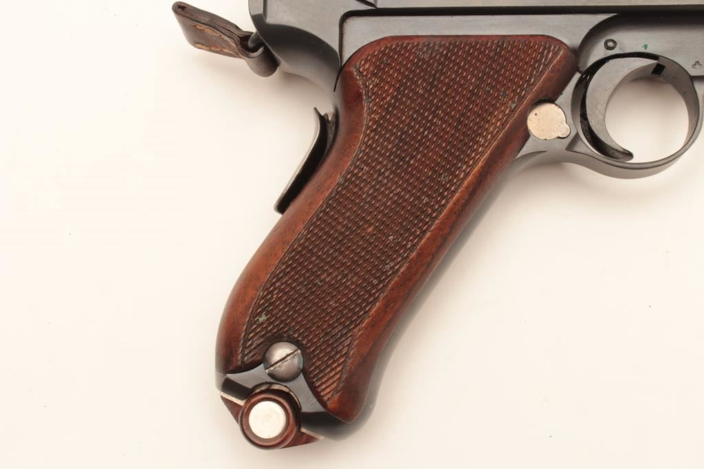 Swiss Model 1906 Bern Luger semi-automatic pistol, 7.65mm caliber, 4.75” barrel, blued finish with visible straw finish to small parts, checkered wood grips, top of toggle marked “Waffenfabrik Bern” under the Geneva cross, S/N 24170; overall very good condition with majority of military finish remaining on metal parts, very good to near fine bore, crisp action, sharp markings and very good grips; accompanied by a flap leather holster with strap and one extra magazine. (C&R/PPT). Est.: $1,200-$2,400.