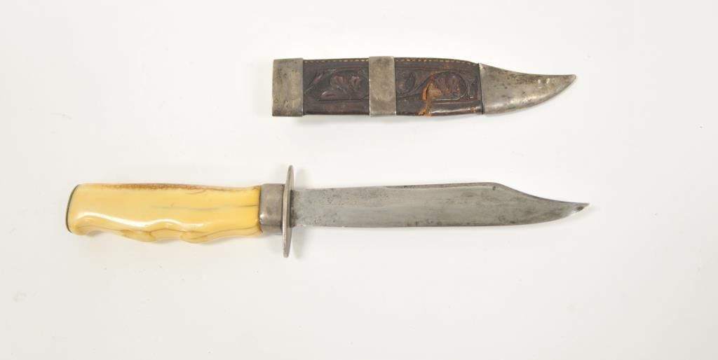 California belt knife with clipped point blade, marine ivory grips, silver mounts, and carved original leather scabbard showing spring loaded belt clip for attachment to belt or sash. Measures 10 ¾” overall with a 6 ¼” narrow blade. Heavy grip with finger grooves. The blade is good with minor natural aging and grip is very good with minor age checking and patina. The grip is authentic to the 19th century. The scabbard is fair to good and would be very good except 1 tear and small loss to the back. Unpolished silver. A very high grade knife and absolutely California made in many experts opinions 1855-1870. Est.: $2000-$4000