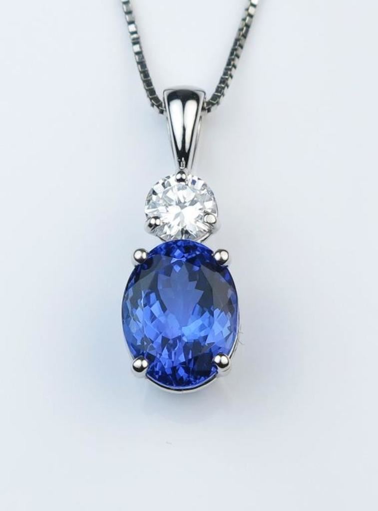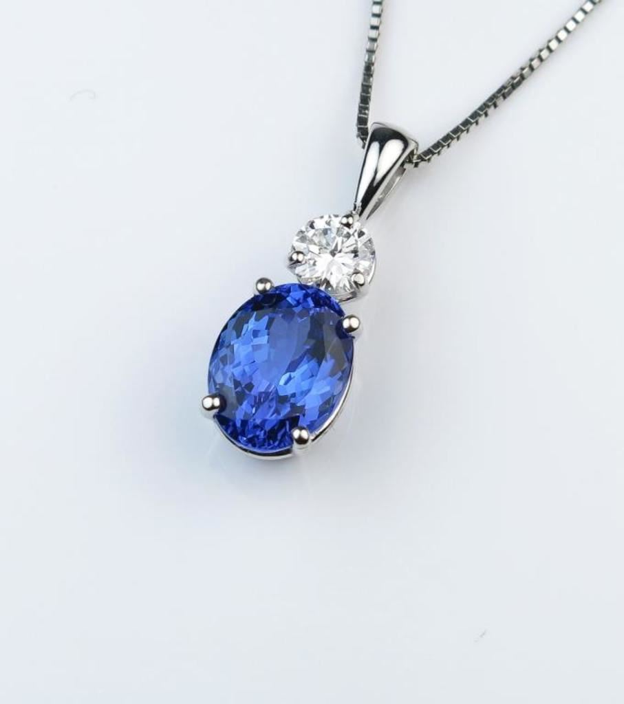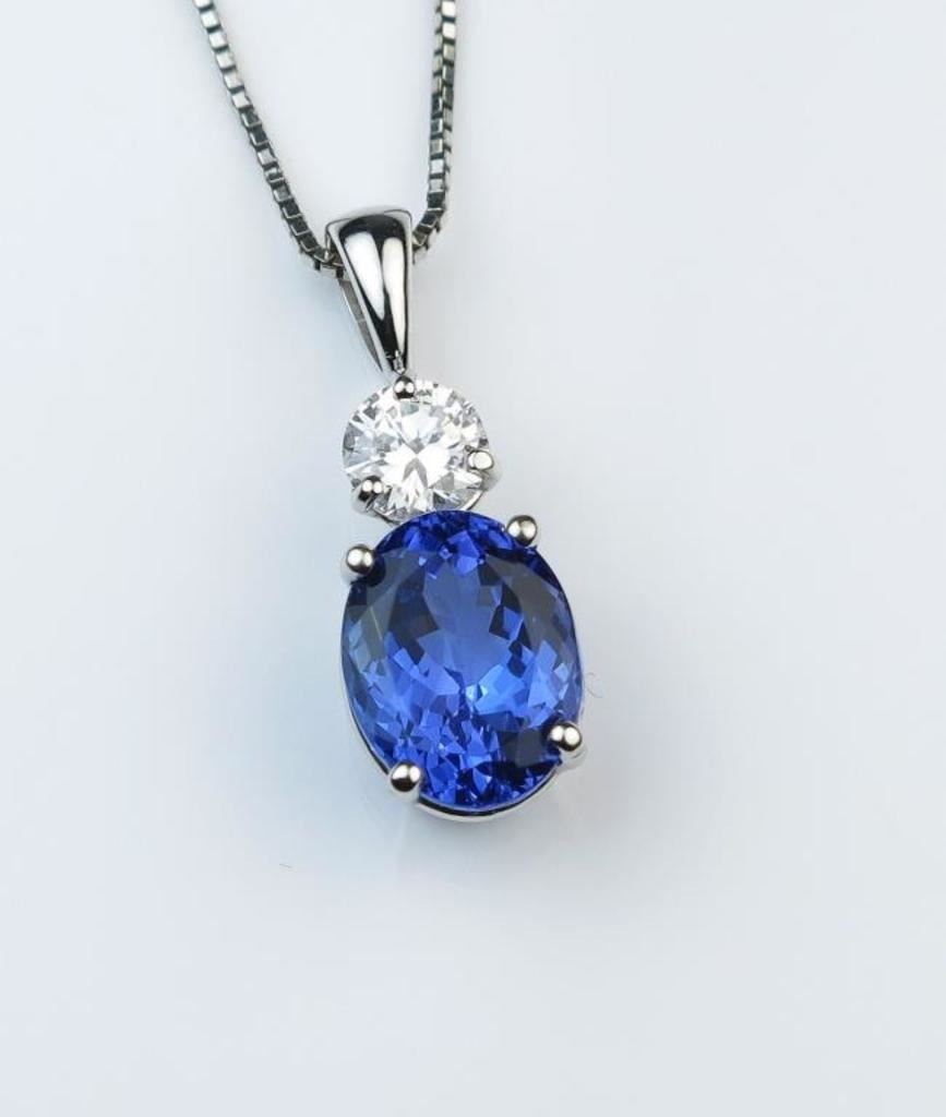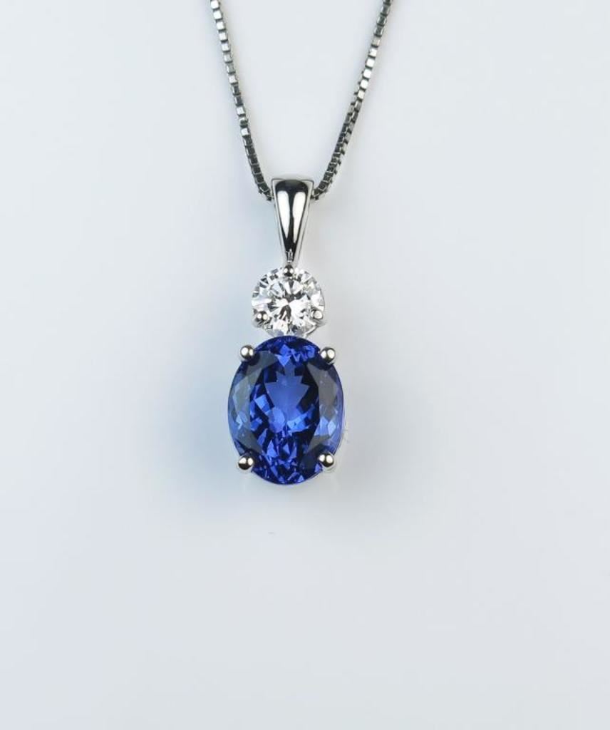 Gorgeous Fine Tanzanite and Diamond Pendant featuring an oval AAA Quality 3.23 carat Tanzanite with vivid blue/violet color accented with 0.40 carat “IDEAL” cut Diamond with F color and VS clarity set in 14 karat white gold. Retail $6,000-$8,000 Estimates $3,000-$4,000