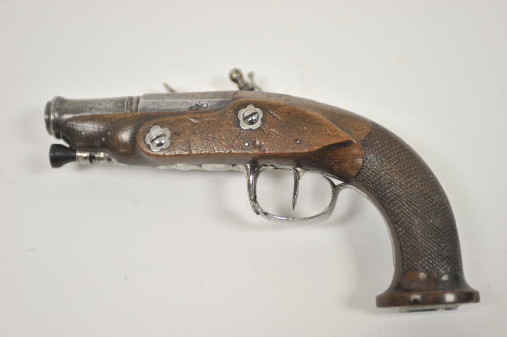Pair of Napoleonic era French proofed (A.C.) flintlock pistols with cannon barrels in very good condition. Measures 7 ¾” overall with 3 ¼” two stage barrel of approximately .46 smoothbore with lovely turned muzzles. Stylistic square butts and checkered stocks. Faint traces of blue and gilt on the barrels. Very good overall with correct flintlock hammers, frizzens and small parts. Working with correct style ramrods. A very nice set of type carried 1790-1815. (Antique) Est.: $1250-$2500