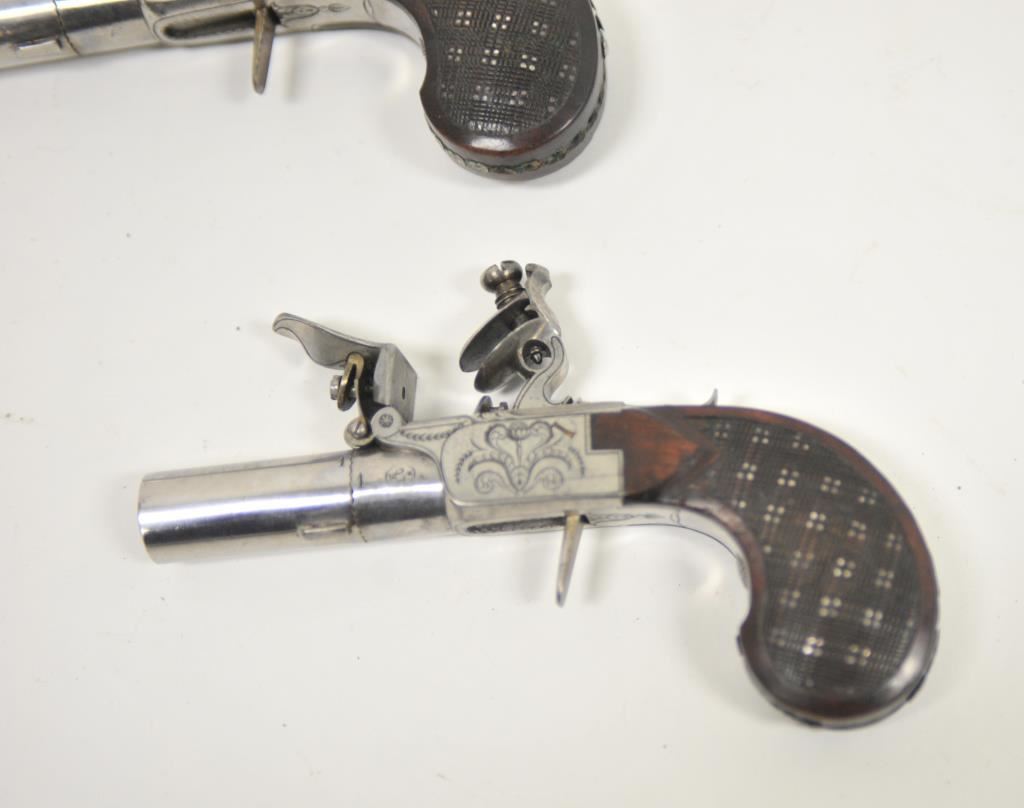 Classic pair of French style flintlock Pocket pistols of Napoleonic era 1800-1815. Measures 6” overall with 1 5/8” barrel of .52 caliber smoothbore and ‘ELG” (Belgium) proof. Original bright polished finish with sharp engraving and correct flintlock parts. Checkered and pinned grips with silver floral overlay down backstrap (70% intact with 30% lost). The action is crisp. #1 and #2 are both very good plus to almost fine condition for their age and beautiful empire styling. (Antique) Est.: $1000-$2000