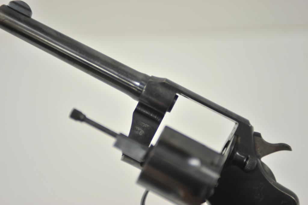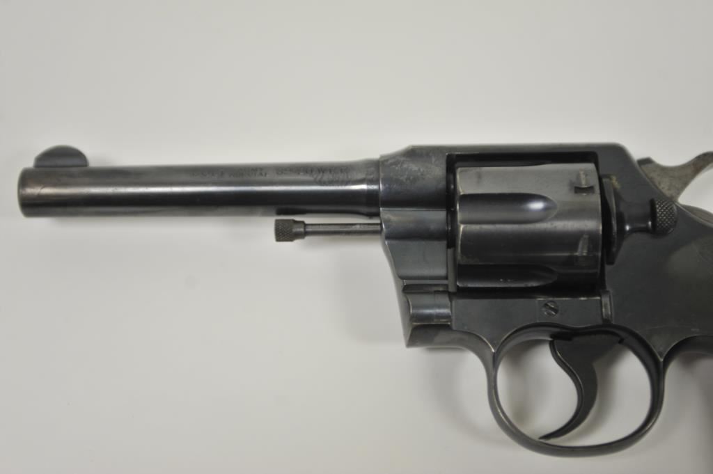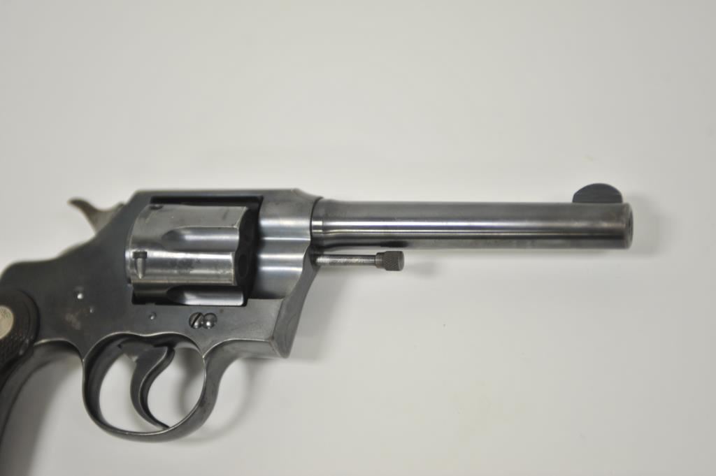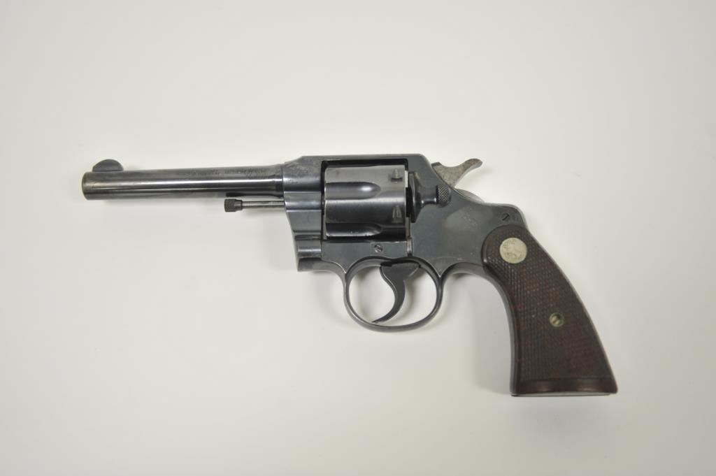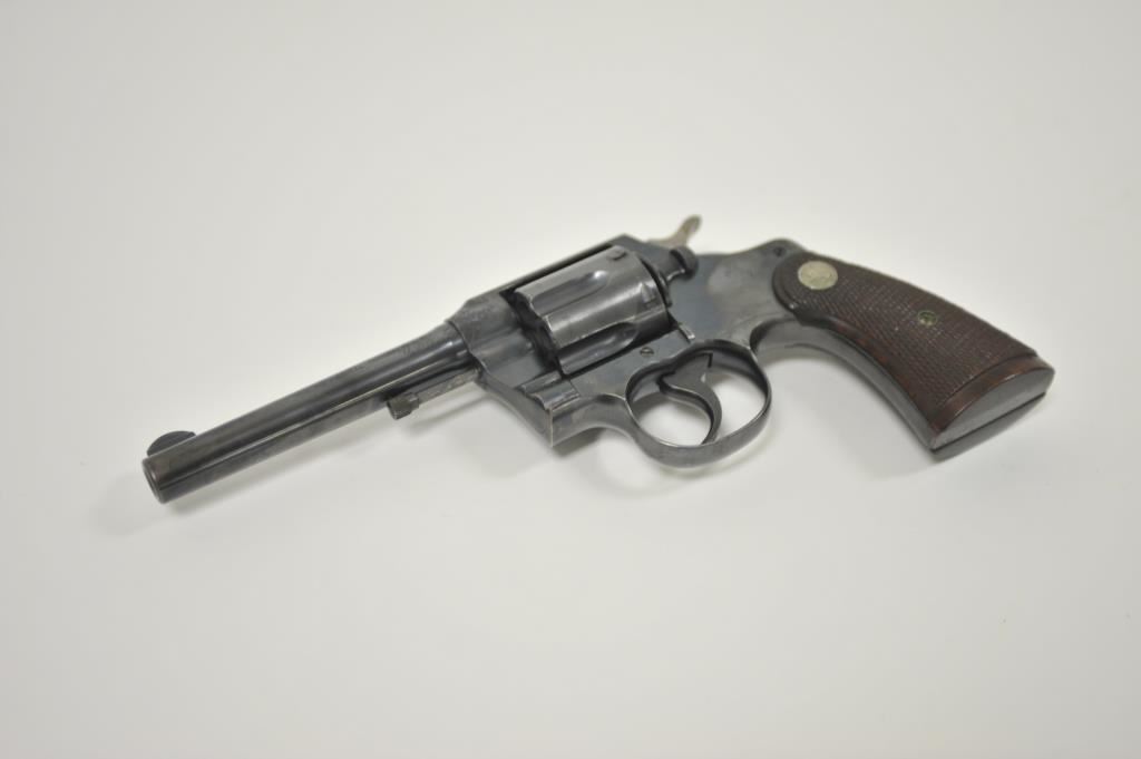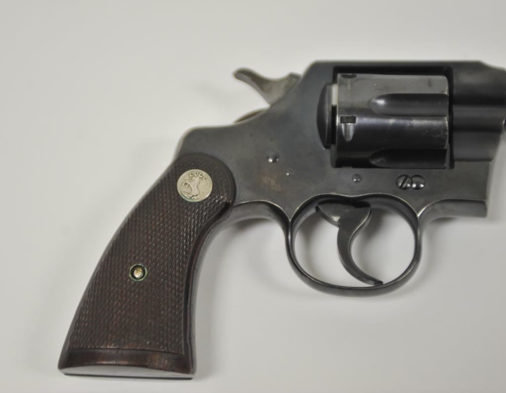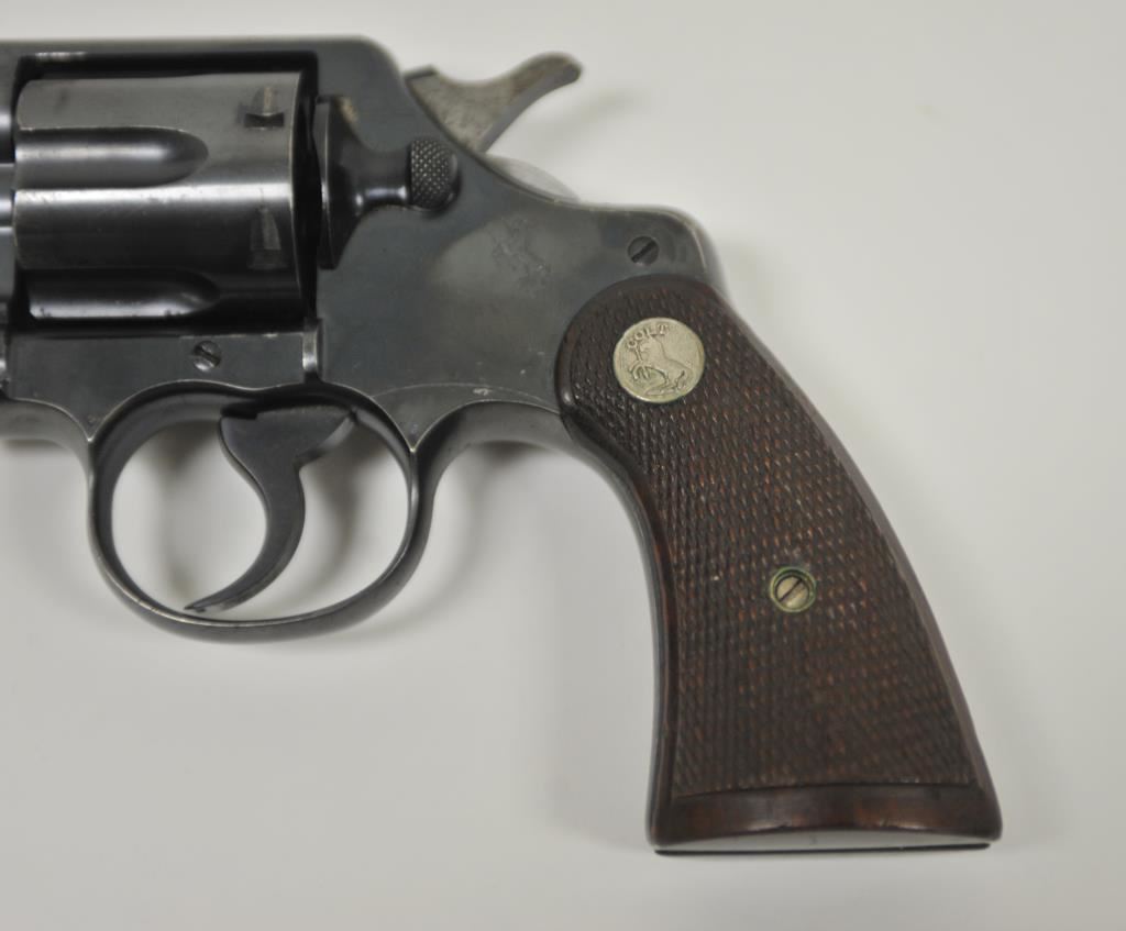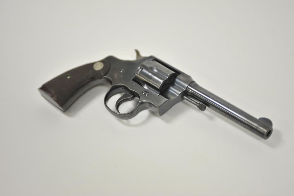 Colt Army Special revolver, .32-20 WCF caliber, Serial #496775. The pistol is in very good overall condition with a 5” barrel. The pistol retains the majority of its blue finish with light wear at the muzzle, a faint drag line on the cylinder and a crisp Rampant Colt emblem at the rear of the frame. The checkered wood medallion grips are in good condition with sharp checkering and a small chip off the base of the right panel. The bore is good, the action is crisp and markings are sharp. Est.: $400-$800. (C+R).