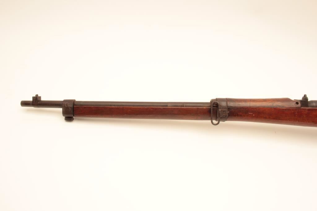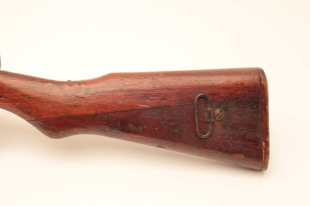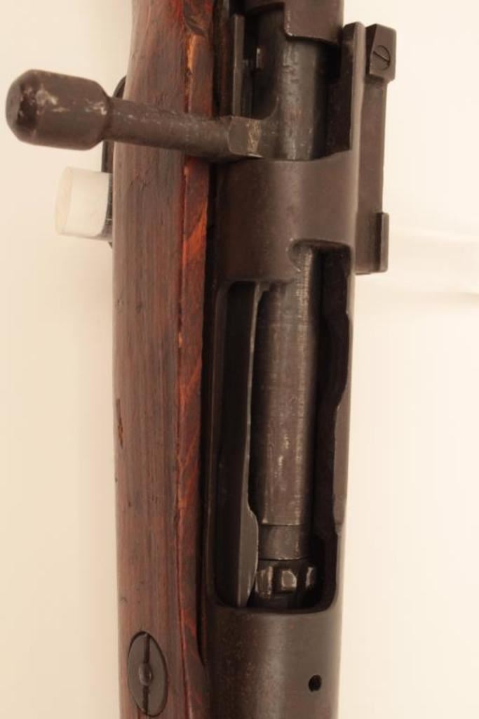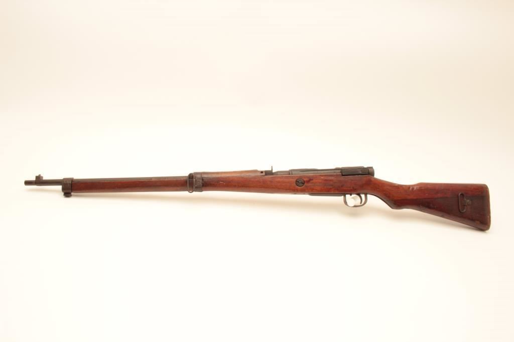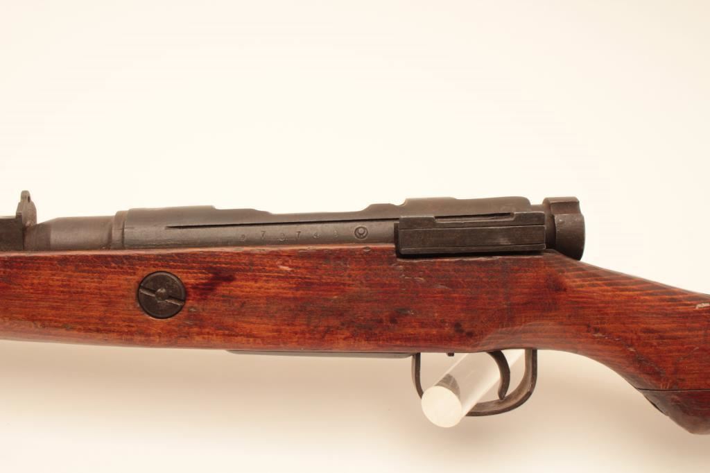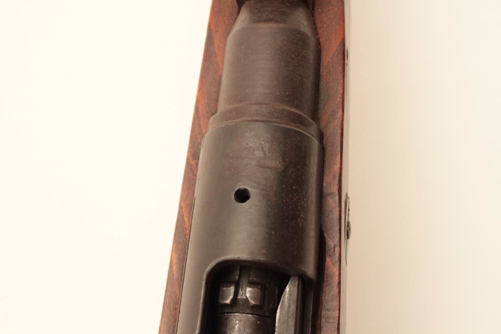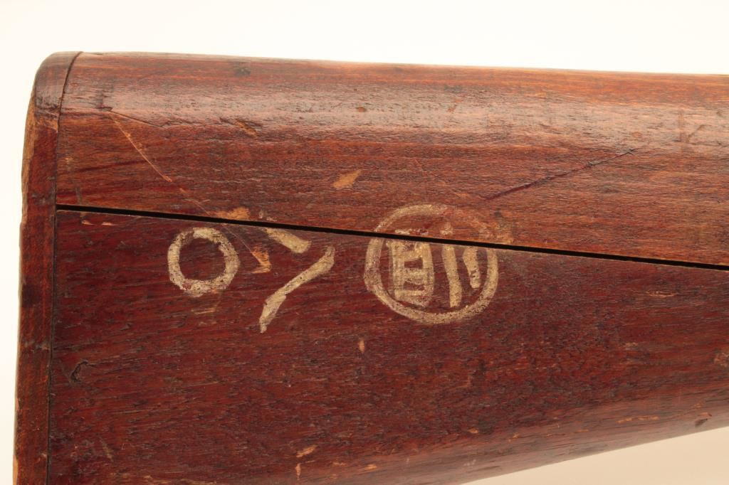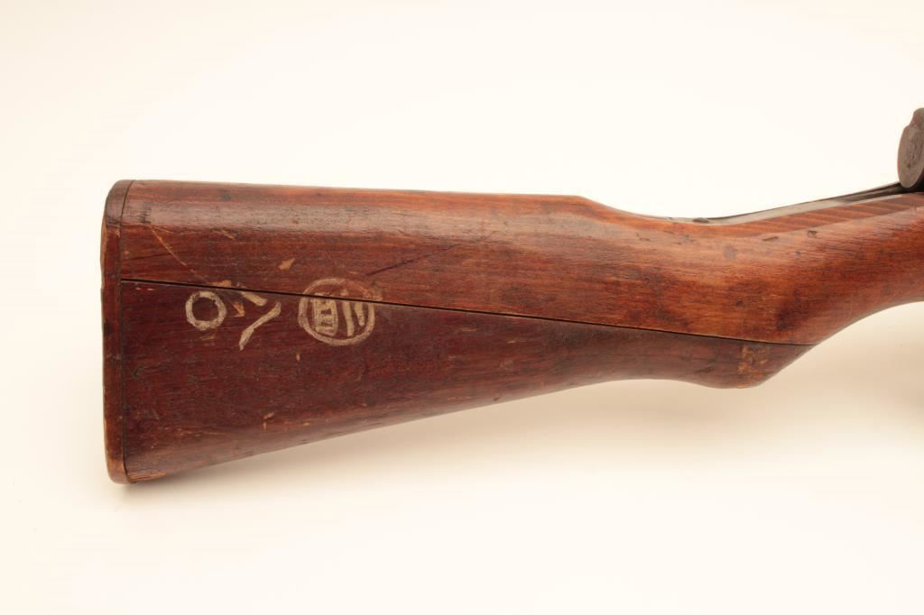 Arisaka Type 99 Last Ditch bolt action rifle, 7.7 caliber, Serial #70740. The rifle is in fair overall condition with a 26” barrel. The metal surfaces have gone to a uniform brown patina with light surface rust in areas. The front and rear sights are the crude style associated with Last Ditch rifles, the mum has been ground off and the rear of the bolt lacks the knurled texture of earlier rifles. The smooth wood stock is in fair condition showing heavy use with dents and gouges. There are Japanese characters painted on the right side of the butt which ends with a crude wooden butt plate. The bore is poor, showing roughness and pitting. The action functions and the markings are legible. Est.: $250-$500. (C+R).