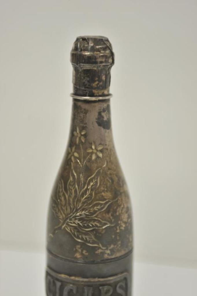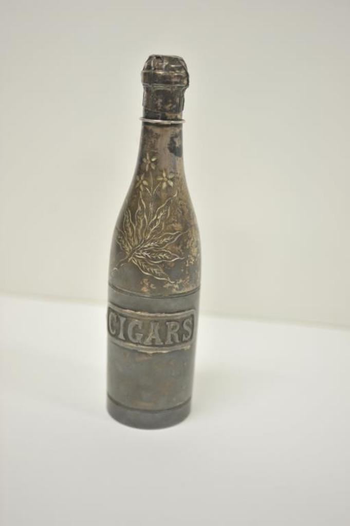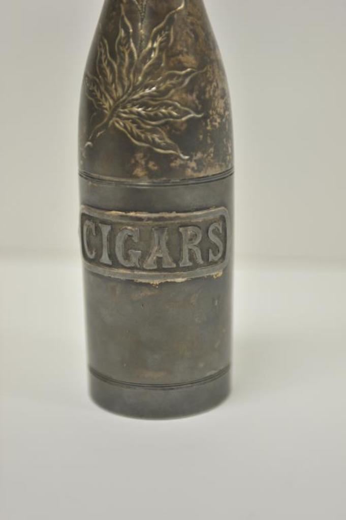 Pewter bottle with cap that unscrews and marked “CIGARS”; approximately 10.5” in height; base is marked “Fairpoint Mfg. Co./New Bedford, Mass./Quadruple Plate”. Est.: $100-$200.