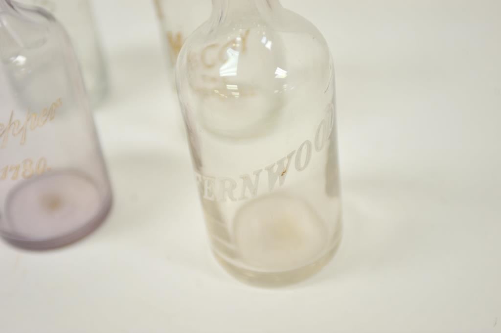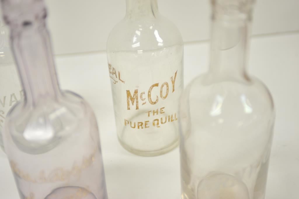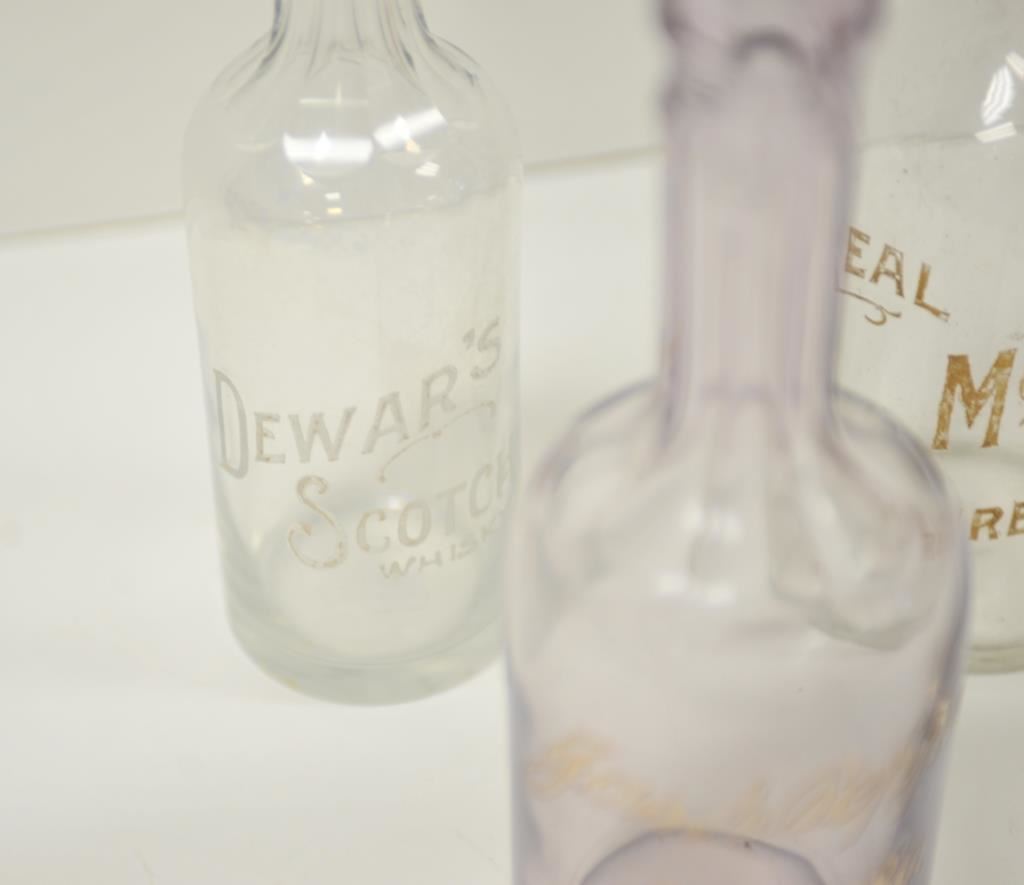 Lot of 4 glass back bar bottles; 1.) “Dewar’s Scotch Whisky” marked; 2.) “Fernwood” marked; 3.) “Jas & Pepper Est. 1780” marked and 4.) “Real McCoy the Pure Quill” marked; 19th to 20th Century. Est.: $150-$300.