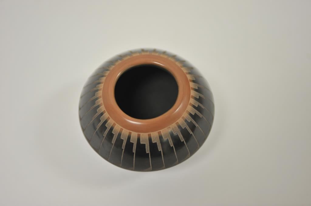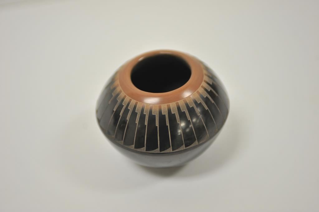 Small Santa Clara pot, finely decorated, approximately 3.5” in height and 5” diameter at widest point; signed on bottom “Candelaria Suazo/Santa Clara Pueblo/ ‘93”. Est.: $100-$200.