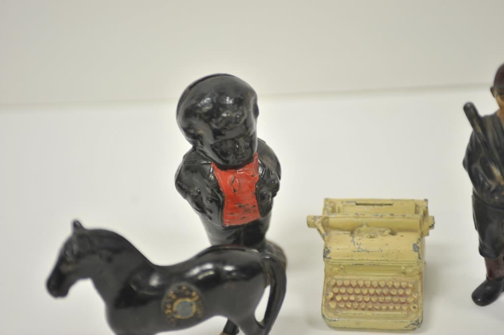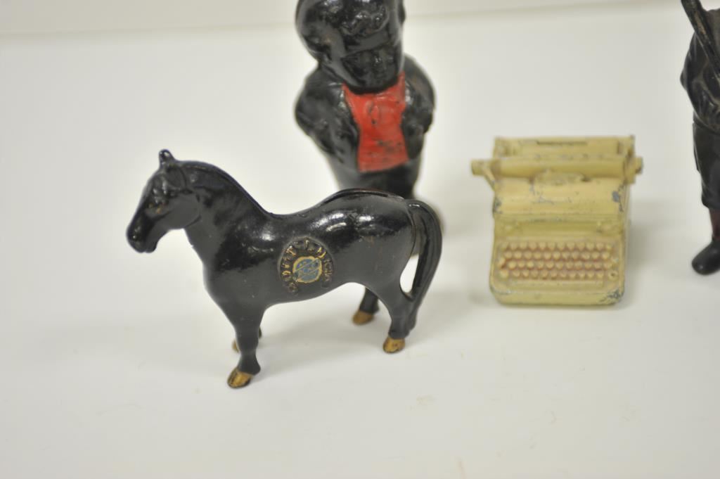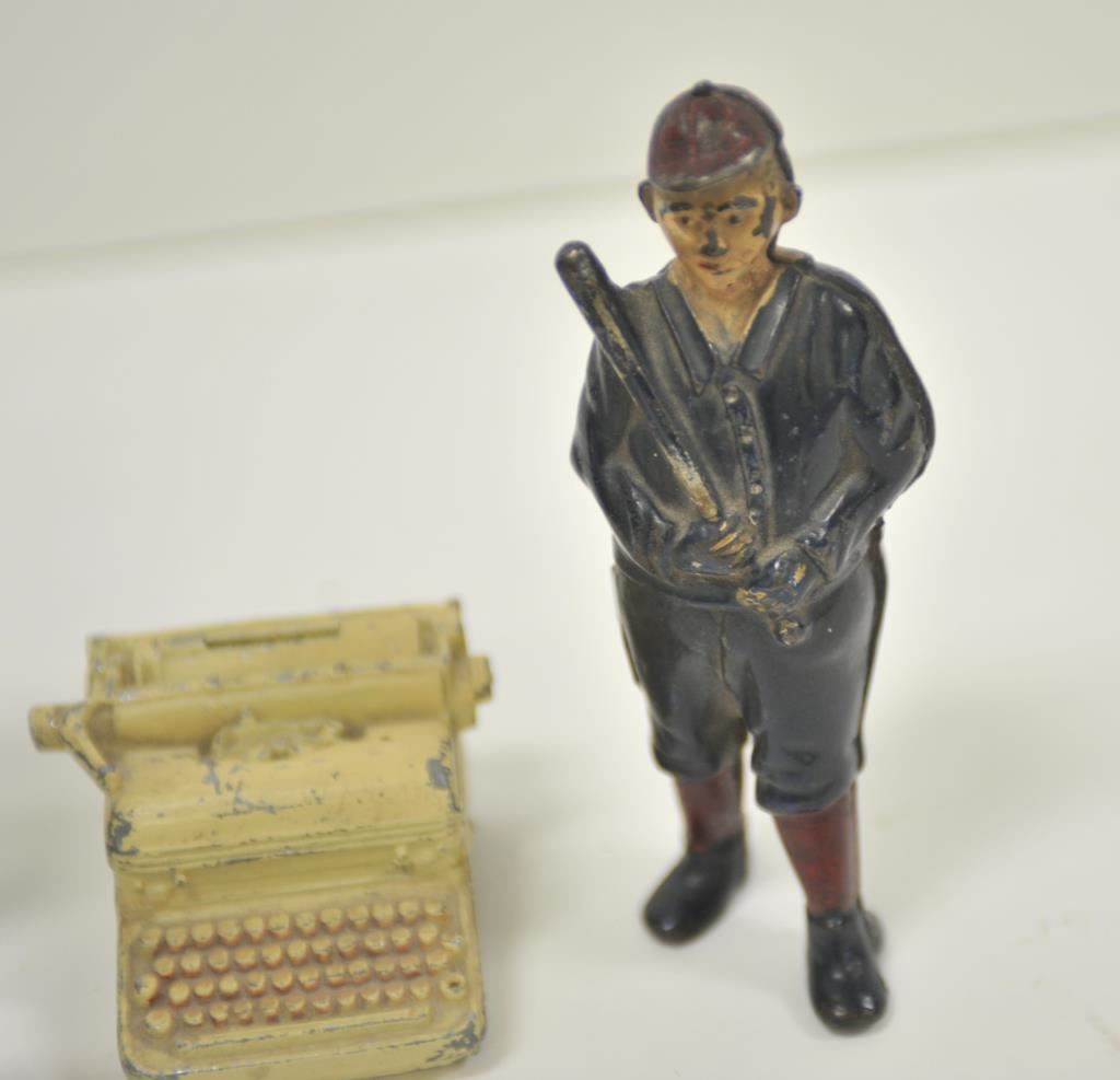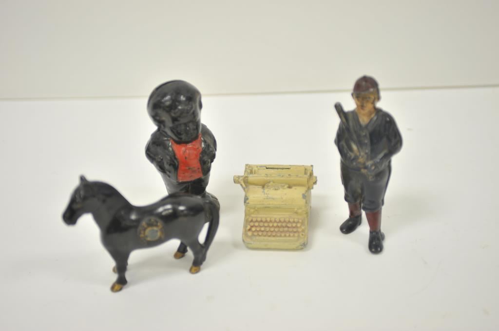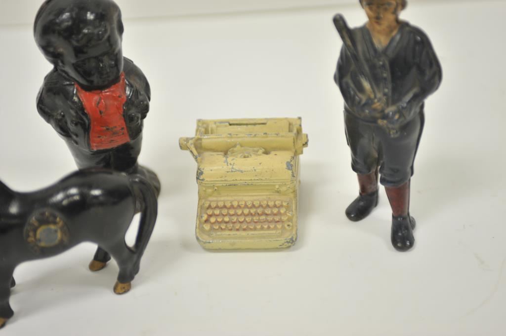 Lot of 4 old iron banks including a baseball player (approx. 6” in height); a small boy (approx. 5.5” in height); a horse (approx. 4.5” in height) and a typewriter (approx. 1.75” in height); all in good condition with majority of original paint remaining. Est.: $150-$300.