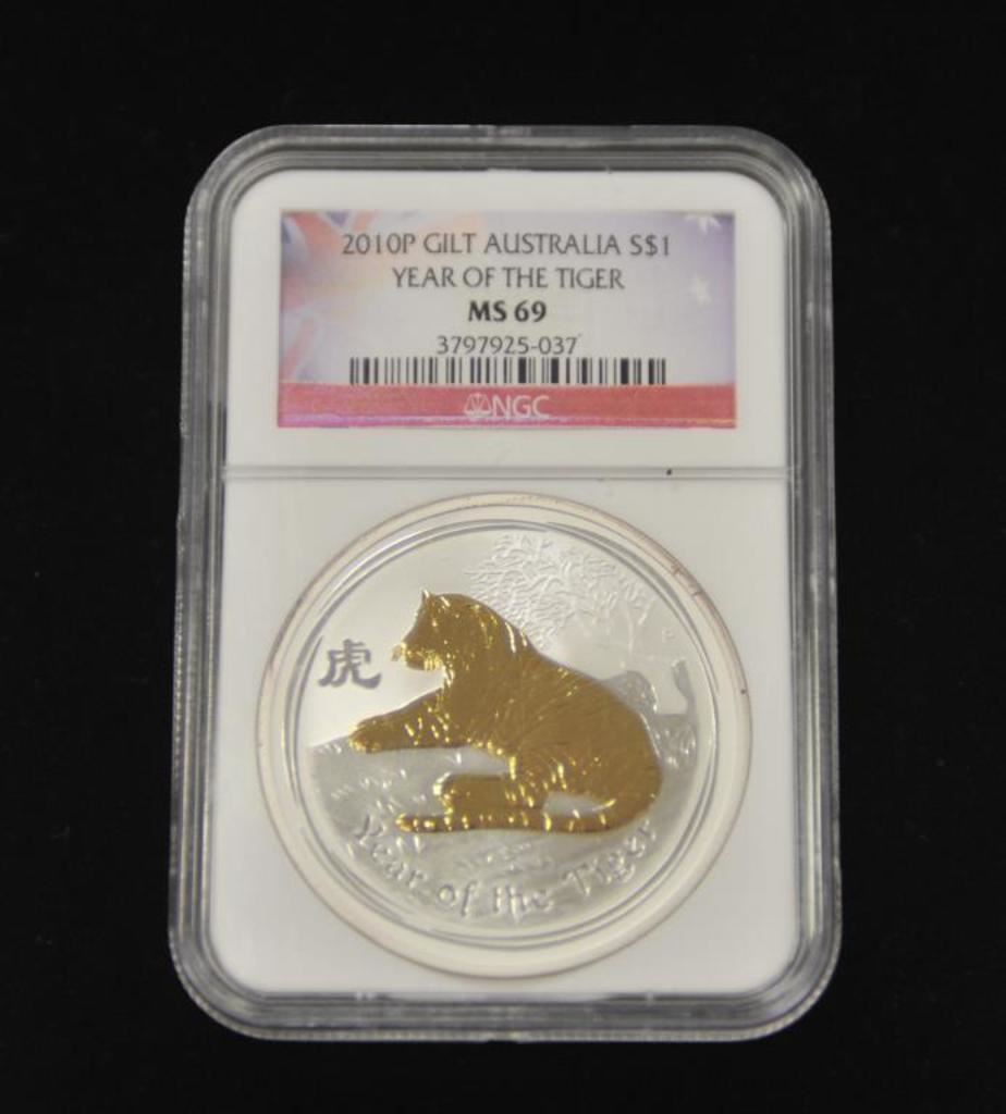 Australian 2010-P gilt one dollar Year of the Tiger Commemorative silver coin, NGC graded MS69 in holder. Est.: $75-$125.