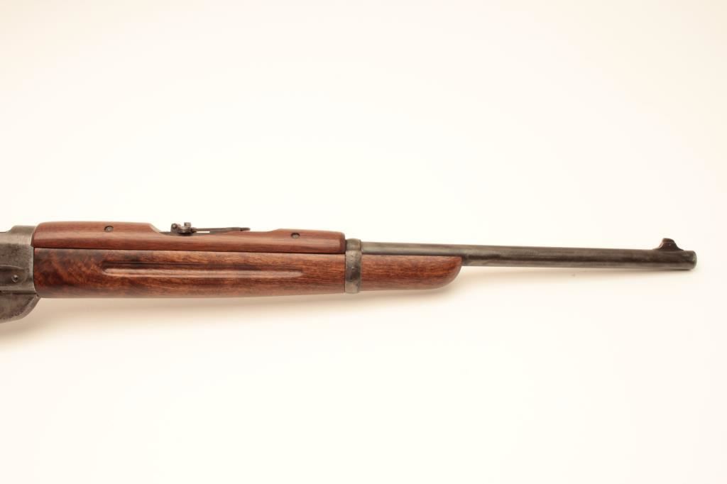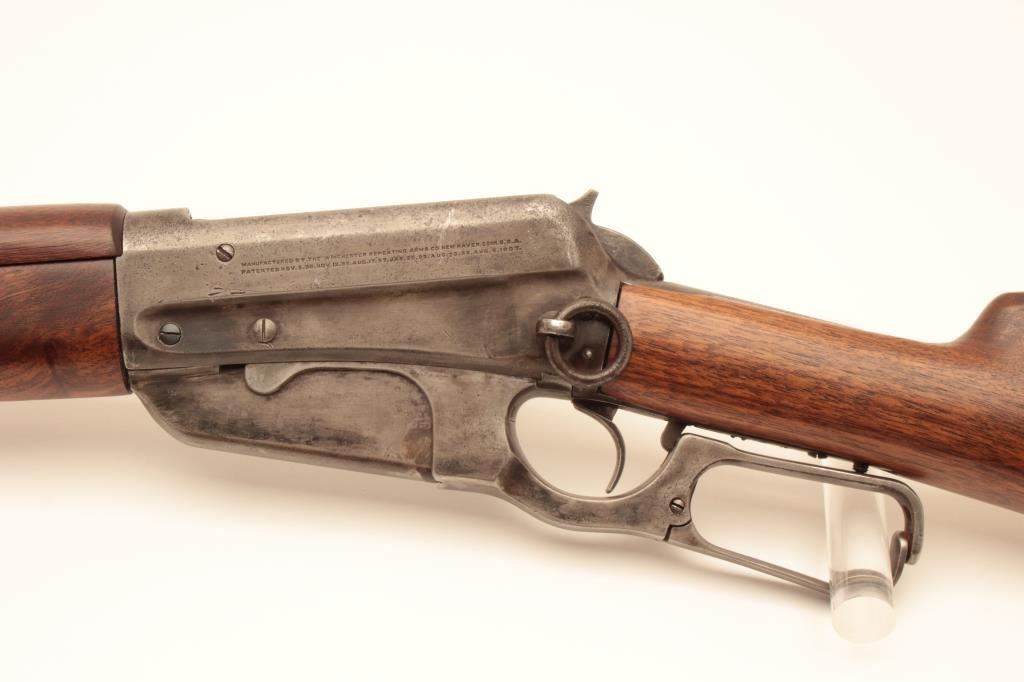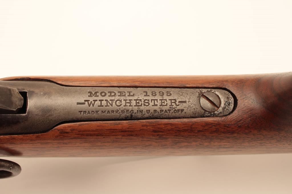 Winchester Model 1895 lever action saddle ring carbine, .30 Army caliber, Serial #89856. The carbine is in good overall condition with a 22” barrel with a ramped blade front and military style tangent rear sights. The barrel retains a significant amount of muted blue finish with the remainder going to a grey patina. The receiver shows traces of blue finish in the protected areas with the majority going to grey patina with some light surface erosion and pinprick pitting evident. The hammer has been bobbed during the period of use and the saddle ring is retained. The smooth wood stocks are in very good condition with small mars and compressions. The butt stock ends with a smooth steel butt plate with trap. The bore is only fair, the action crisp and markings are sharp. Est.: $500-$1,000. (C+R).