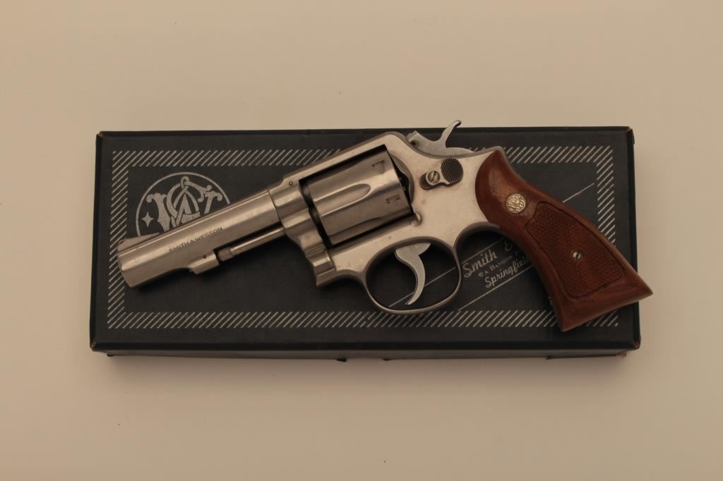 Smith & Wesson Model 65-1 DA revolver, .357 Magnum caliber, 4” barrel, stainless, checkered wood medallion grips, S/N 1D11256; like new condition with instructions, cleaning tool and two piece factory cardboard box with end label numbered to this gun. (Modern/NO CAL. SALE). Est.: $500-$1,000.