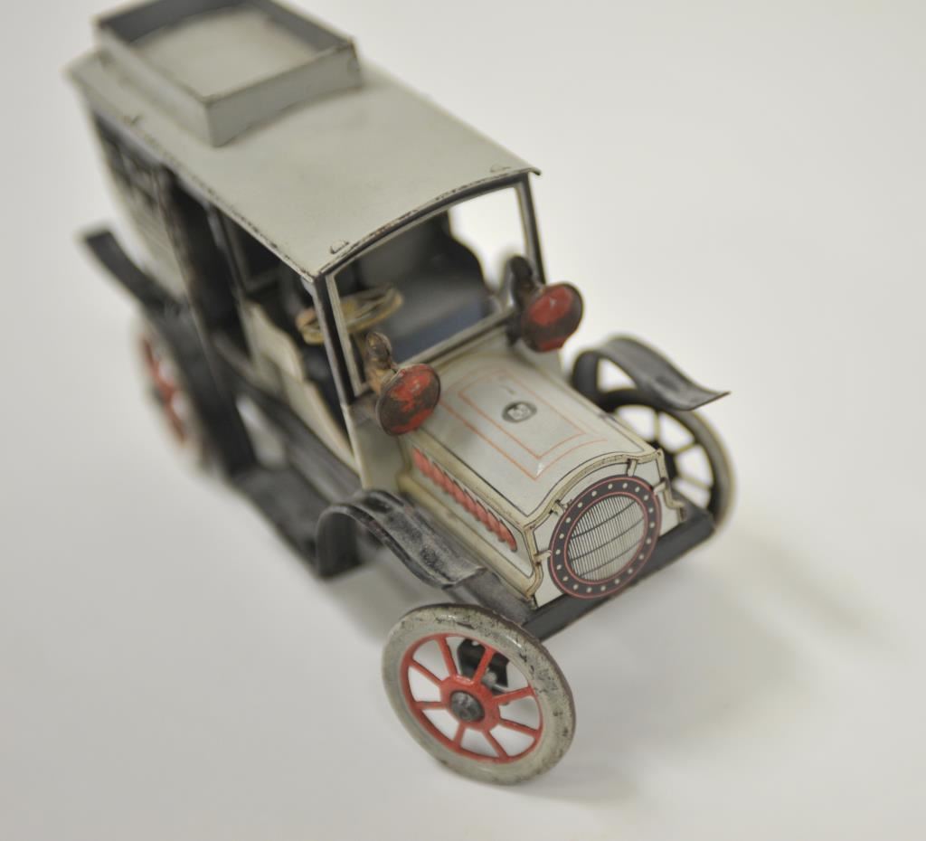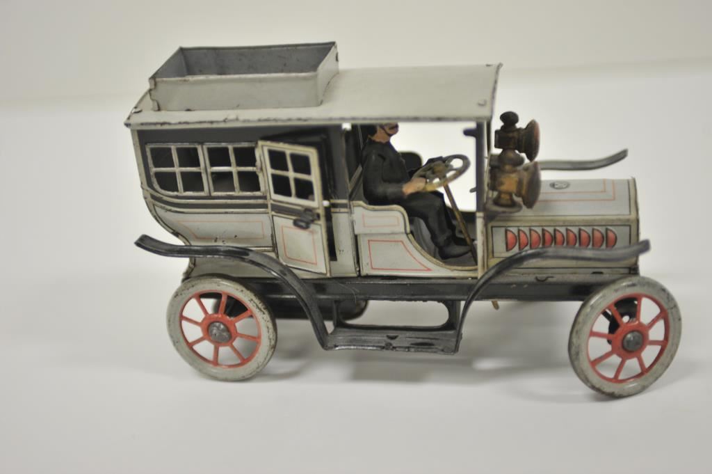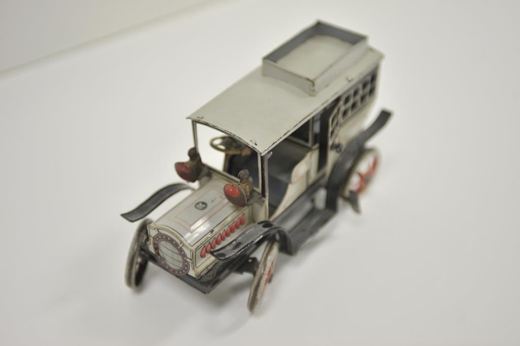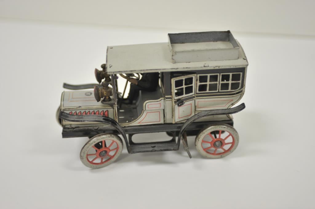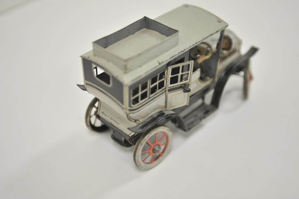 Antique tin wind-up toy passenger truck with driver, approximately 8” long x 3” wide by 4.5” in height; majority of original paint remains; German-made. Est.: $300-$600.